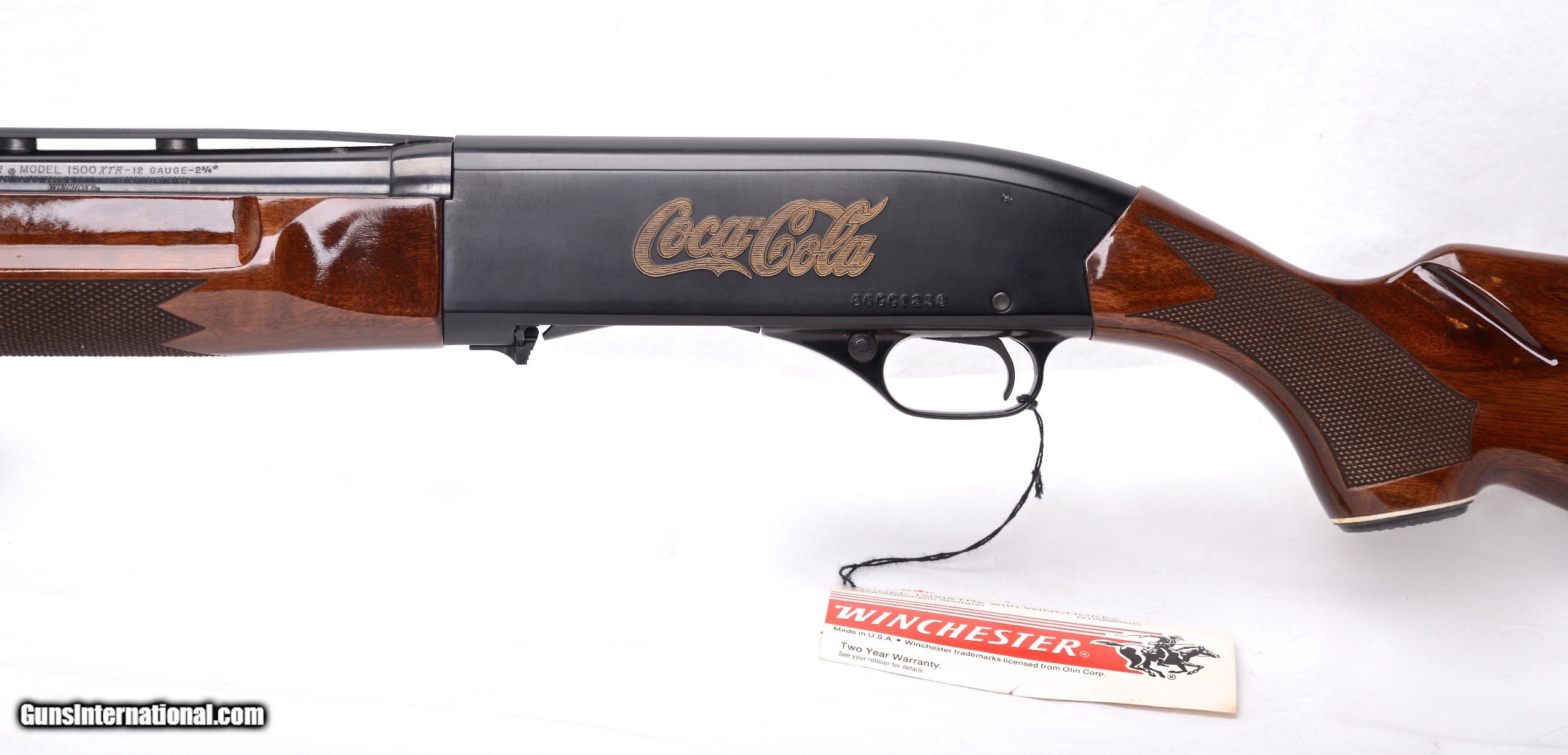 Description: SALE PENDING Matching Winchester Model 94 lever action rifle, .30-30 and Winchester Model 1500 semi auto shotgun, 12 gauge Coca Cola commemoratives. These commemoratives were never offered through normal retail or wholesale distribution; they were only offered through Coca Cola. Because of this they mostly went to Coke distributors and very few made it to Winchester collectors making them very desirable. Although the edition was supposed to be 2500 of each but the total sets made was around 2000; a very low production compared to most commemoratives! Both guns remain absolutely New In theirBoxes. $2,650.00 for the pair SN: 1238 of 2500 & 86CC 1238 SOLD |