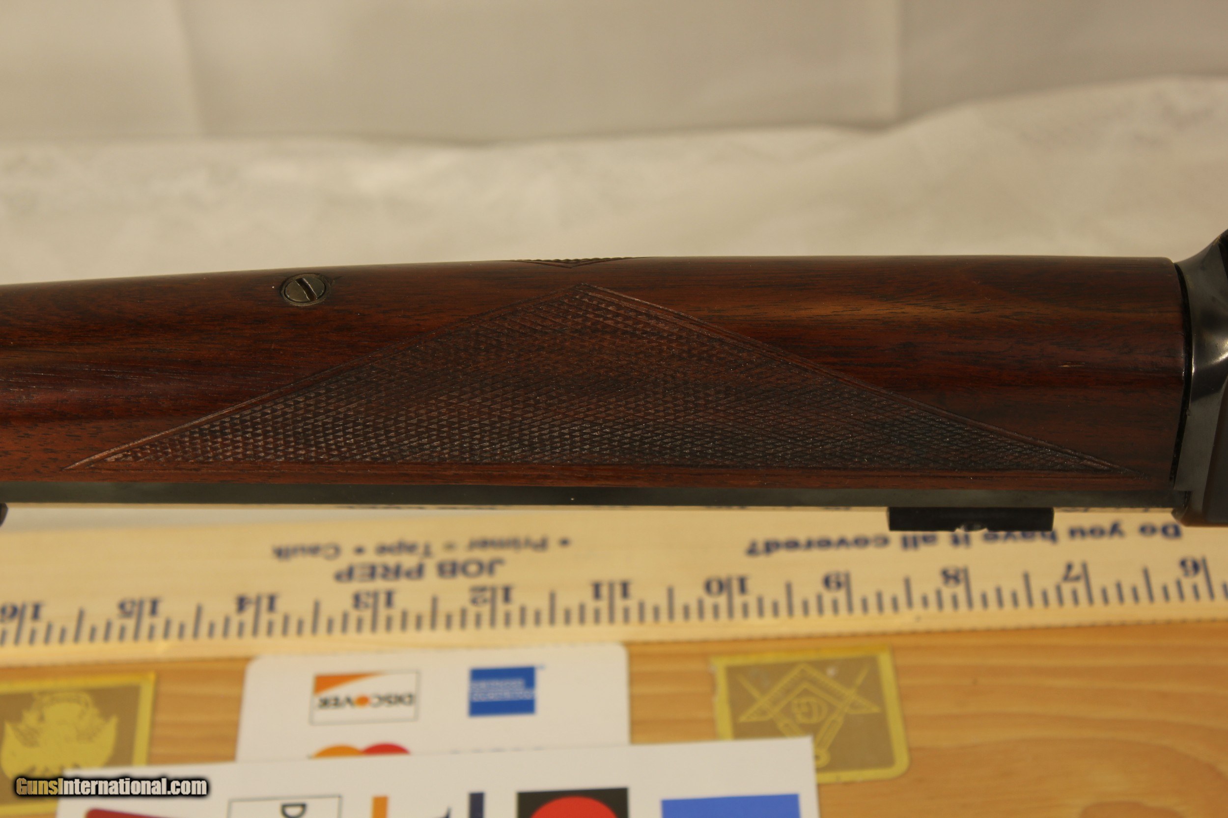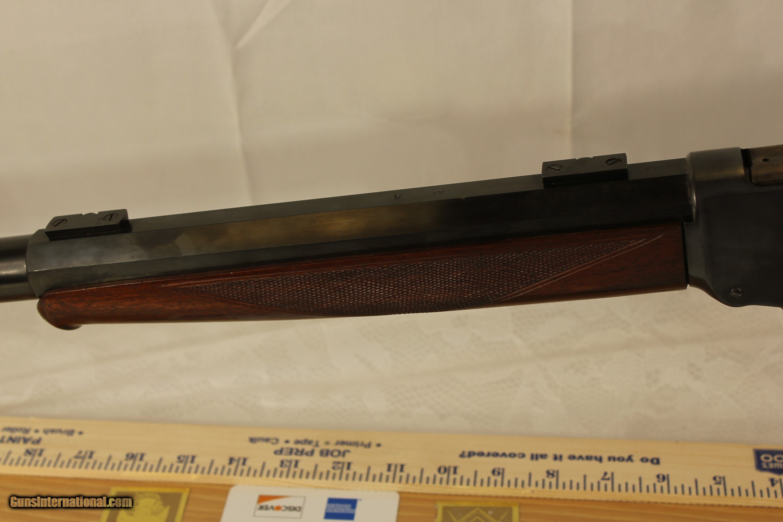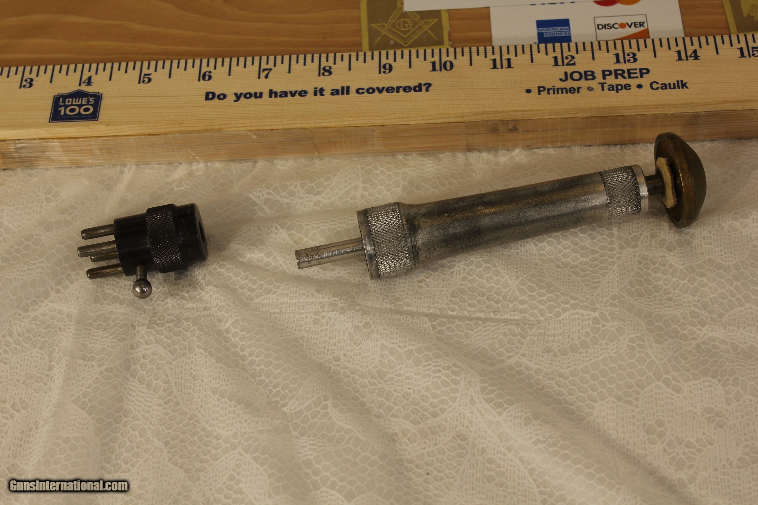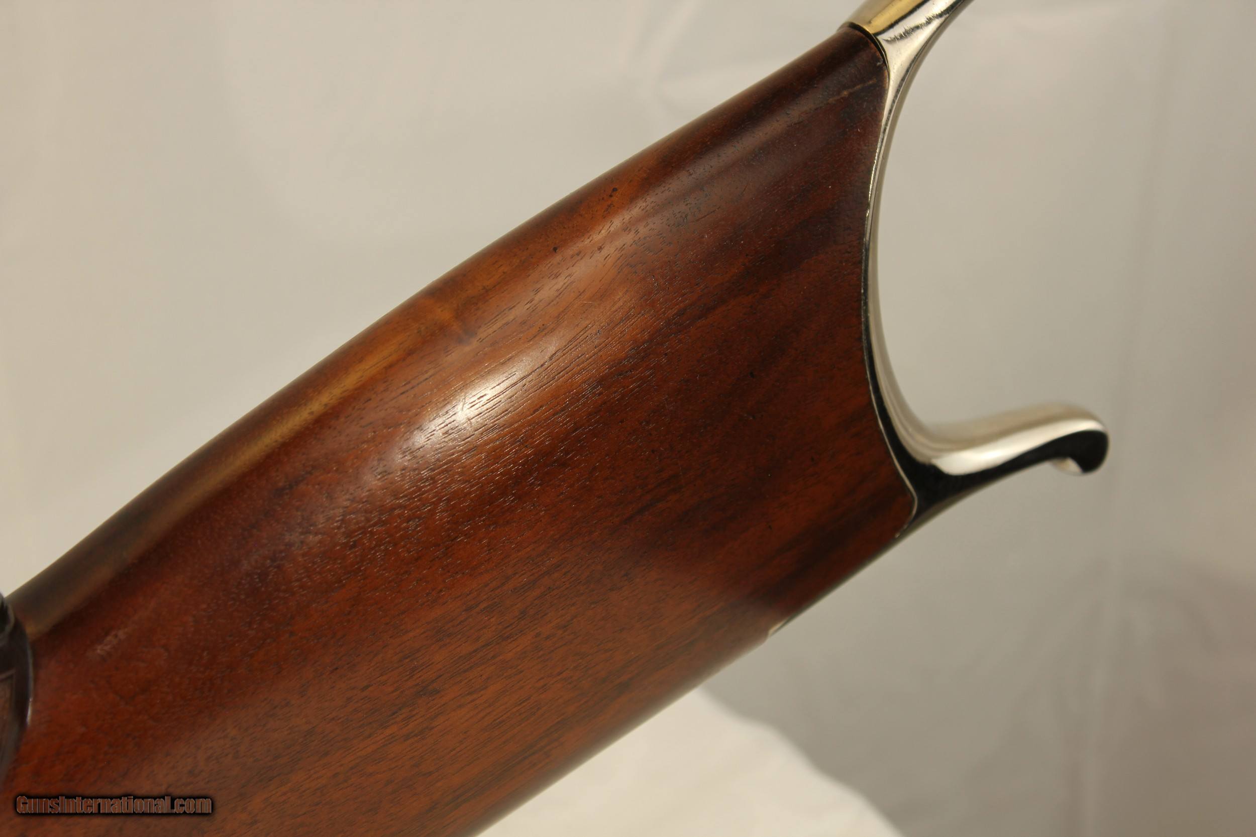Description: This rifle was converted to an offhand Deluxe style target rifle. It has double set triggers and target scope mount bases on the barrel. It is 32-40 Caliber. It is fitted with a fully adjustable wrist sight and a hood front sight and has a 28 inch barrel with a false muzzle and bullet starter. It weighs 9 1/2 pounds. This type of target rifle used a cartridge that was loaded with the powder charge with a wad like a blank. You than loaded the bullet from the muzzle like a muzzle loader using the bullet starter. Then the bullet was pushed down the barrel to the cartridge. It was thought that the bullet having already being engraved by the rifling improved the accuracy. This method was used in the late 1800's through about WWI. The action dates to 1901. The rate of twist is 1-15 inches. C&R OK $60.00 shipping via Priority Mail SOLD Curio/Relic: Yes |
