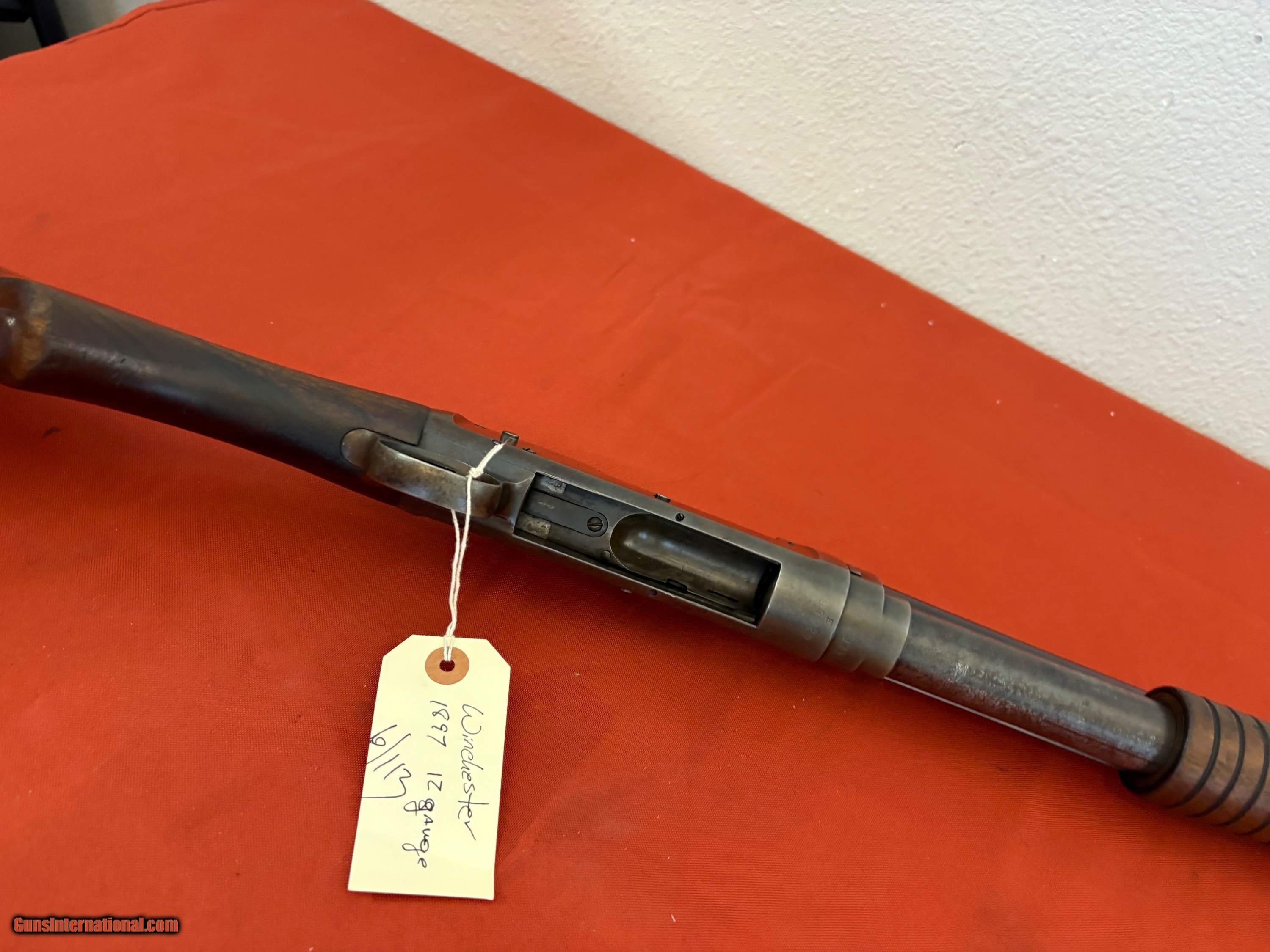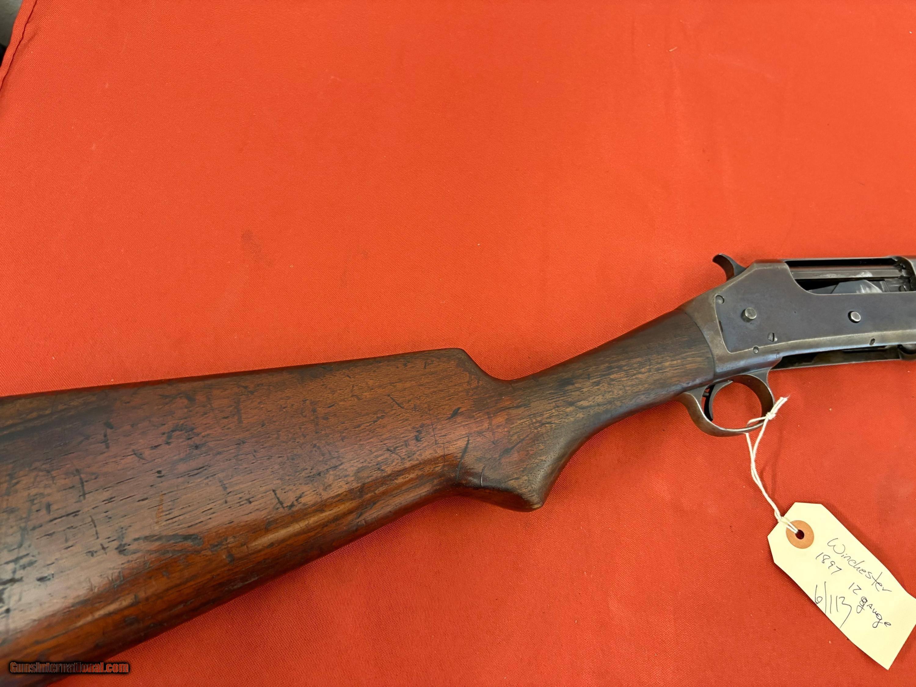 WINCHESTER MODEL 1897 P[UMP ACTION TAKEDOWN SHOTGUN . SER# 697925 ( MATCHING ) 12 GA, 28 INCH BARREL WITH A VERY NICE BRIGHT BORE, MODIFIED CHOKE. TIGHT CRISP ACTION THAT FUNCTIONS FINE. WOOD IS ALL SOLID WITH A COUPLE GRAIN LINES NEAR THE RECEIVER.