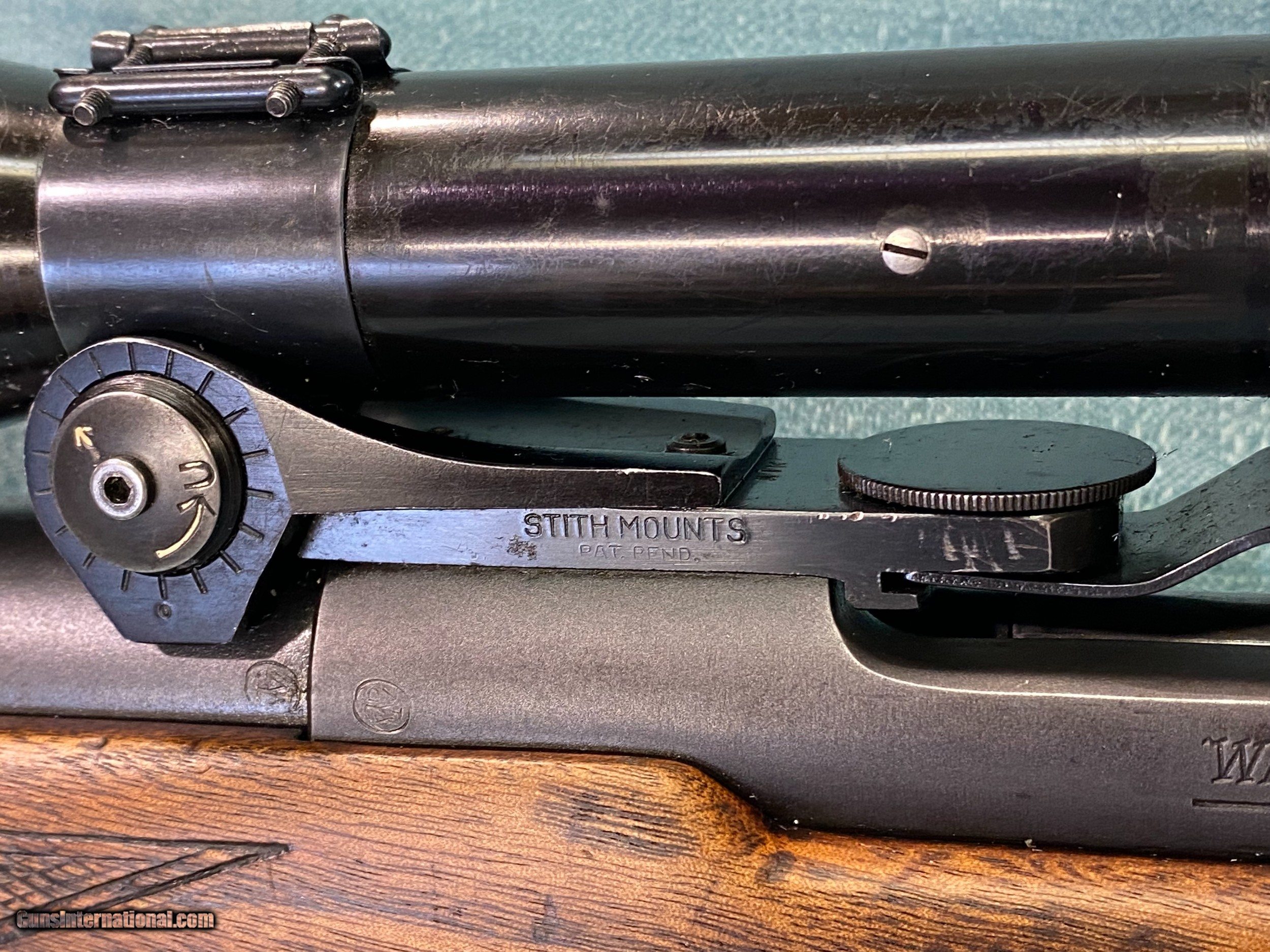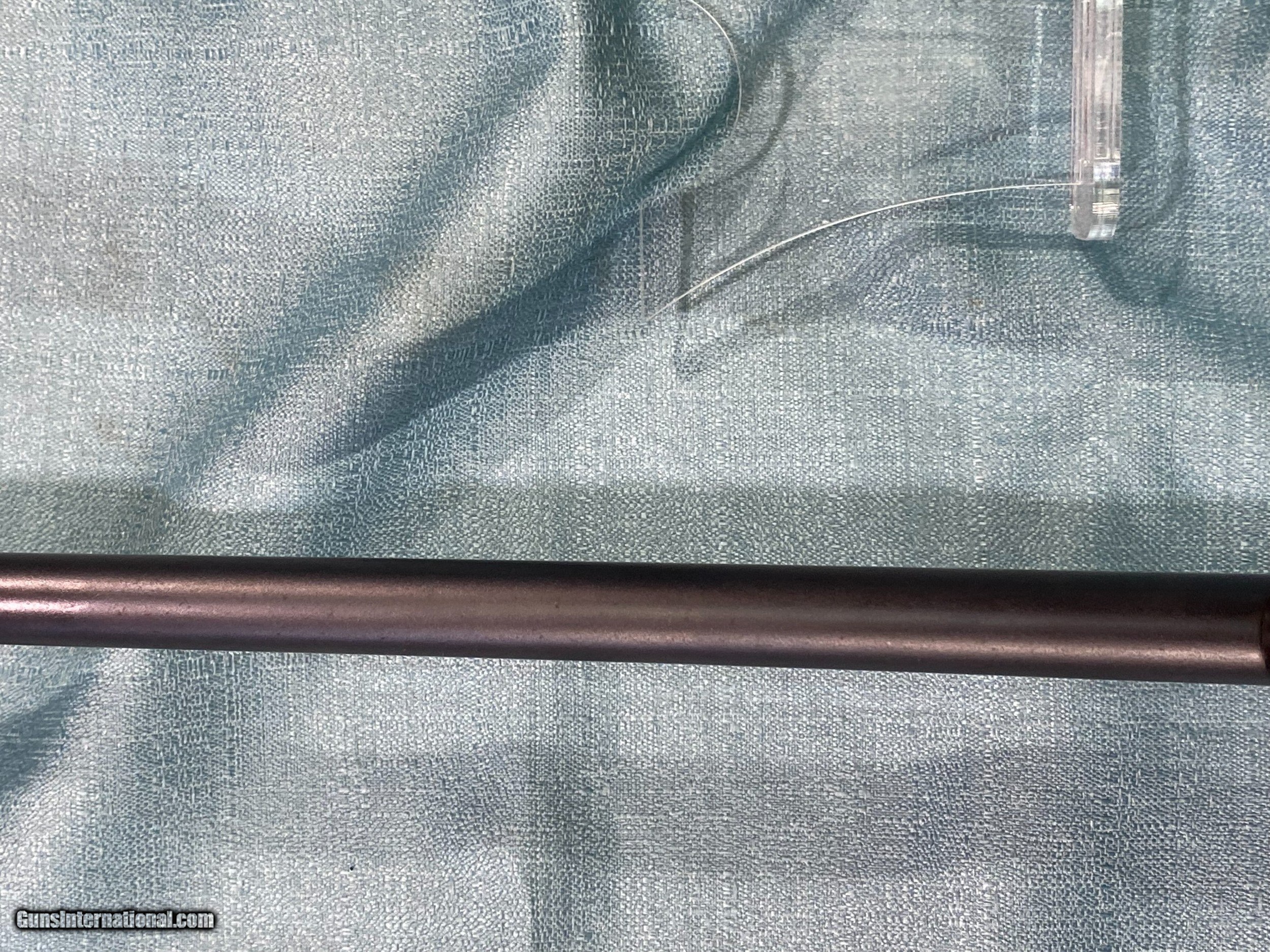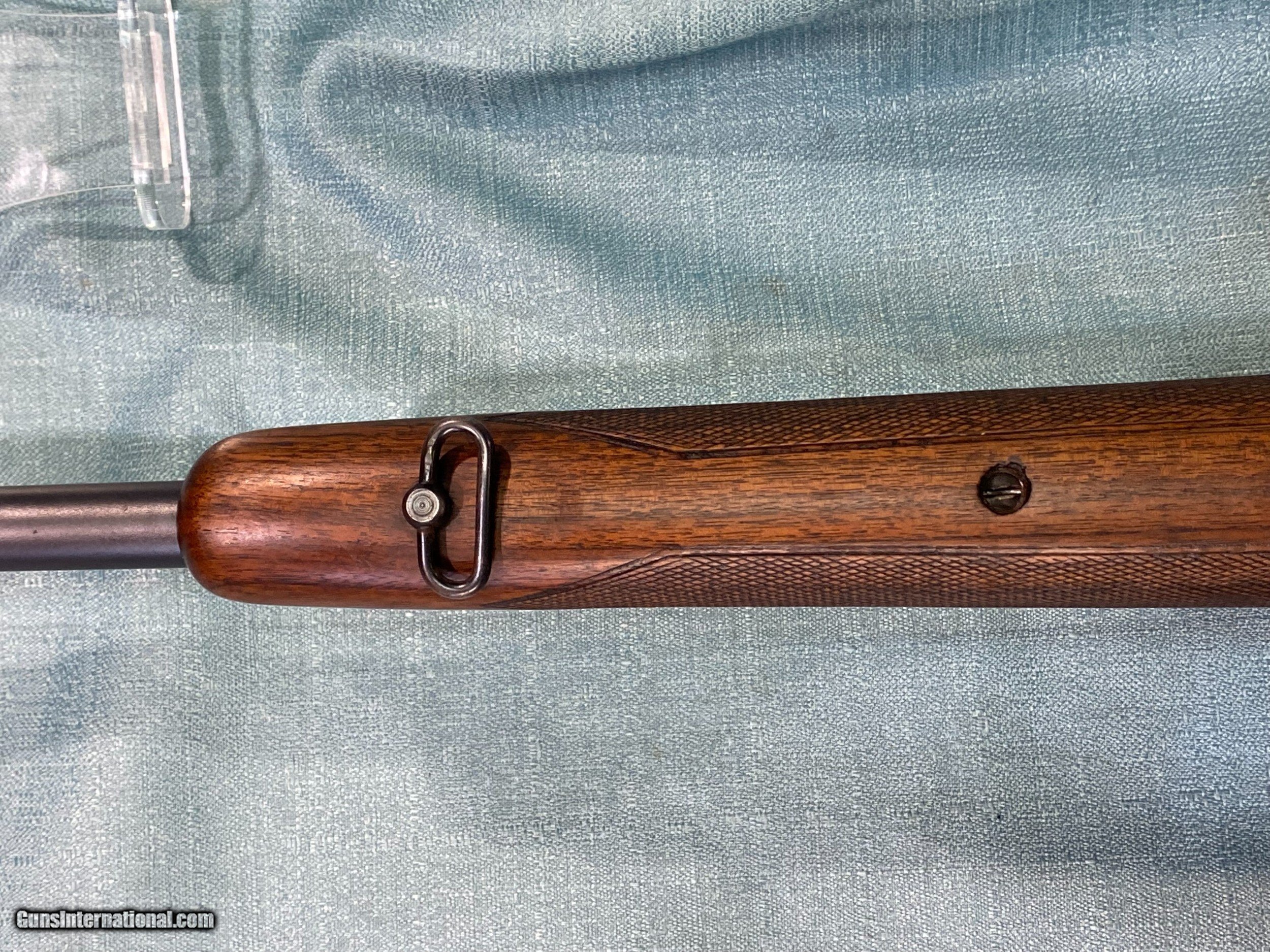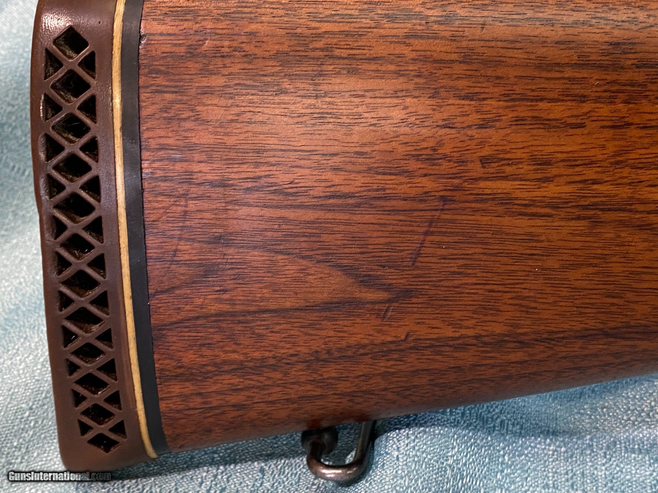 Description: This is a pre 64 Winchester model 70 Chambered in 300 H&H mag. This is one of the more desirable chambering in the early model 70. Manufactured in 1948 puts this rifle at the end of the "Transitional" period rifles between the post war models and the standard pre 64 model. It has a mirror like bore. This des not appear to be drilled and tapped at the top of the rear bridge but is on the side. It is drilled and tapped on the front of the receiver on the top. It has a 3 position forward swing safety lever and the bolt serial # matches the rifle. It has a secondary magnum stock bolt part way down the barrel. There are no cracks in this stock. the left side has some scratches it has acquired over the years. It has a Vintage scope mounted that says "Bear Cub Master" on the rear ring and "Kollmorgan Optical Corp" behind that. It uses external windage and elevation adjustments on "Smith Mounts" this scope has fine cross hairs and still has clean glass. Please do not hesitate to call and inquire about any items I may have missed that are pertinent to this rifle. Maine Residents add 5.5% sales Tax SOLD Rifle Caliber: .300 H&H Magnum Manufacturer: Winchester Model: 70 Pre 64 Serial Number: 84486 Barrel Length: 26 Condition: Very Good Metal Condition: Very Good Wood Condition: Good Bore Condition: Excellent Action: Bolt Controlled round Feed LOP: 12-5/8 Manufacture Date: 1948 Item Location: Buxton Maine |