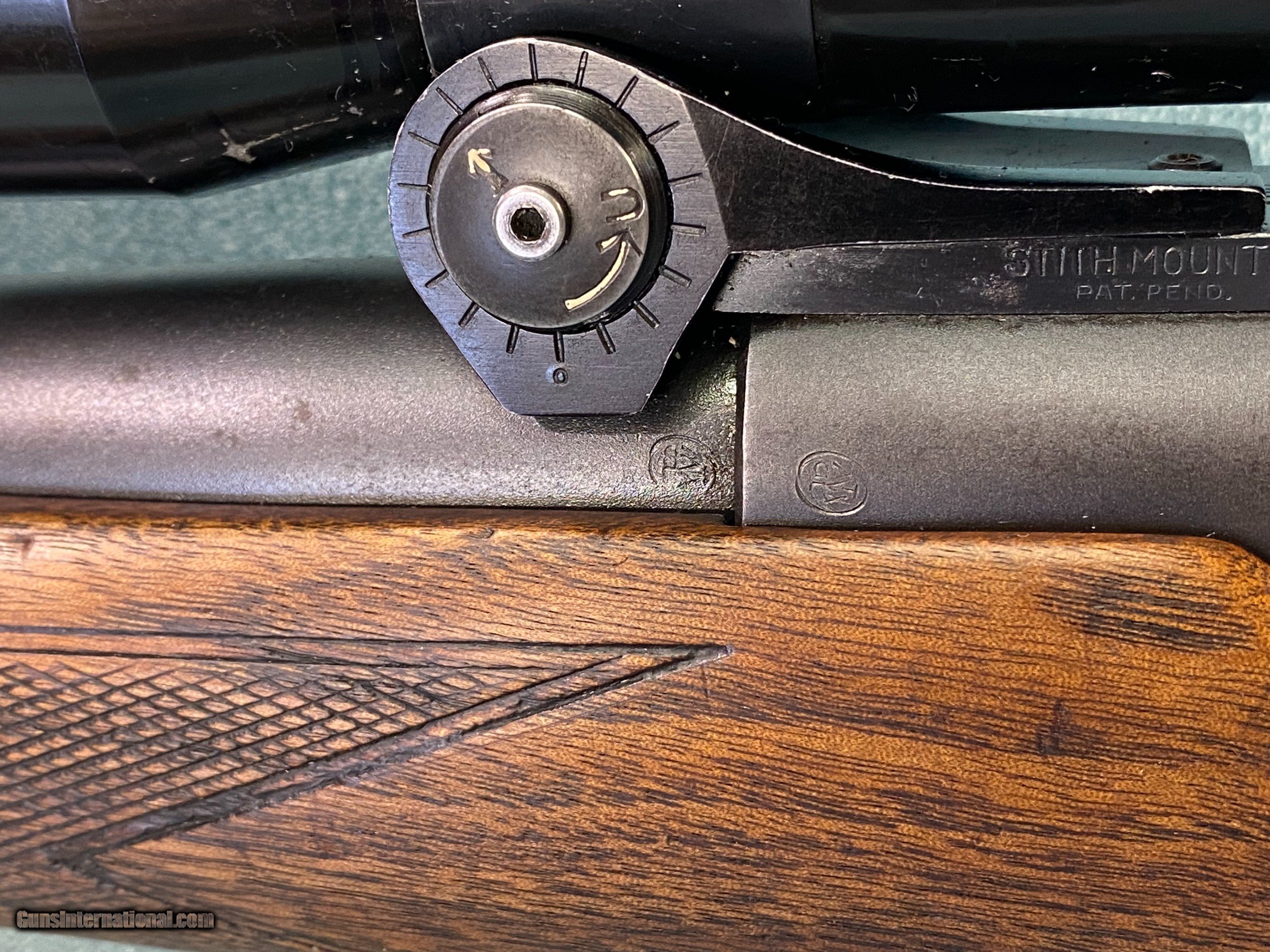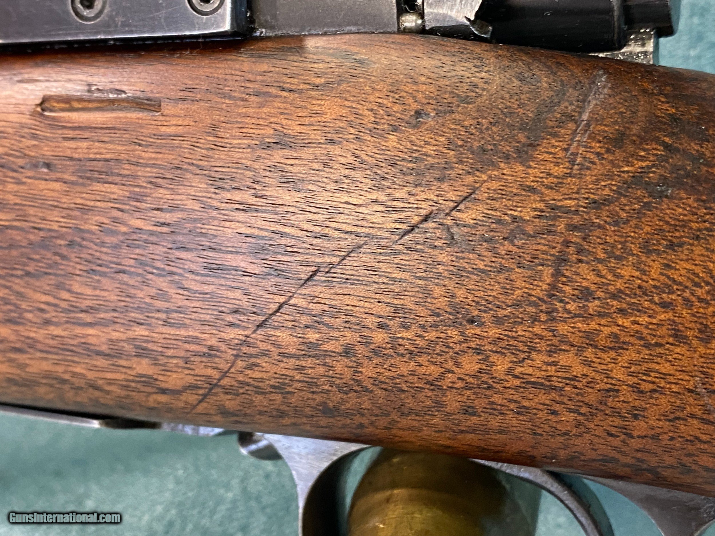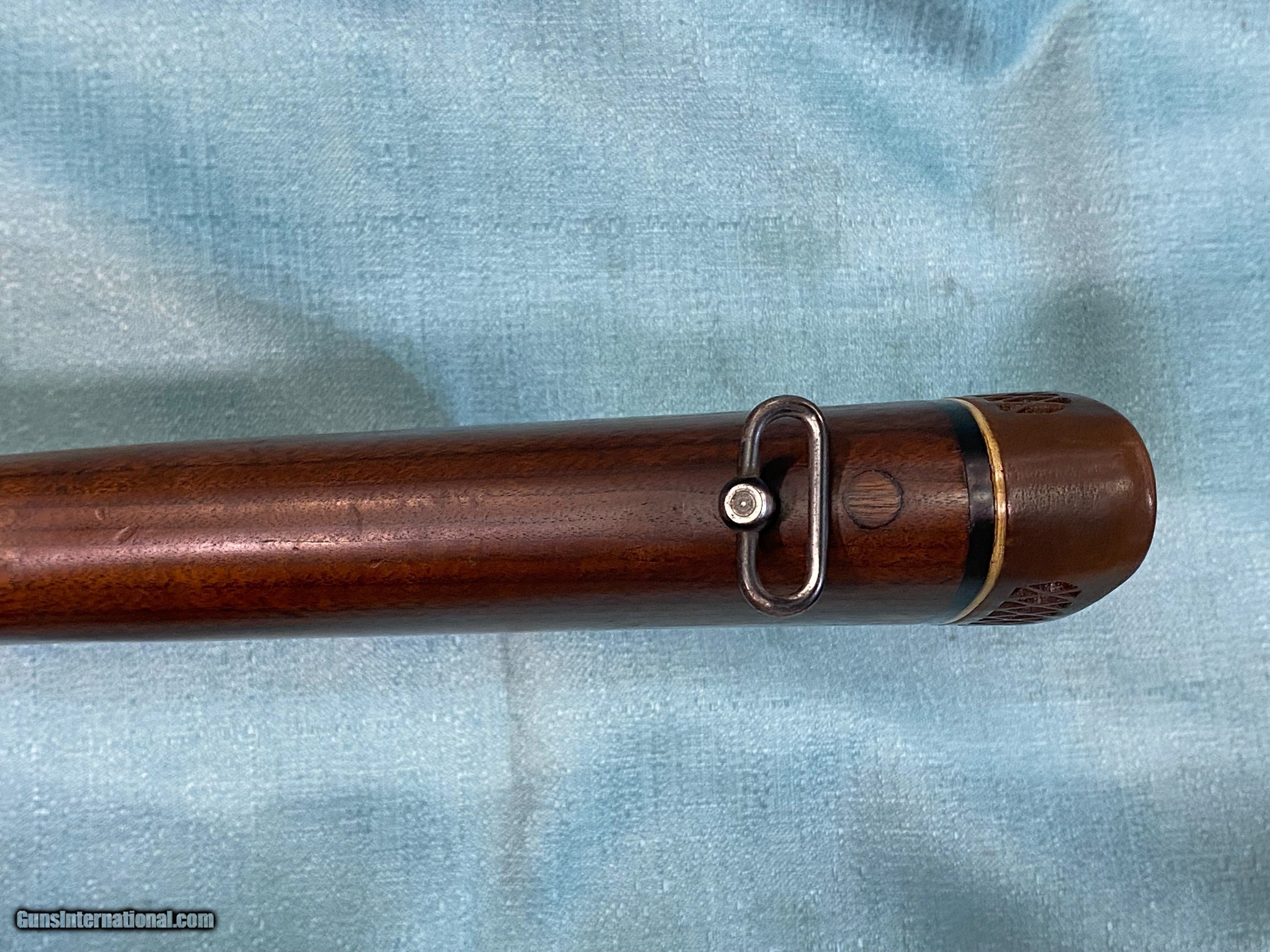 Description: This is a pre 64 Winchester model 70 Chambered in 300 H&H mag. This is one of the more desirable chambering in the early model 70. Manufactured in 1948 puts this rifle at the end of the "Transitional" period rifles between the post war models and the standard pre 64 model. It has a mirror like bore. This des not appear to be drilled and tapped at the top of the rear bridge but is on the side. It is drilled and tapped on the front of the receiver on the top. It has a 3 position forward swing safety lever and the bolt serial # matches the rifle. It has a secondary magnum stock bolt part way down the barrel. There are no cracks in this stock. the left side has some scratches it has acquired over the years. It has a Vintage scope mounted that says "Bear Cub Master" on the rear ring and "Kollmorgan Optical Corp" behind that. It uses external windage and elevation adjustments on "Smith Mounts" this scope has fine cross hairs and still has clean glass. Please do not hesitate to call and inquire about any items I may have missed that are pertinent to this rifle. Maine Residents add 5.5% sales Tax SOLD Rifle Caliber: .300 H&H Magnum Manufacturer: Winchester Model: 70 Pre 64 Serial Number: 84486 Barrel Length: 26 Condition: Very Good Metal Condition: Very Good Wood Condition: Good Bore Condition: Excellent Action: Bolt Controlled round Feed LOP: 12-5/8 Manufacture Date: 1948 Item Location: Buxton Maine |