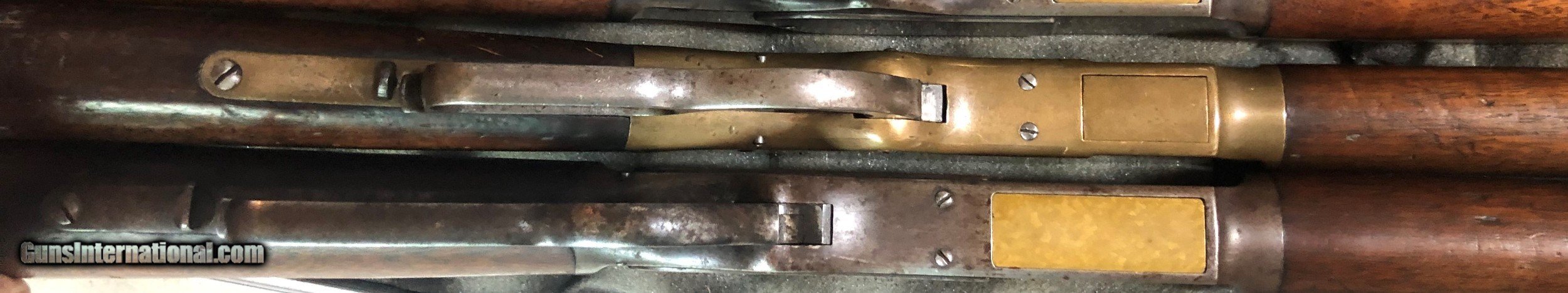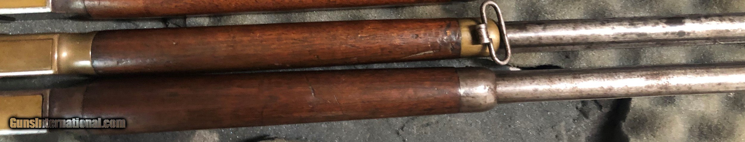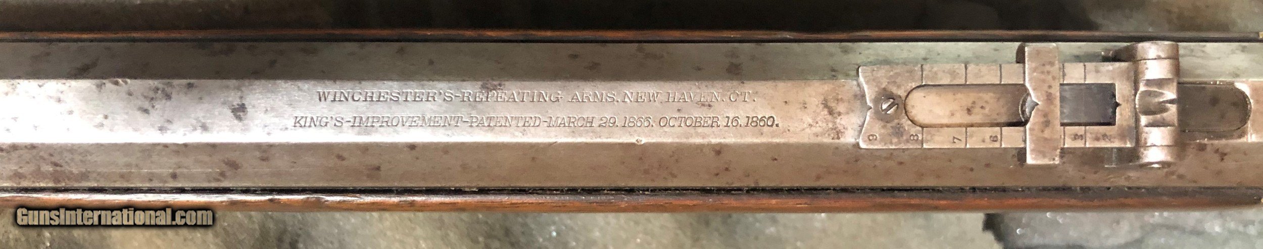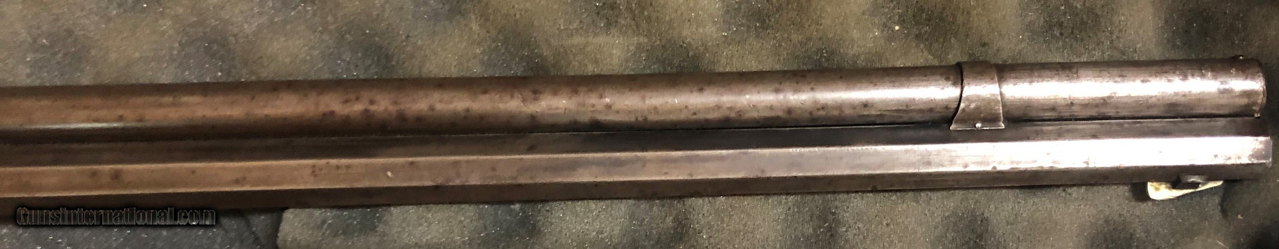 Description: Winchester 1866 Yellowboy 44 HENRY RF: box of 50 by Eley Bros. Tan box w/ blue label. Box marked "50 440 RIM-FIRE WATERPROOF CARTRIDGES, MADE EXPRESSLY FOR HENRY'S WINCHESTER (U.S.) REPEATING RIFLES". 2 Piece tan box. Cartridges are not headstamped. Box has wear, staining & taped reinforcement. Cartridges are clean. Winchester 1866 Yellowboy RIFLE - NOT Carbine Rifles are much rarer than carbines! Unable to letter by Cody. No records available. 44 Rimfire Rifle (Not a carbine) Production: 127,000 Carbines; 28,000 Rifles; 14,000 Muskets w/1020 produced with Bayonet attachments) S/N: 121xxx circa 1874. 6,636 mfg in 1874. Less than 17% of all 1866's were Rifles!!!! 3rd Model variation. 1/2 cock feature. Walnut Straight Grip. Forend has crack and two parallel indentations along crack. Otherwise very nice. Commensurate wear of a 150 year rifle! Original Octagonal Barrel. 24 inches. (STD) Stamped Kings Imp 3/29/66 10/16/60 Ladder Sight marked 2-9 Swivels. Brass Hardware. Great Patina Correct and complete rifle. Opened for lubrication only. Externals lightly cleaned for operation. Functions as it should. SOLD Antique: Yes Rifle Caliber: .44 Rimfire Manufacturer: Winchester Model: 1866 Serial Number: 121xxx Barrel Length: 24 |