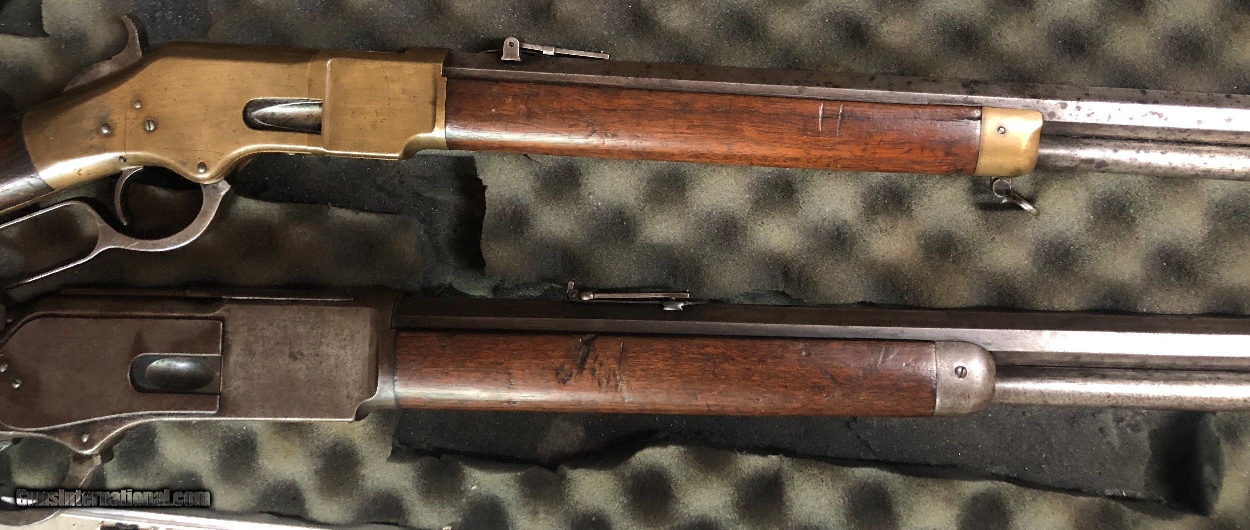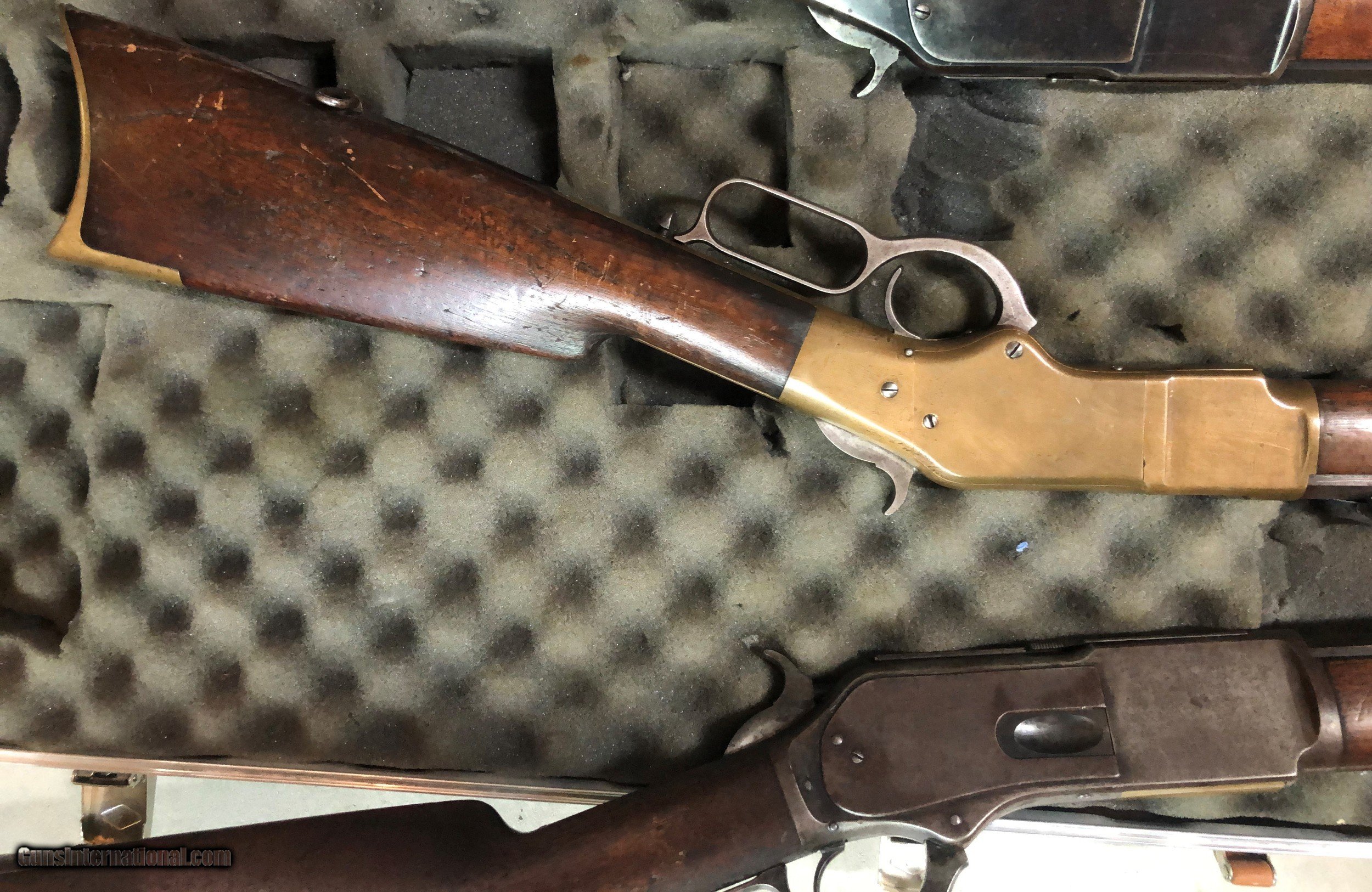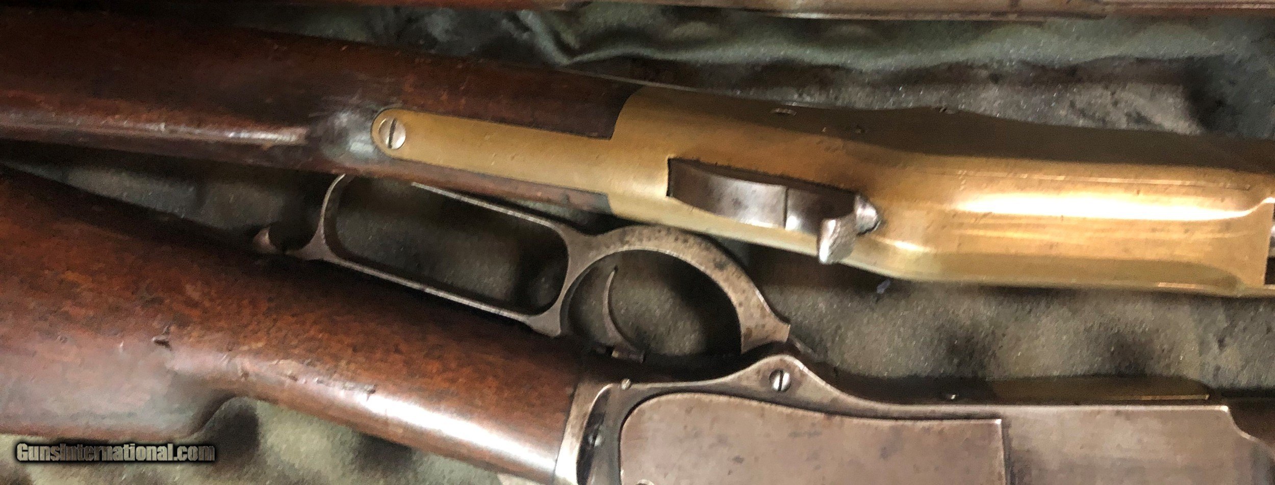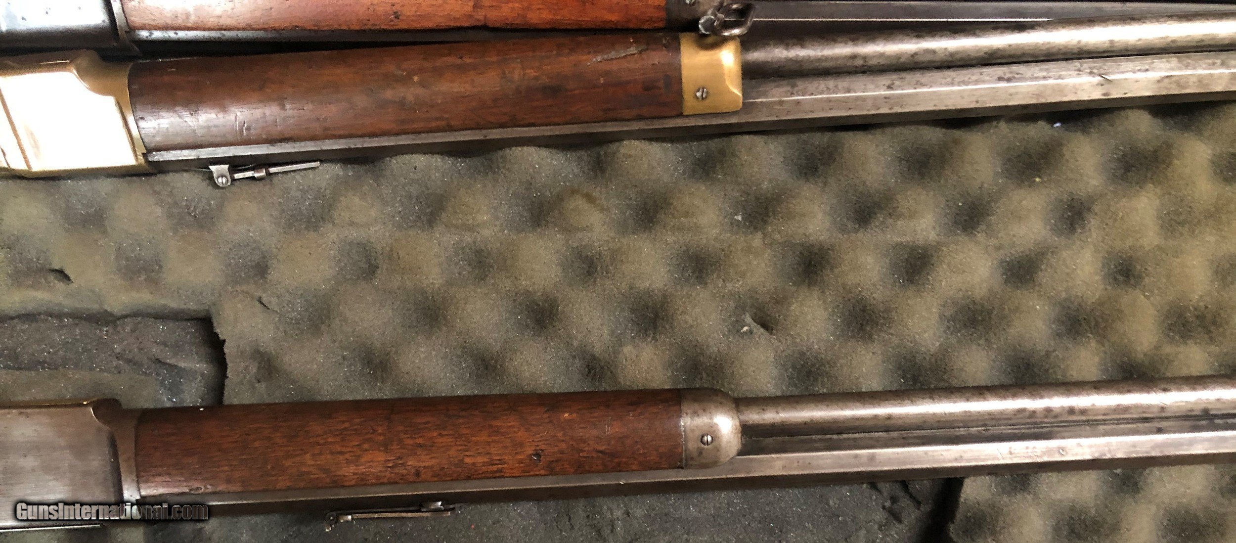 Description: Winchester 1866 Yellowboy 44 HENRY RF: box of 50 by Eley Bros. Tan box w/ blue label. Box marked "50 440 RIM-FIRE WATERPROOF CARTRIDGES, MADE EXPRESSLY FOR HENRY'S WINCHESTER (U.S.) REPEATING RIFLES". 2 Piece tan box. Cartridges are not headstamped. Box has wear, staining & taped reinforcement. Cartridges are clean. Winchester 1866 Yellowboy RIFLE - NOT Carbine Rifles are much rarer than carbines! Unable to letter by Cody. No records available. 44 Rimfire Rifle (Not a carbine) Production: 127,000 Carbines; 28,000 Rifles; 14,000 Muskets w/1020 produced with Bayonet attachments) S/N: 121xxx circa 1874. 6,636 mfg in 1874. Less than 17% of all 1866's were Rifles!!!! 3rd Model variation. 1/2 cock feature. Walnut Straight Grip. Forend has crack and two parallel indentations along crack. Otherwise very nice. Commensurate wear of a 150 year rifle! Original Octagonal Barrel. 24 inches. (STD) Stamped Kings Imp 3/29/66 10/16/60 Ladder Sight marked 2-9 Swivels. Brass Hardware. Great Patina Correct and complete rifle. Opened for lubrication only. Externals lightly cleaned for operation. Functions as it should. SOLD Antique: Yes Rifle Caliber: .44 Rimfire Manufacturer: Winchester Model: 1866 Serial Number: 121xxx Barrel Length: 24 |