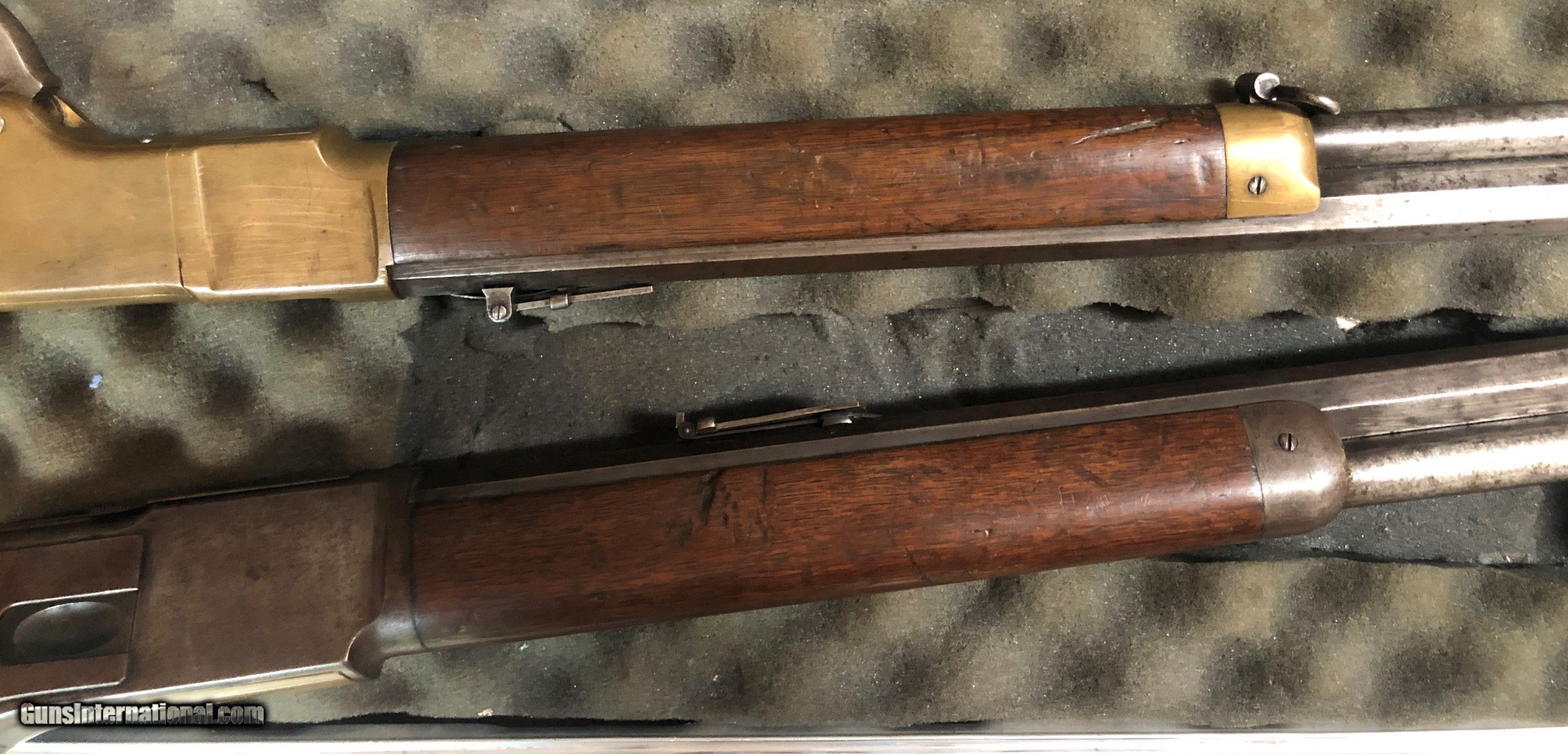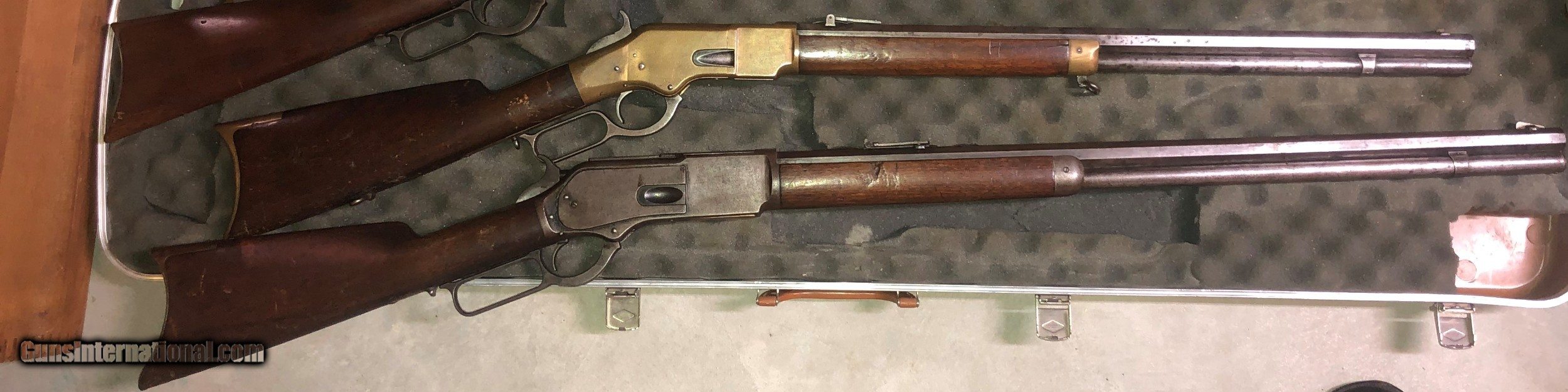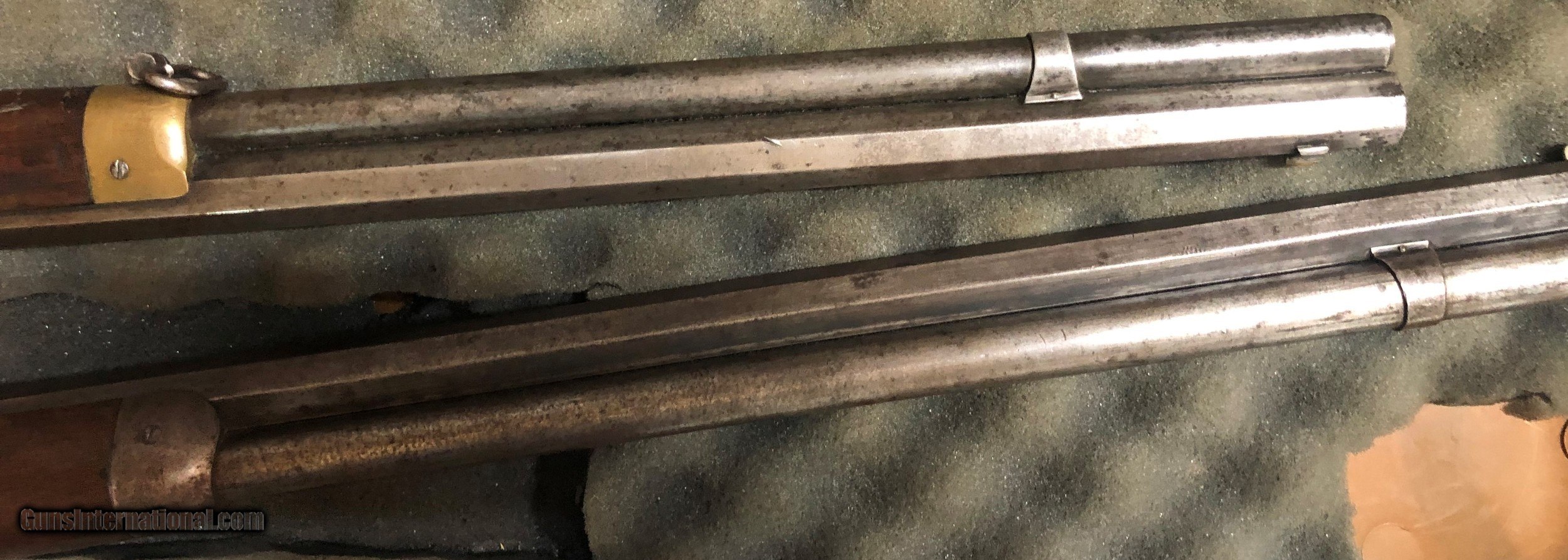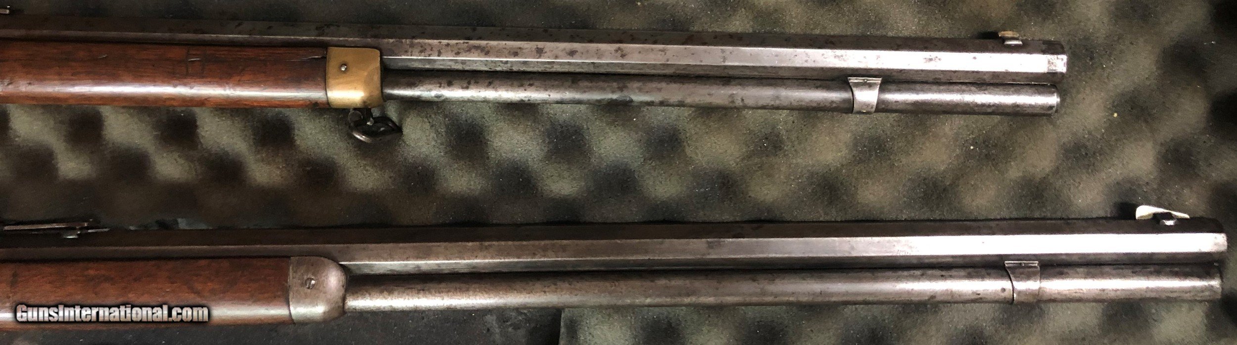 Description: Winchester 1866 Yellowboy 44 HENRY RF: box of 50 by Eley Bros. Tan box w/ blue label. Box marked "50 440 RIM-FIRE WATERPROOF CARTRIDGES, MADE EXPRESSLY FOR HENRY'S WINCHESTER (U.S.) REPEATING RIFLES". 2 Piece tan box. Cartridges are not headstamped. Box has wear, staining & taped reinforcement. Cartridges are clean. Winchester 1866 Yellowboy RIFLE - NOT Carbine Rifles are much rarer than carbines! Unable to letter by Cody. No records available. 44 Rimfire Rifle (Not a carbine) Production: 127,000 Carbines; 28,000 Rifles; 14,000 Muskets w/1020 produced with Bayonet attachments) S/N: 121xxx circa 1874. 6,636 mfg in 1874. Less than 17% of all 1866's were Rifles!!!! 3rd Model variation. 1/2 cock feature. Walnut Straight Grip. Forend has crack and two parallel indentations along crack. Otherwise very nice. Commensurate wear of a 150 year rifle! Original Octagonal Barrel. 24 inches. (STD) Stamped Kings Imp 3/29/66 10/16/60 Ladder Sight marked 2-9 Swivels. Brass Hardware. Great Patina Correct and complete rifle. Opened for lubrication only. Externals lightly cleaned for operation. Functions as it should. SOLD Antique: Yes Rifle Caliber: .44 Rimfire Manufacturer: Winchester Model: 1866 Serial Number: 121xxx Barrel Length: 24 |
