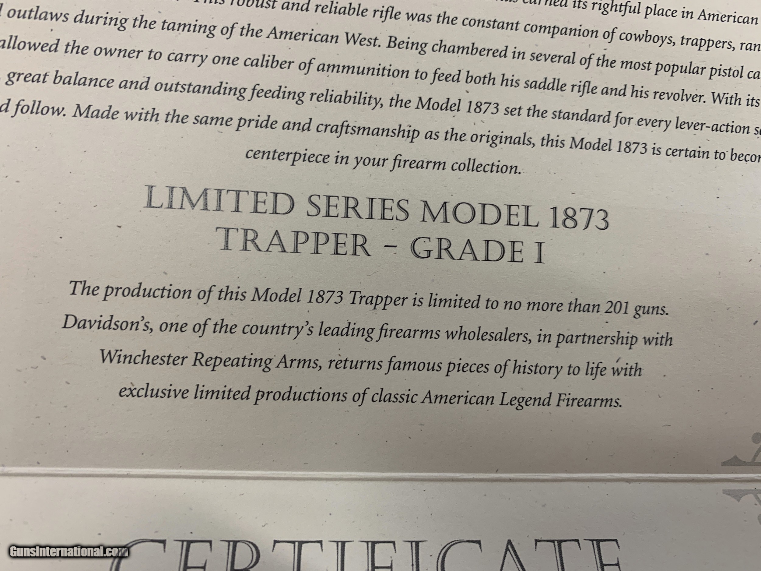 Description: ESTATE FIND New in the box WINCHESTER 73 TRAPPER CARBINE 16" BBL CHAMBERED IN 45 COLT , PRODUCED BY DAVIDSONS, LIMITED PRODUCTION OF NO MORE THAN 201 RIFLES MADE THERE ARE NO LABLES ON THE BOX . $ 2,350.00 + $100 SHIPPPED TO YOUR FFL FOR PAYMENT I ACCEPT: Postal money orders , ships same day Personal checks , MY BANK REQUIRES 11 BUISNESS DAYS TO GUARANTEE ME FUNDS FOR CHECKS I WILL SHIPDAY 12 SOLD |