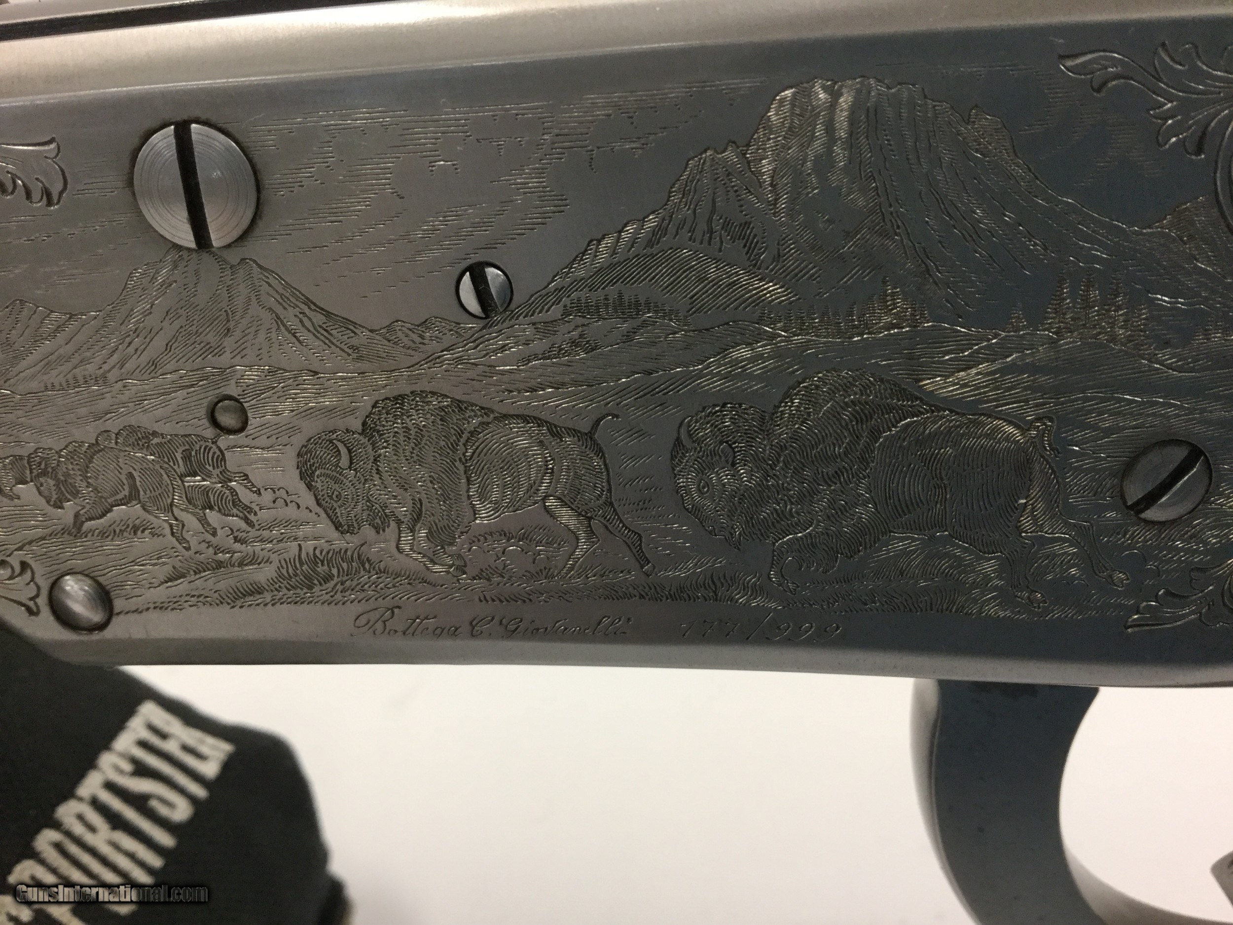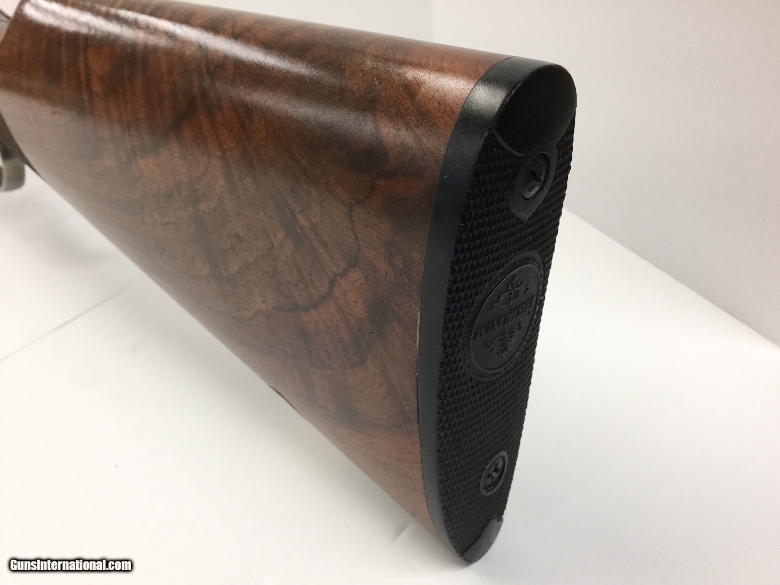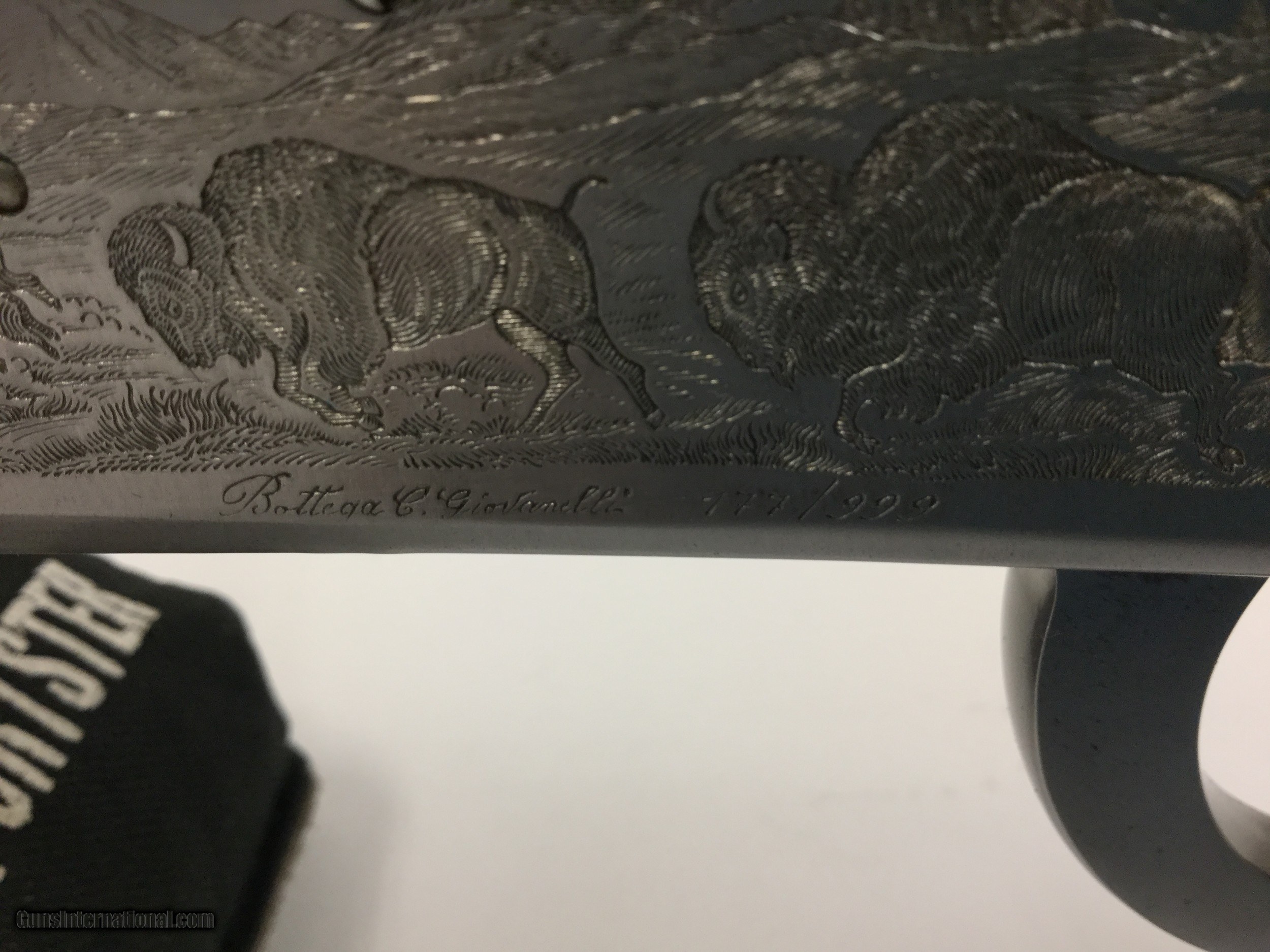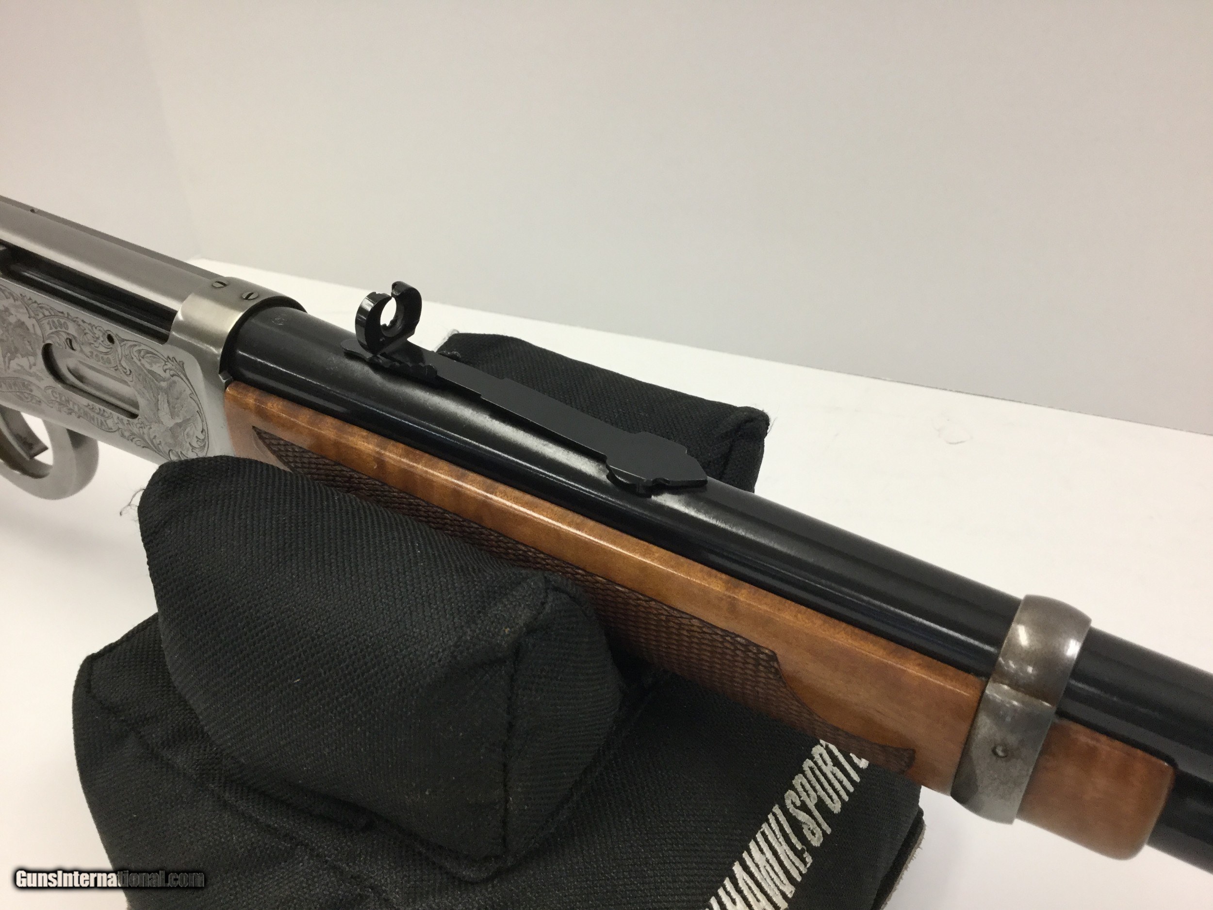 Description: Up for your consideration is a beautiful Winchester Model 94 AE (Angle Eject) rifle manufactured in 1990. As stated this gun was manufactured to celebrate the 100th anniversary of Wyoming becoming a U.S state. There were originally 999 of these guns planned for production but due to the strike only 500 were made, this being #177 of those 500. This gun features a 20in high gloss blue barrel, and gloss blue sight hood, as well as deluxe checkered American Walnut Stock and forend. The receiver is finished in a coined stainless steel and engraved by Bottega C. Giovanelli featuring game scenes, bison and floral borders. The gun is striking to look at and to hold, representing the awe inspiring scenery seen in Wyoming. The gun is unfired and does include original box. Condition is excellent. Before purchasing please view our additional terms of sale as a purchase of the firearms is a contractual obligation to abide by any and all of our in store policies. SOLD Manufacturer: Winchester Model: 94 Angle Eject Wyoming Centennial Serial Number: WYC177 Caliber Info: .30-30 Winchester Condition: EX Metal Condition: EX Wood Condition: EX Bore Condition: EX Barrels: 20in Barrel Type: Round Action: Lever Stock: Walnut Manufacture Date: 1990 Engraving: Hand Relief Item Location: Exeter, Rhode Island |