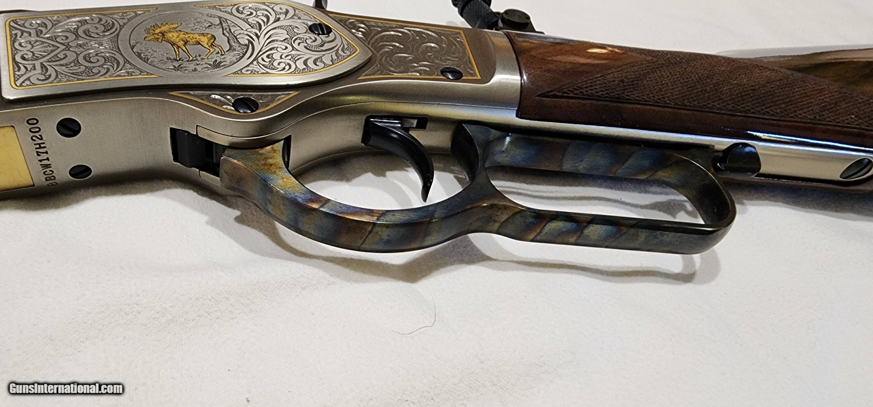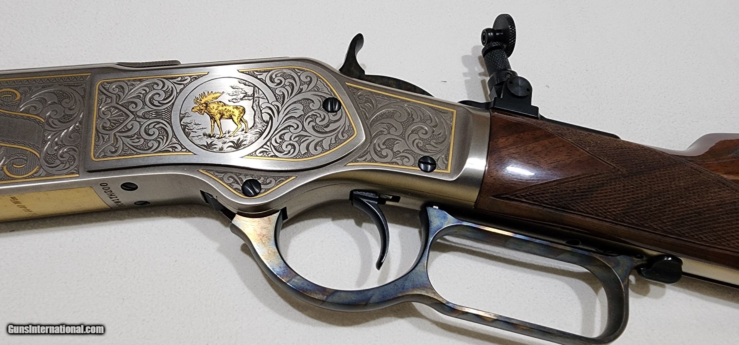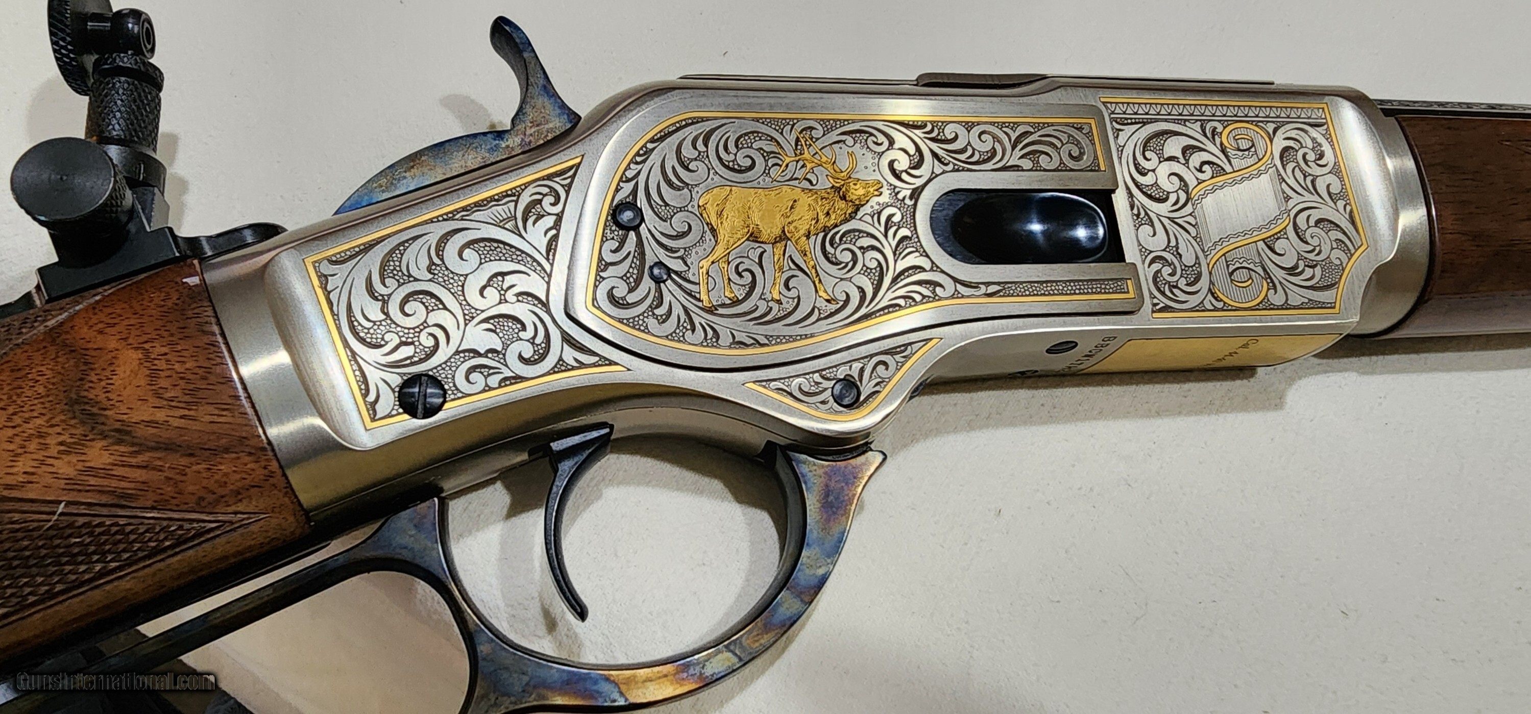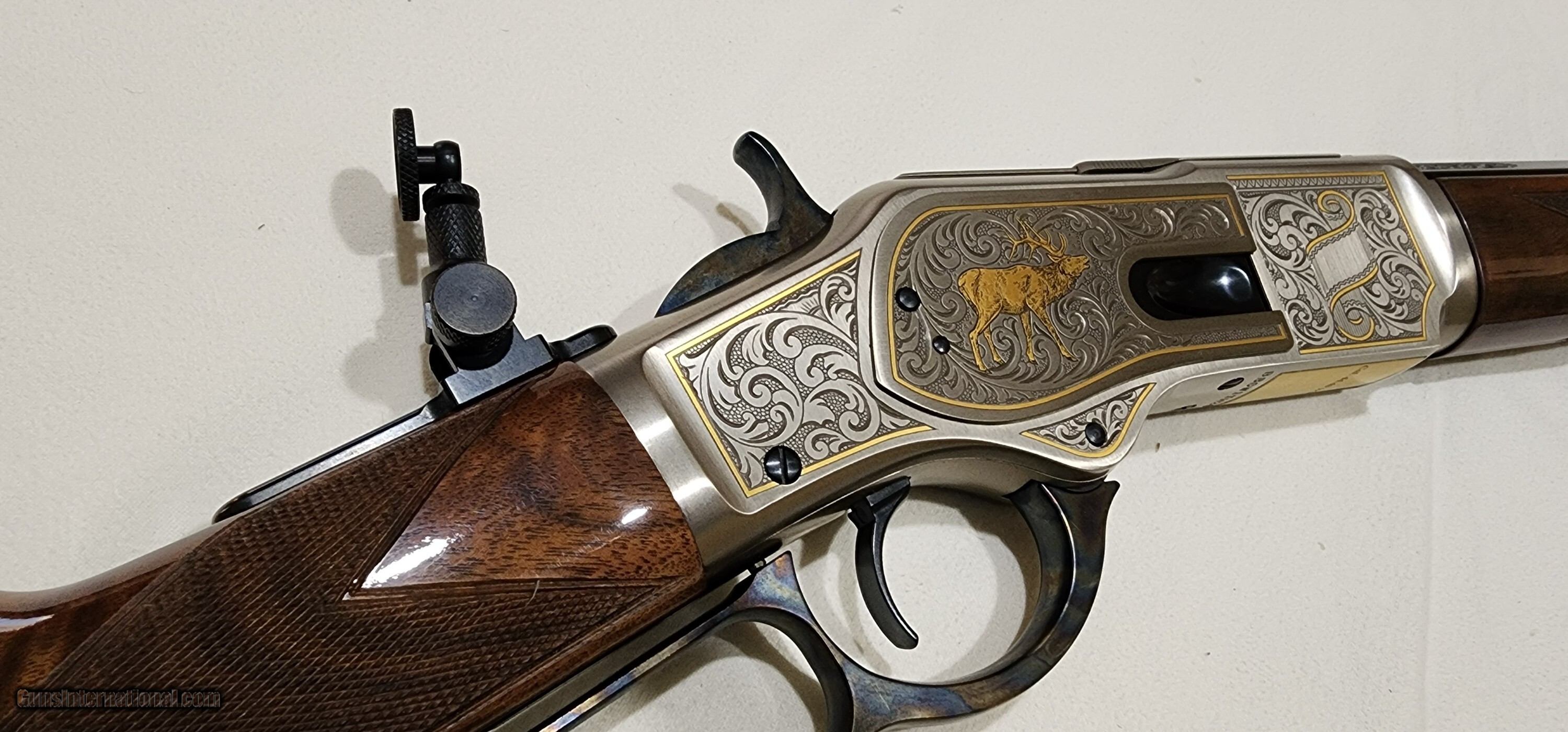 I am proud to bring this exquisite Winchester lever-action to Guns International! This beautiful Winchester 1873 features the same hand-chased engraving as one of the most expensive Winchesters ever sold at . Featuring a 24” .44-40 octagonal barrel and a beautiful, blued receiver with 24 kt gold-inlaid moose and elk and blue forend tip. The hammer and lever feature amazing case colors.