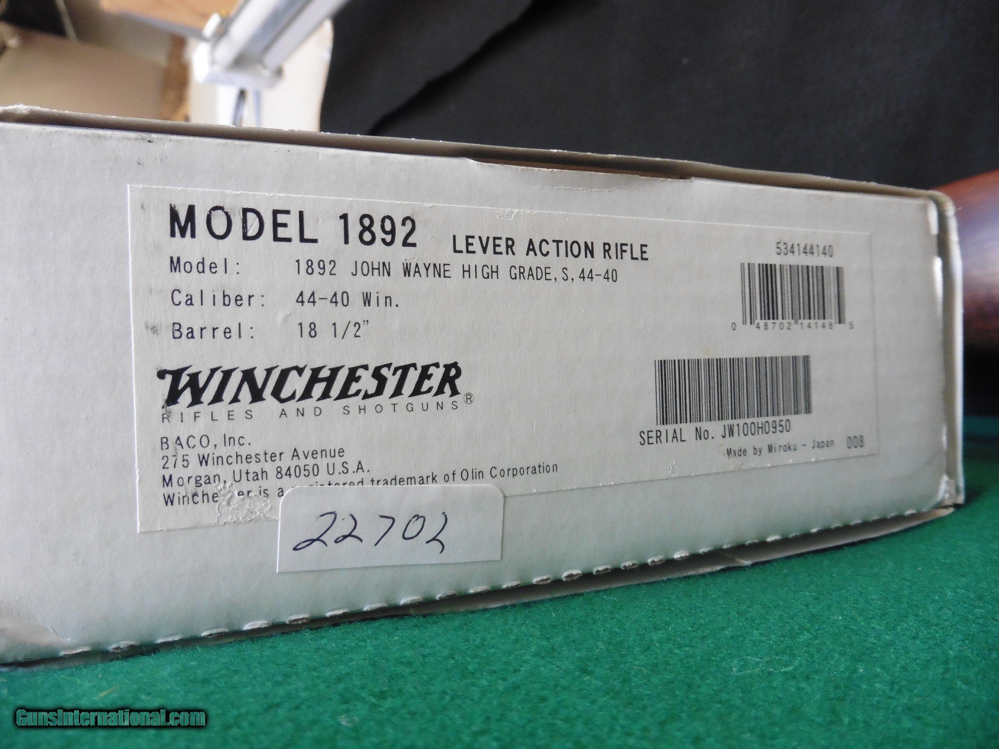 Description: John Wayne commemorative with original box. Centennial edition with limited production run (1 of 4,000 produced in 2007). Large loop high grade lever in 44-40. Coin finished engraved receiver. 18.5" round barrel with ladder rear sight and brass front blade. Rifle is in near mint condition. There are some light handling marks on forend and two small nicks to the finish (one is on the barrel and one is on the magazine tube) see pictures. Rifle includes three 50-rd boxes of matching Winchester 44-40 ammunition. Commemorative 100 years of John Wayne (X4440JW). We accept all major credit cards, casHier checks and money orders. 3% fee for CC transactions. Buyer to pay shipping. Please no trades. SOLD Manufacturer: Winchester Model: 1892 Caliber Info: 44-40 Condition: near mint Barrels: 18 |