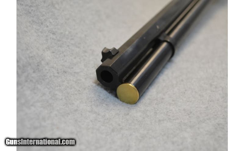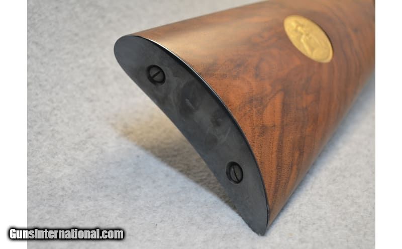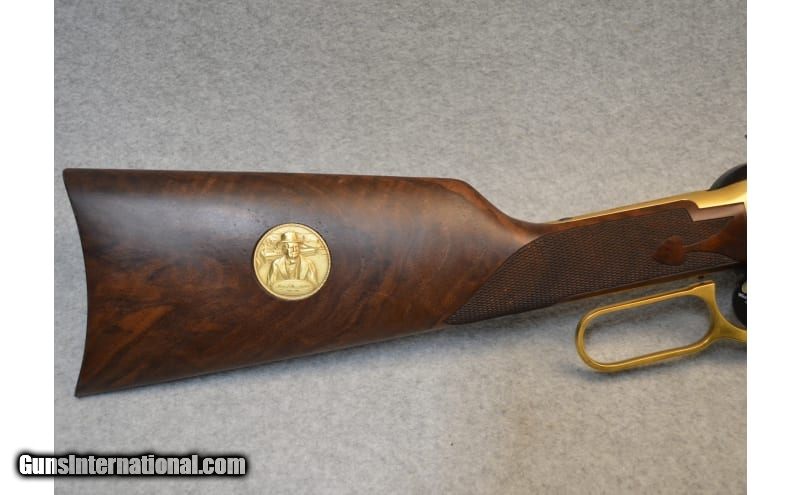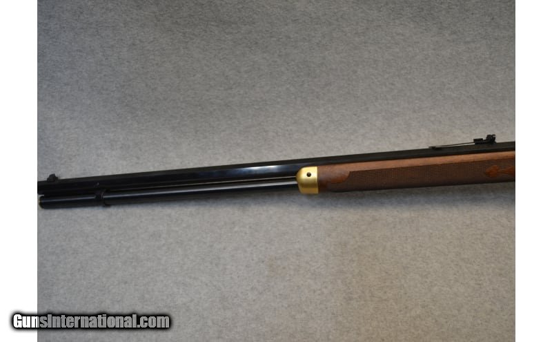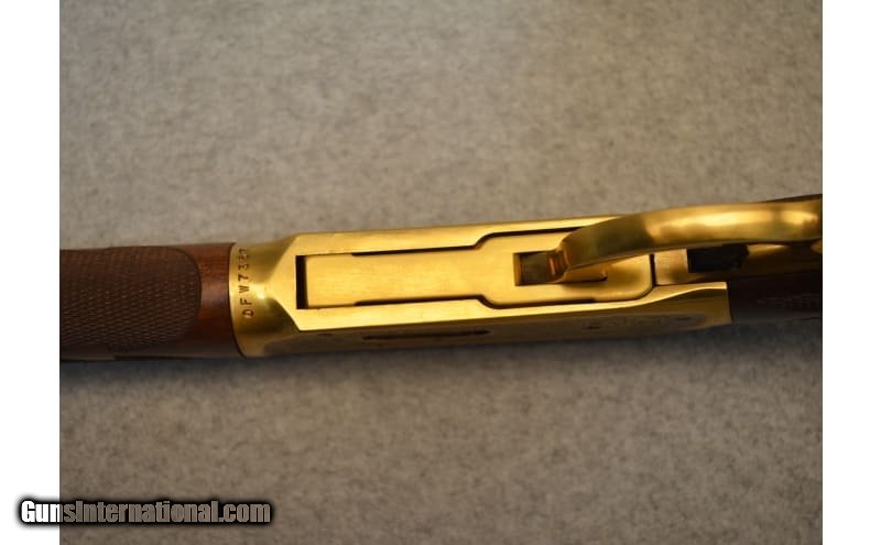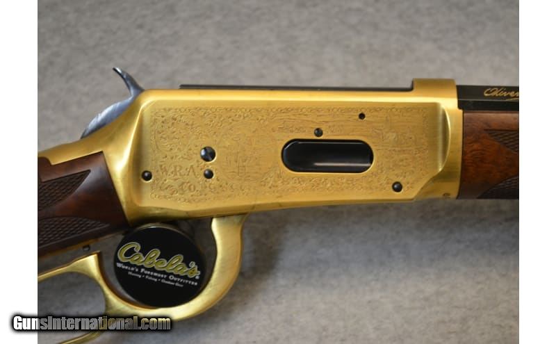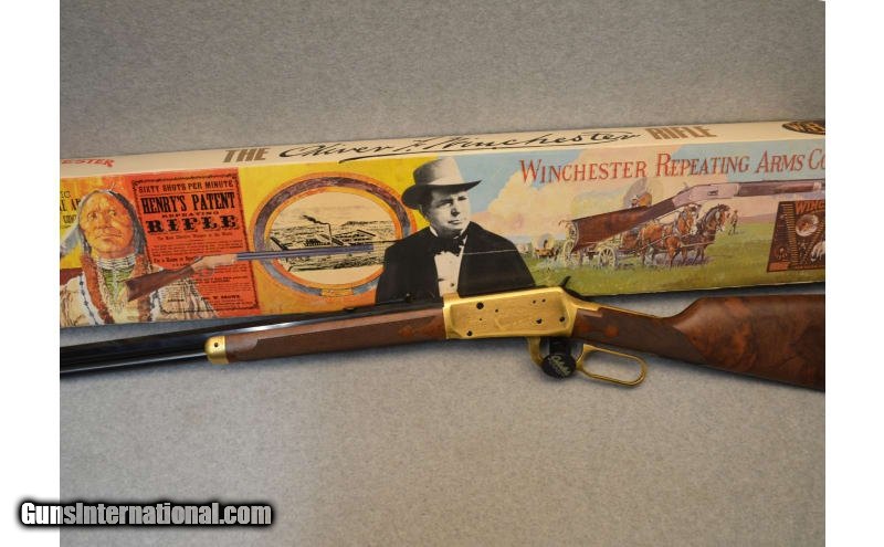 Description: This is the Oliver Winchester Model 94 lever action commemorative rifle with a 24 inch octagonal barrel. This rifle features an engraved gold-plated receiver with scenes of the Winchester factory on the left side and early frontier scene on the left with W.R.A. Co. scroll and gold inlay Oliver F. Winchester signature on the barrel with Oliver Winchester medallion in the butt stock. The walnut stock is likewise excellent with crisp deluxe checkering showing only light handling marks. The rifle comes in the original styrofoam box with commemorative sleeve numbered to the gun. .38-55 Winchester SOLD Barrels: 24 inch Item Location: Hazelwood, MO |