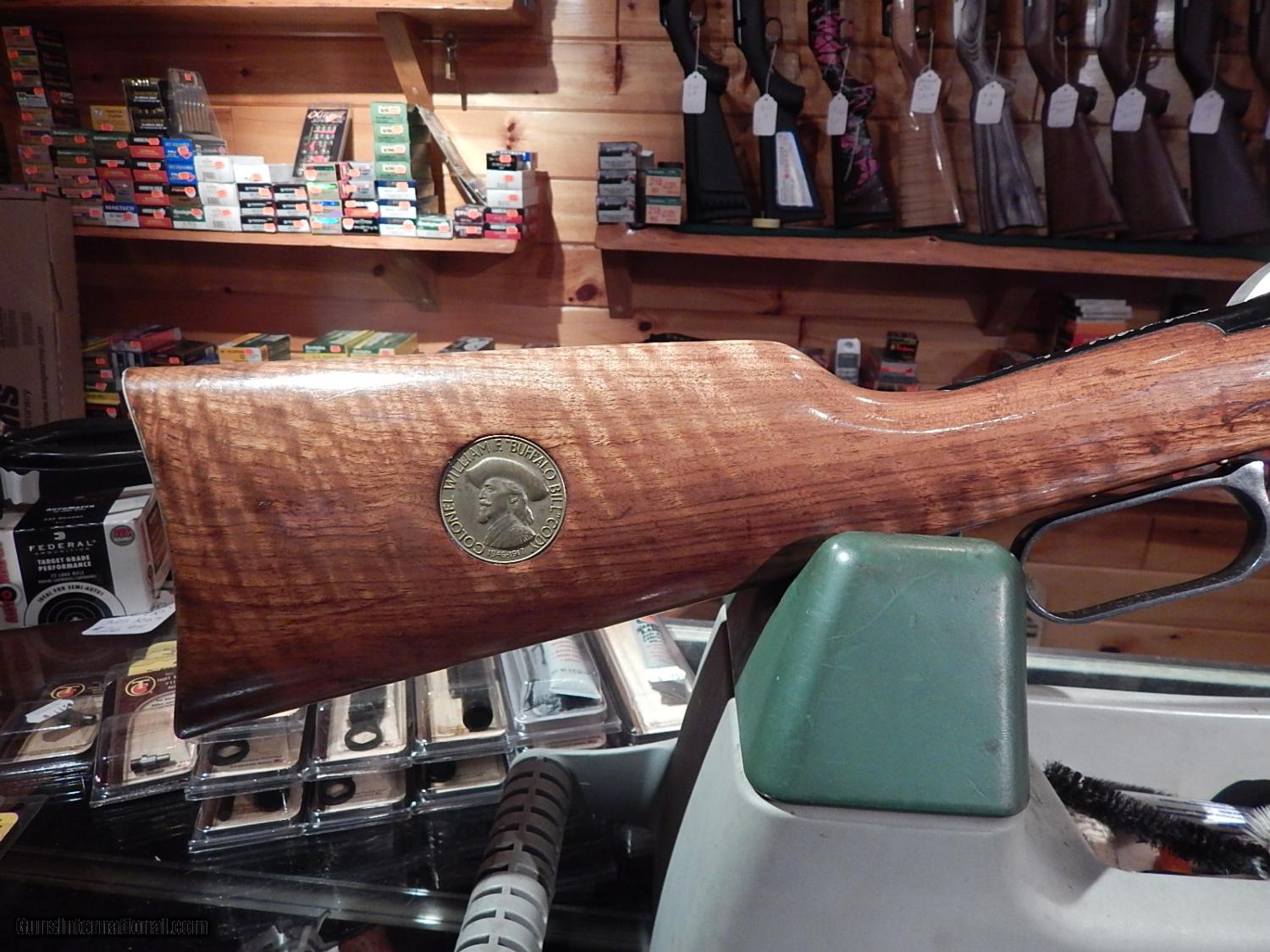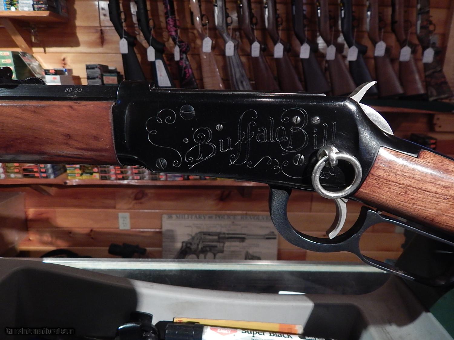 Description: Winchester Buffalo Bill commemorative 30-30 octagon barrel,Very nice wood 95% condition easy,Brass butt plate One shiny TINY spot on high point of barrel shown in pic.C&R ok Very clean rifle no box SOLD |
