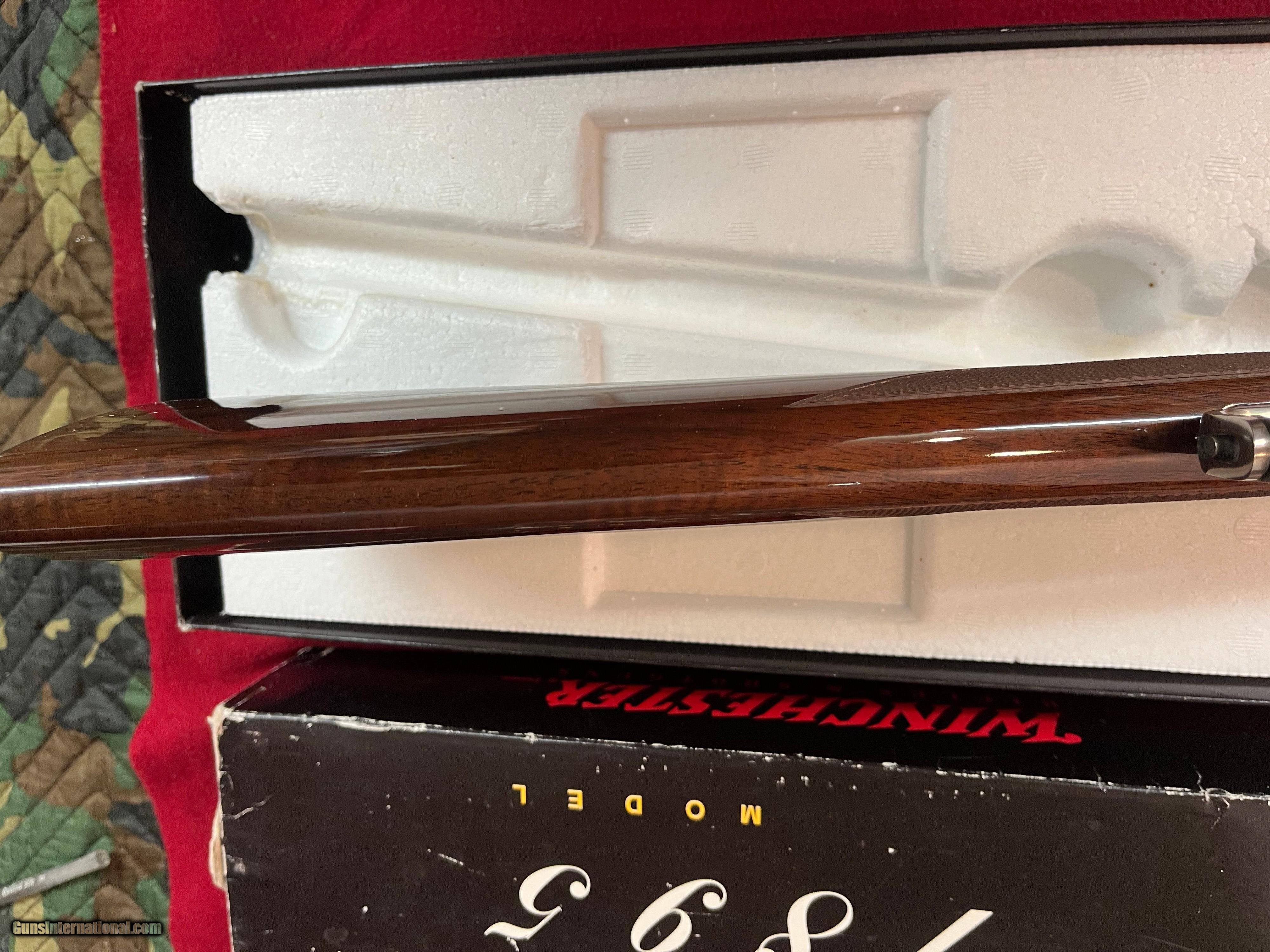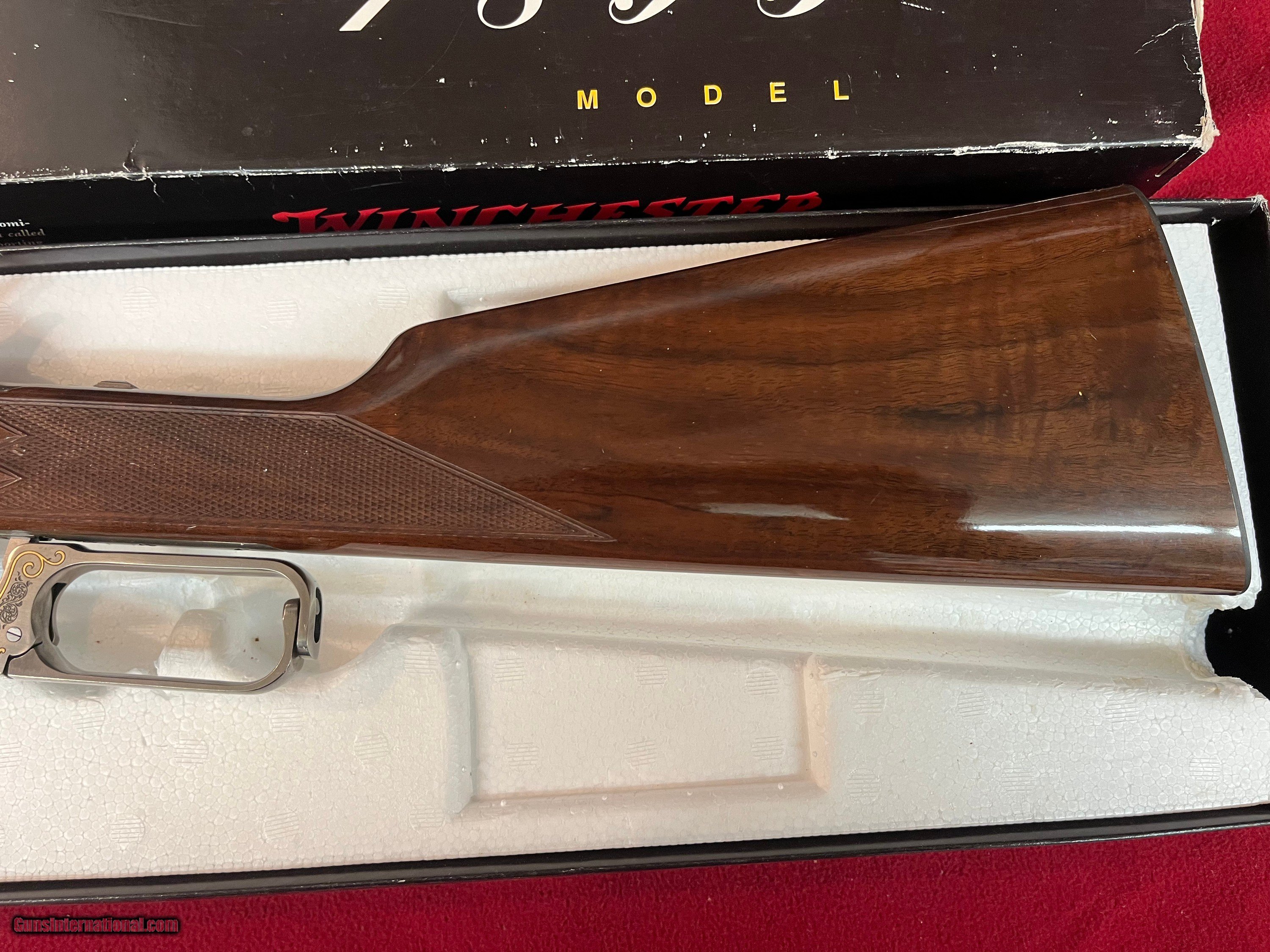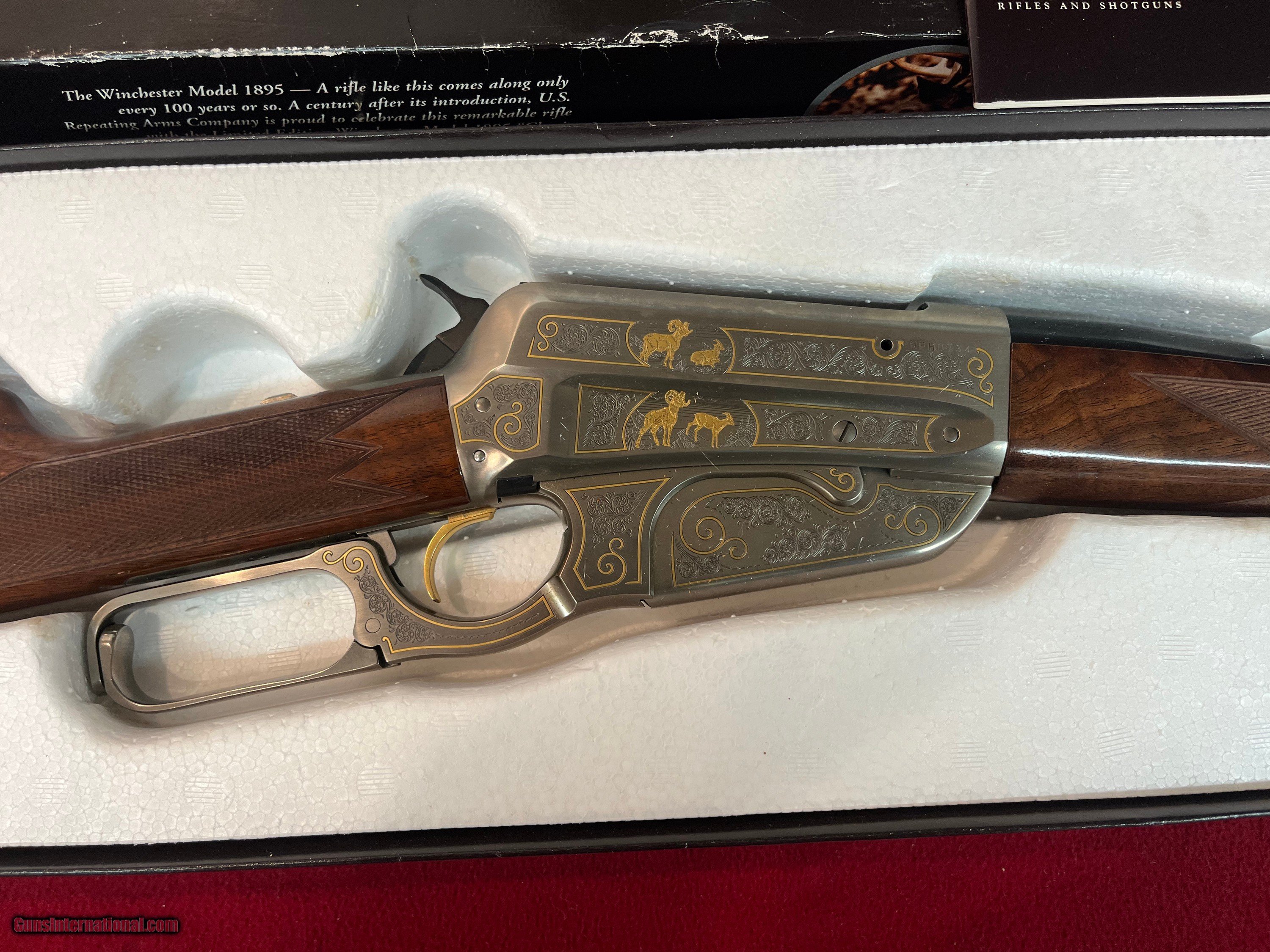 Description: New Winchester Model 1895 Limited-Edition High-Grade lever action rifle, Code # 1407897, Serial # NFN0734, made in Japan with matching factory box (see pictures) 24" round barrel in .30-06 Springfield with rifle rear sight and blade front. Coin finished receiver with engraved scrolls with gilded boarders and gilded depictions of a ram and a ewe on the right side with a bull and cow elk on the left side. 2 pieces of checkered walnut stock and Schnabel forearm complete with blued steel shotgun butt plate. 1995 represents Model 1895’s 100th anniversary. Only 3,000 were ever to be made in High Grade. If you need more information or photos, please contact us. These are consignment firearms, and the owner receives the funds. Personal Checks accepted, Bank Checks or Money Orders. We are an FFL Dealer so please be aware of your Federal & State laws before buying. Buyer pays the exact shipping & insurance cost for shipment of firearms, with tracking information. SOLD Rifle Caliber: .30-06 Springfield Manufacturer: Winchester Model: 1895 Serial Number: NFN0734 Barrel Length: 24 Condition: New Action: Lever |
