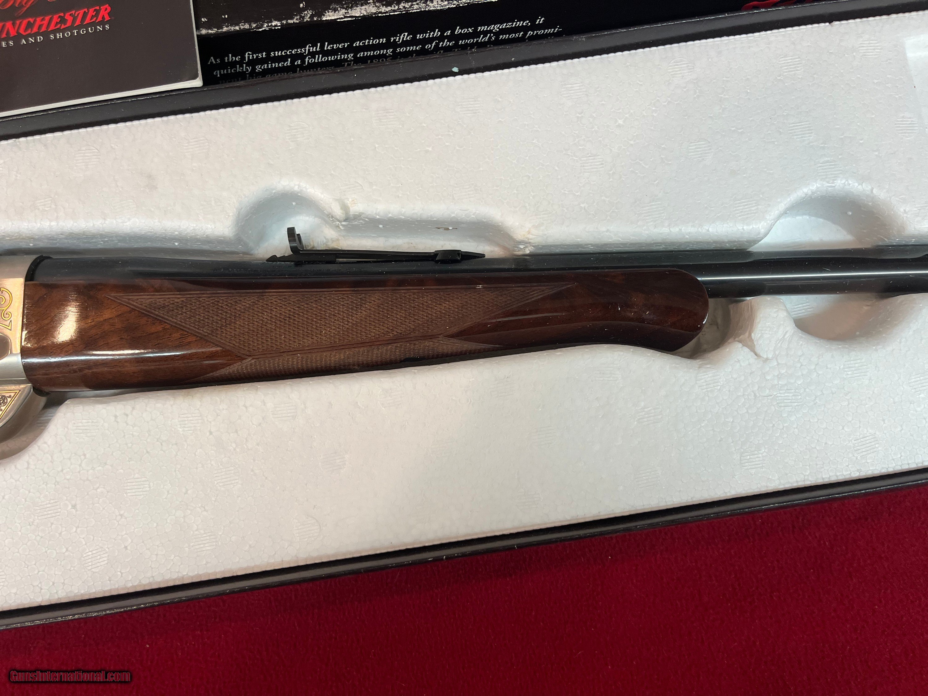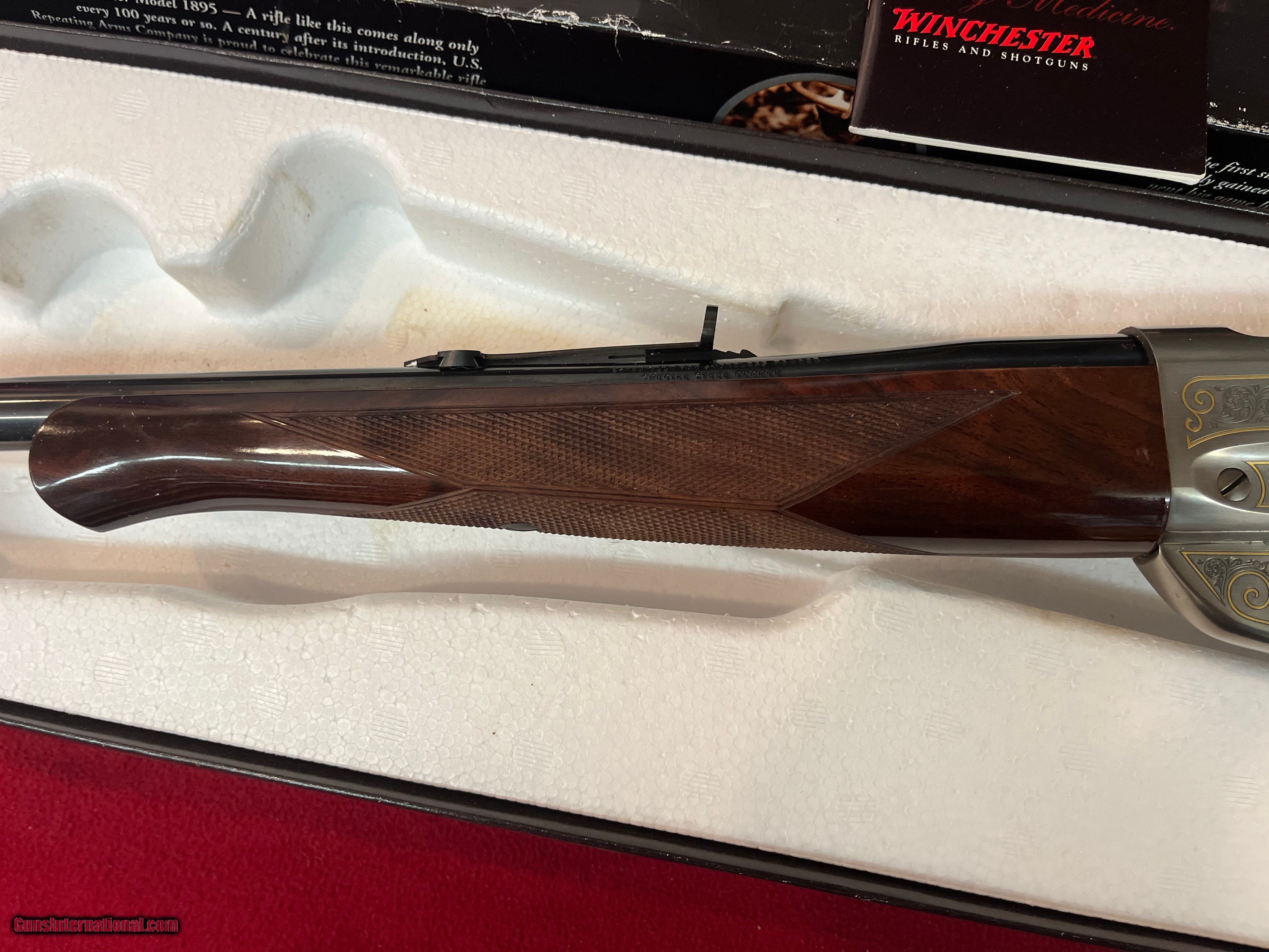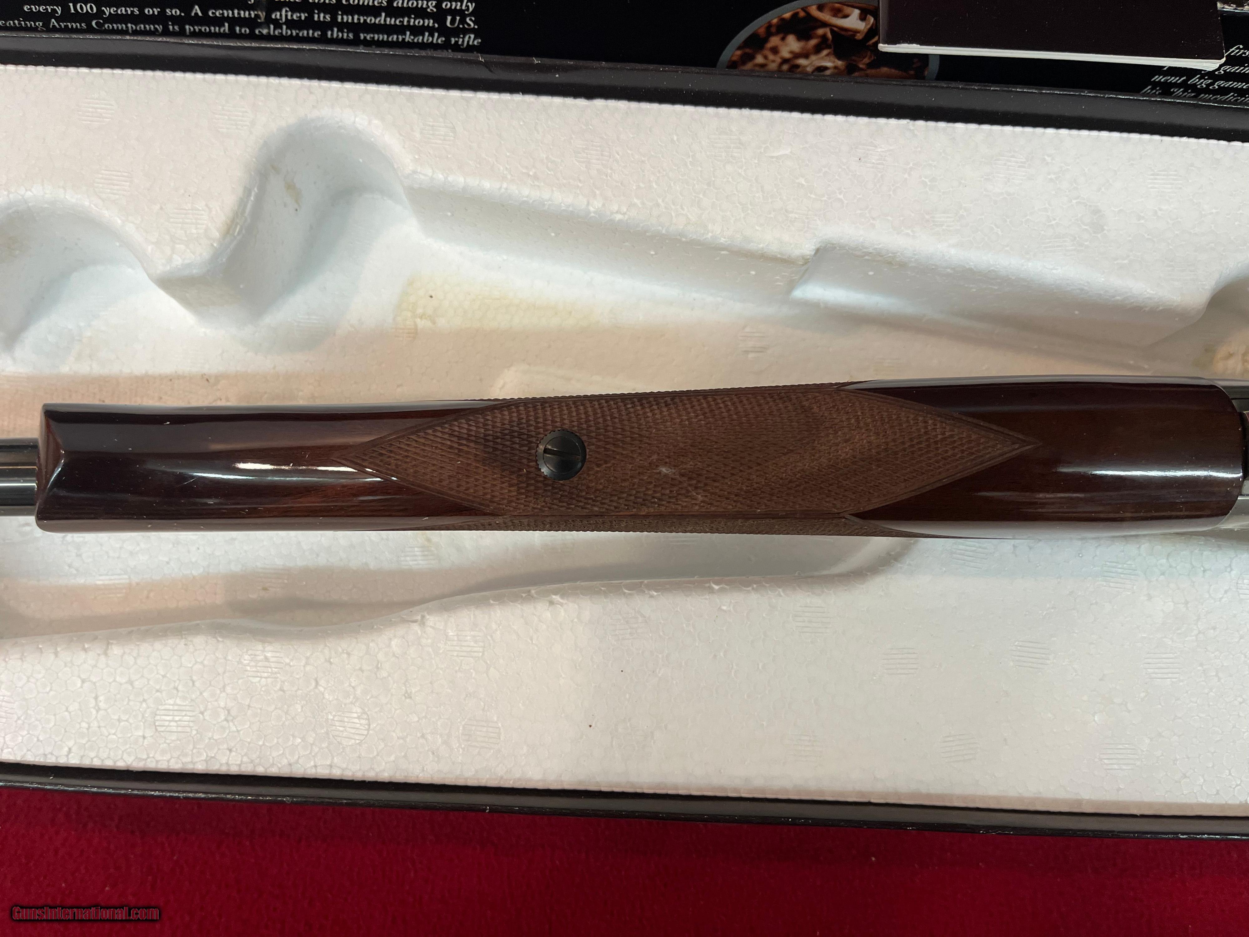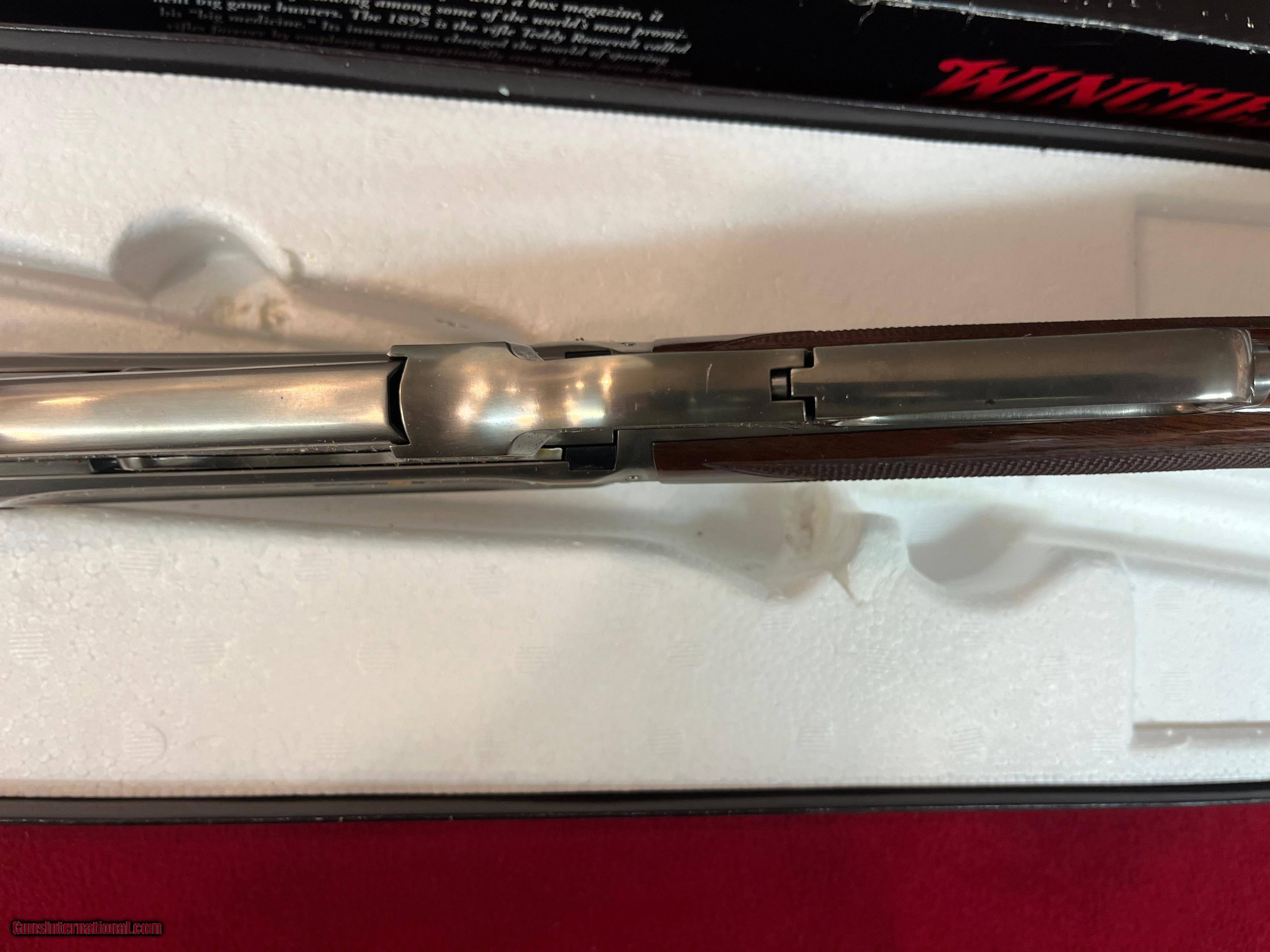 Description: New Winchester Model 1895 Limited-Edition High-Grade lever action rifle, Code # 1407897, Serial # NFN0734, made in Japan with matching factory box (see pictures) 24" round barrel in .30-06 Springfield with rifle rear sight and blade front. Coin finished receiver with engraved scrolls with gilded boarders and gilded depictions of a ram and a ewe on the right side with a bull and cow elk on the left side. 2 pieces of checkered walnut stock and Schnabel forearm complete with blued steel shotgun butt plate. 1995 represents Model 1895’s 100th anniversary. Only 3,000 were ever to be made in High Grade. If you need more information or photos, please contact us. These are consignment firearms, and the owner receives the funds. Personal Checks accepted, Bank Checks or Money Orders. We are an FFL Dealer so please be aware of your Federal & State laws before buying. Buyer pays the exact shipping & insurance cost for shipment of firearms, with tracking information. SOLD Rifle Caliber: .30-06 Springfield Manufacturer: Winchester Model: 1895 Serial Number: NFN0734 Barrel Length: 24 Condition: New Action: Lever |