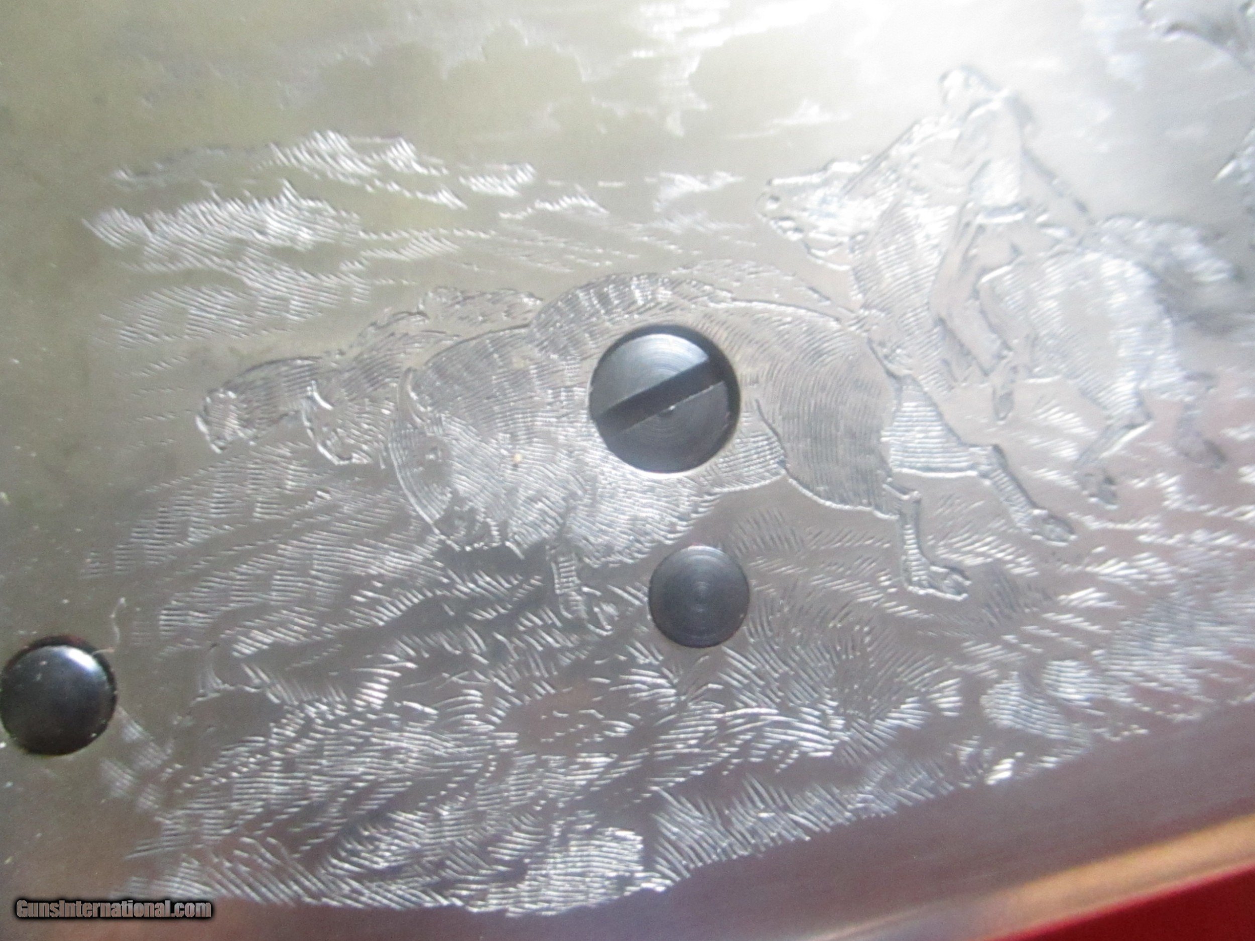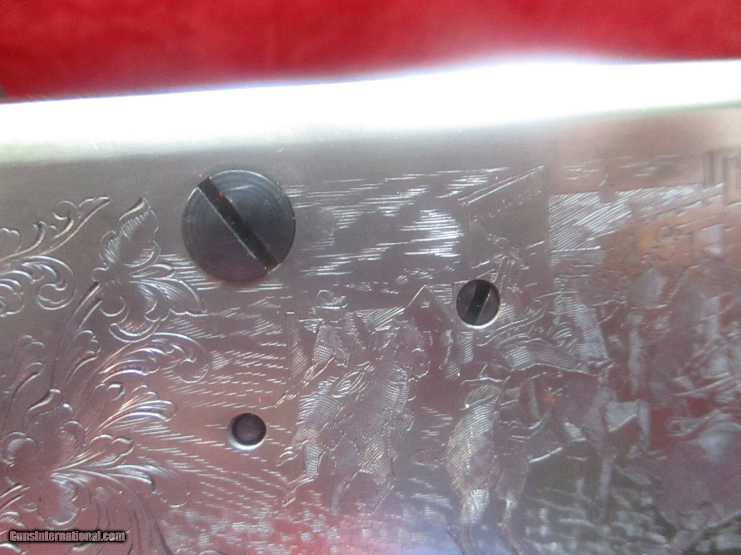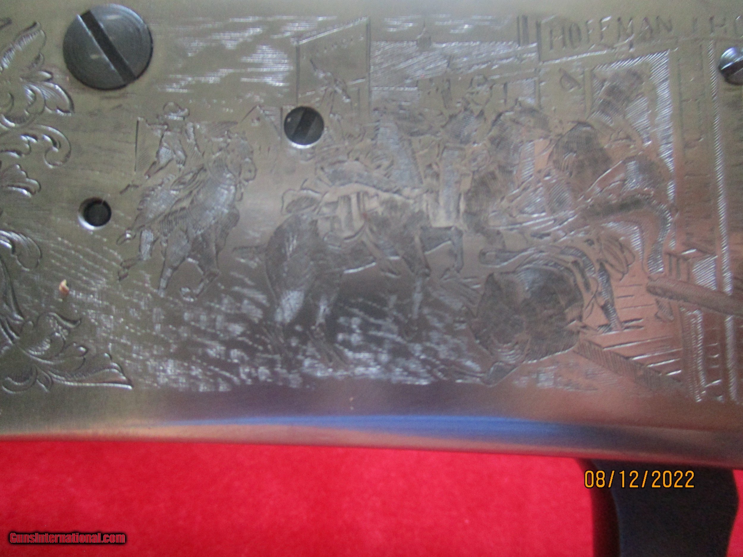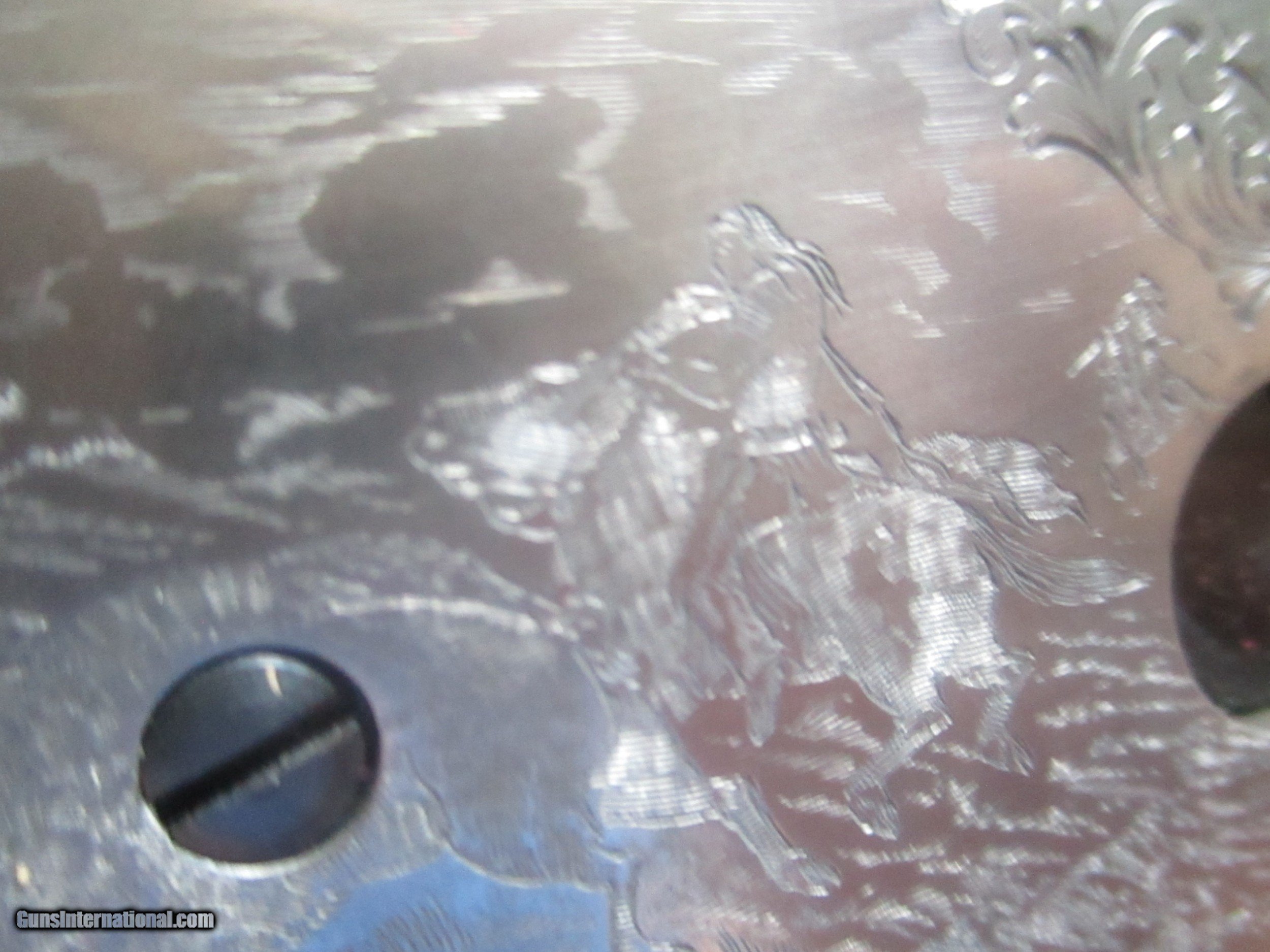 Description: 20" rd' silver banded bbl., hooded bead front, semi-buckhorn rear, select French walnut straight satin oil stock, checkered butt, , extended forearm w/silver end band, bbl. rt. side engraved 'Great Western Artists', all accessories are old silver plated, receiver, rt. side features Russells' "In without Knocking" hand Bolino styleengraving by Italys' best- Bottega C.Giovanelli, 5 men on horseback entering Old Hoffman Hotel, left side shows scene "Wild Meat for Men", depicting an Indian hunting Buffalo, signature & engraving # appears on same side, 2 pictures enclosed which show same scenes as receiver by Russell,, both engravings are surrounded by English scroll which also adorns upper part of receiver upper tang, surrounding 'Winchester' trade name, all unfired in Italian custom case of winchester fabbbric, leather carry handle & trim, red velvet lined case holds the 2 framed , sighned, & numbered " intaglio" prints taken from the receiver mentioned & described before: manual, warrenty, provanance & as new condition! Very Low Production #65 of 999 mfg.! SOLD |