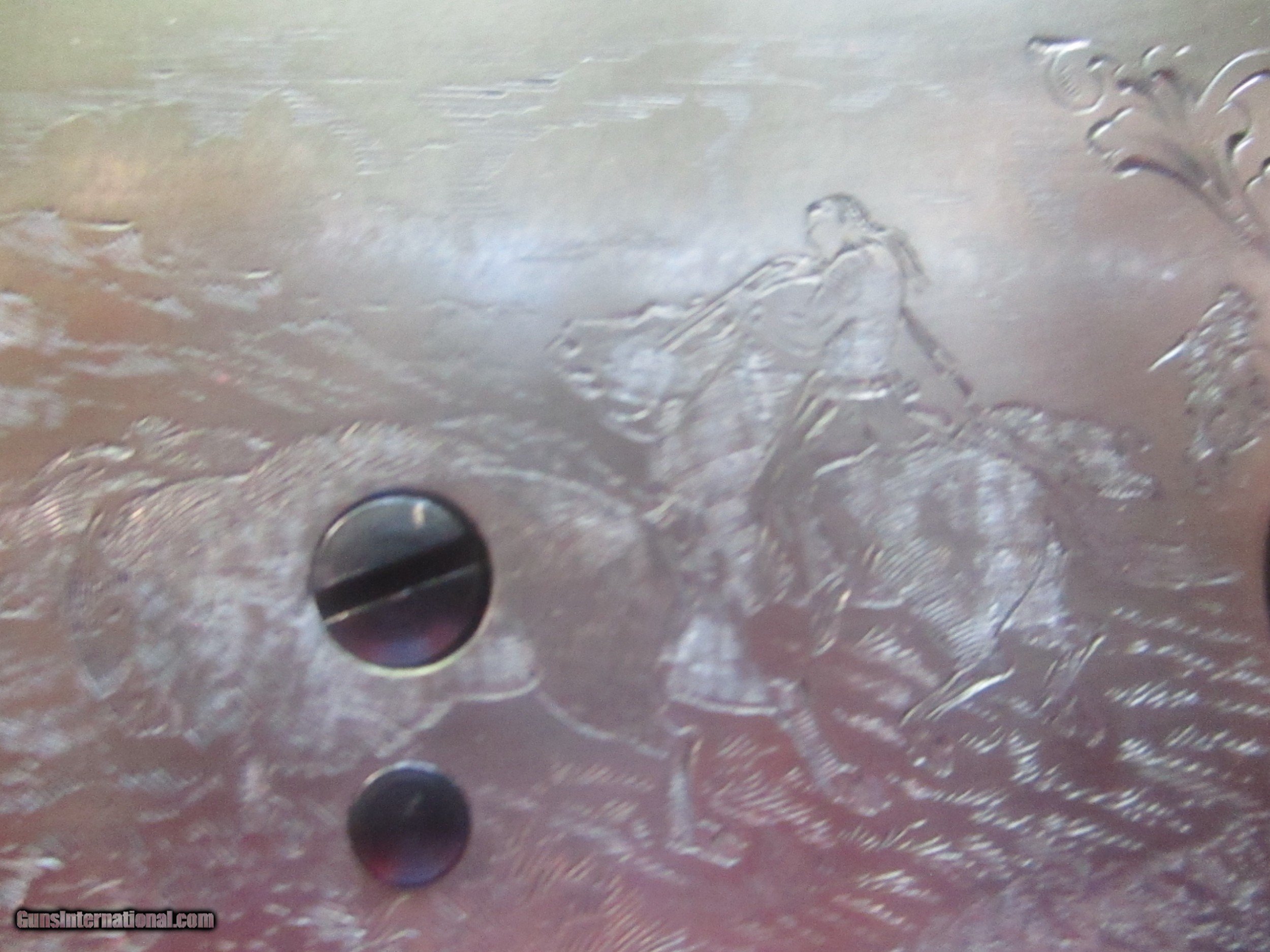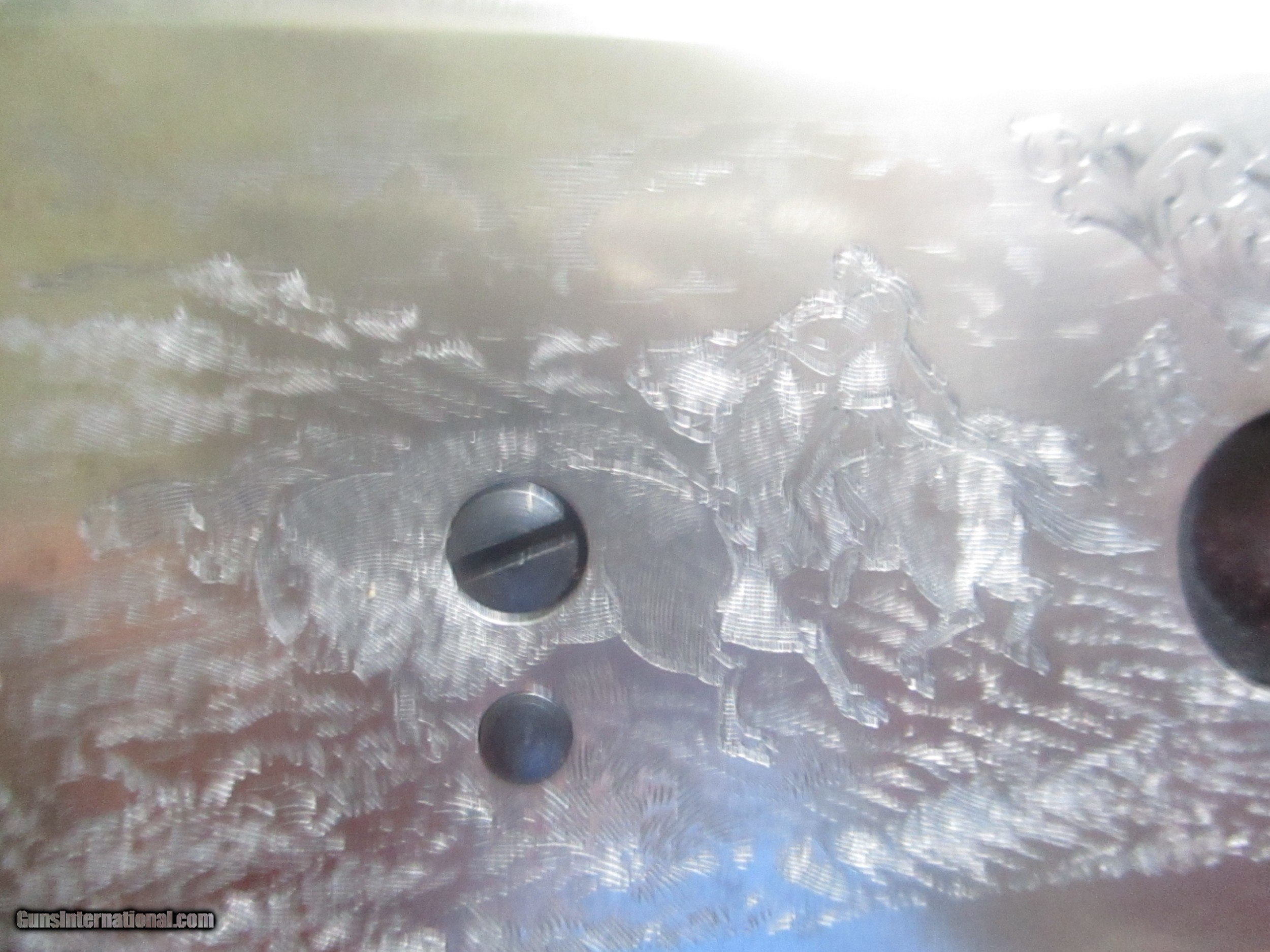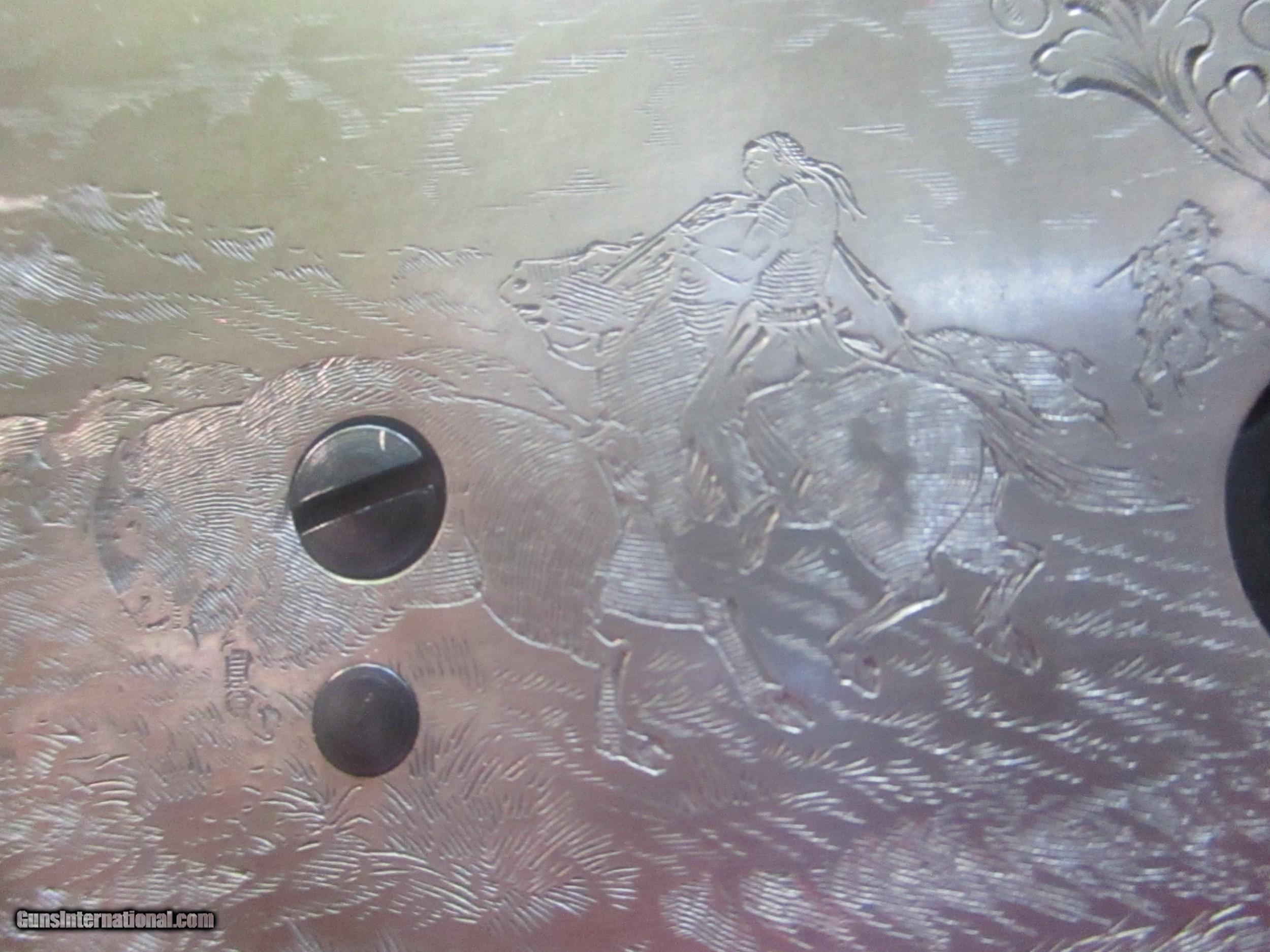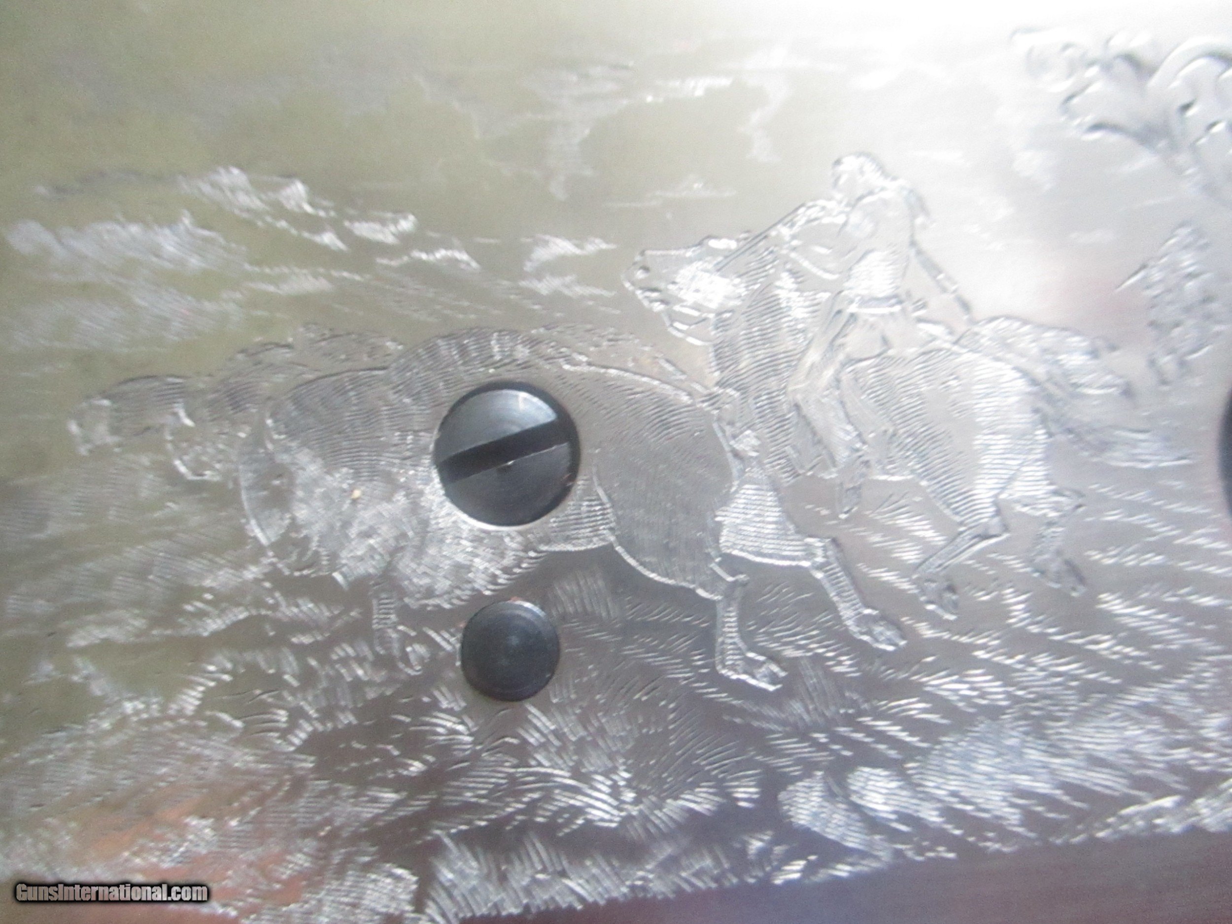 Description: 20" rd' silver banded bbl., hooded bead front, semi-buckhorn rear, select French walnut straight satin oil stock, checkered butt, , extended forearm w/silver end band, bbl. rt. side engraved 'Great Western Artists', all accessories are old silver plated, receiver, rt. side features Russells' "In without Knocking" hand Bolino styleengraving by Italys' best- Bottega C.Giovanelli, 5 men on horseback entering Old Hoffman Hotel, left side shows scene "Wild Meat for Men", depicting an Indian hunting Buffalo, signature & engraving # appears on same side, 2 pictures enclosed which show same scenes as receiver by Russell,, both engravings are surrounded by English scroll which also adorns upper part of receiver upper tang, surrounding 'Winchester' trade name, all unfired in Italian custom case of winchester fabbbric, leather carry handle & trim, red velvet lined case holds the 2 framed , sighned, & numbered " intaglio" prints taken from the receiver mentioned & described before: manual, warrenty, provanance & as new condition! Very Low Production #65 of 999 mfg.! SOLD |