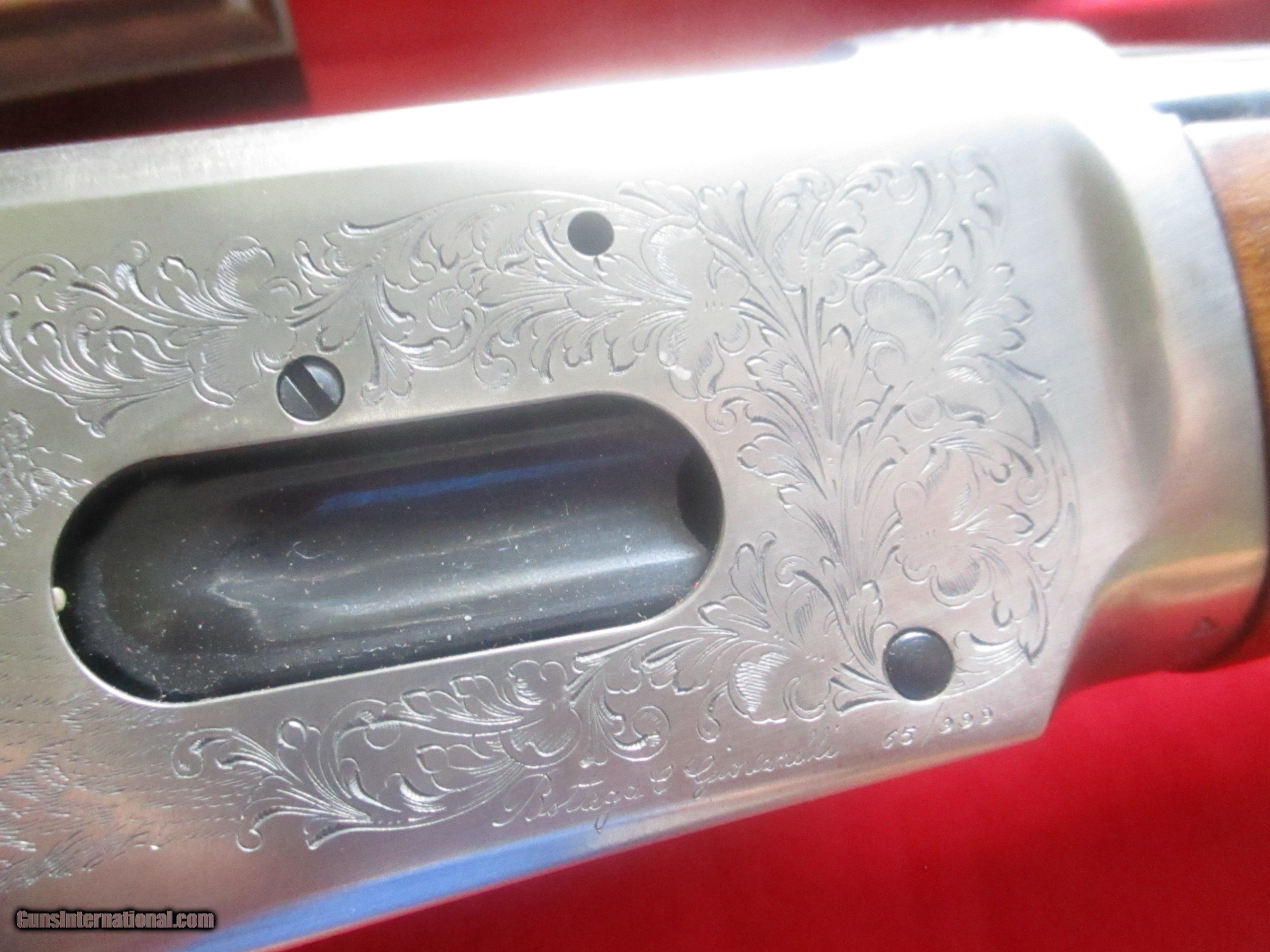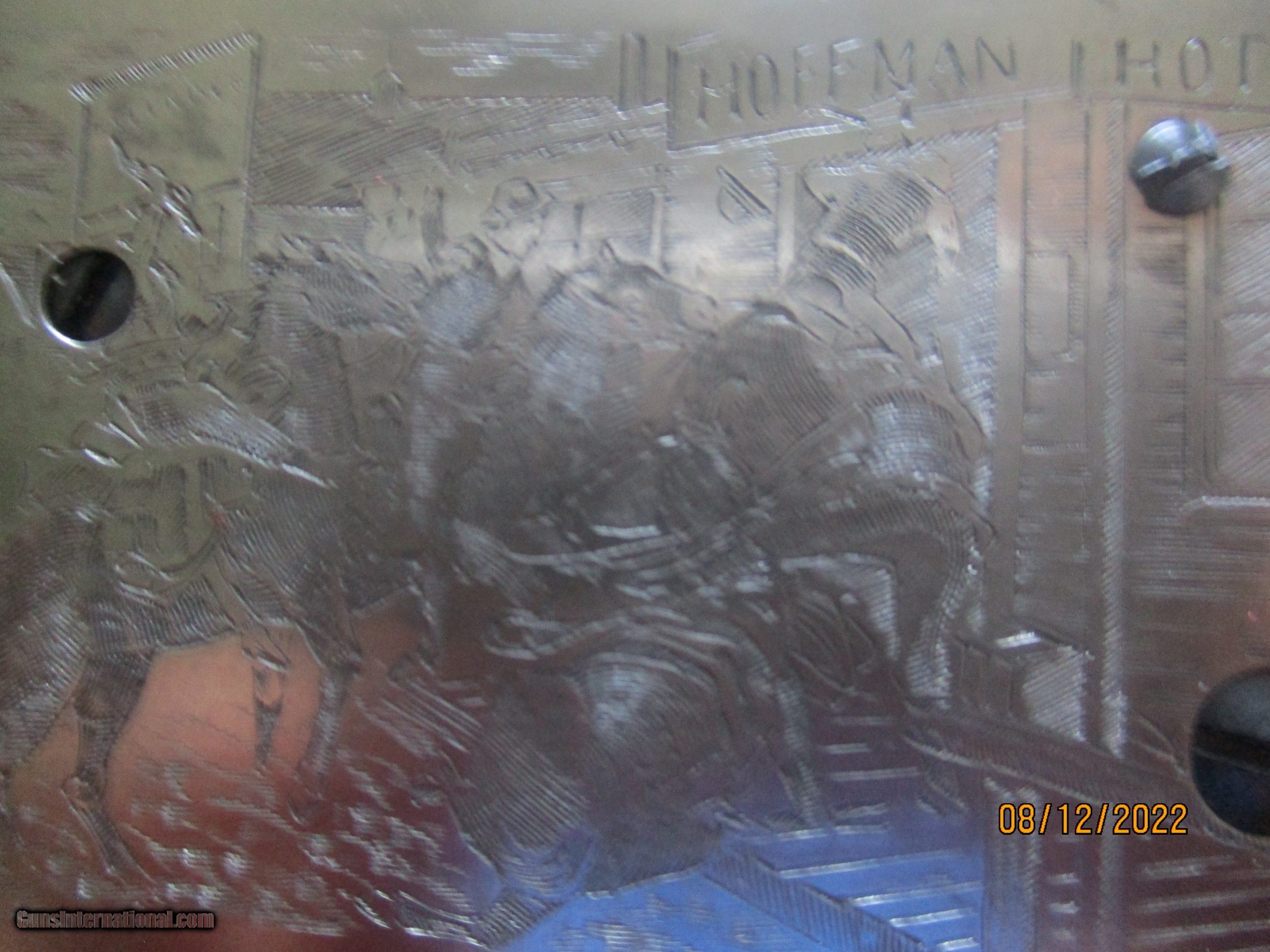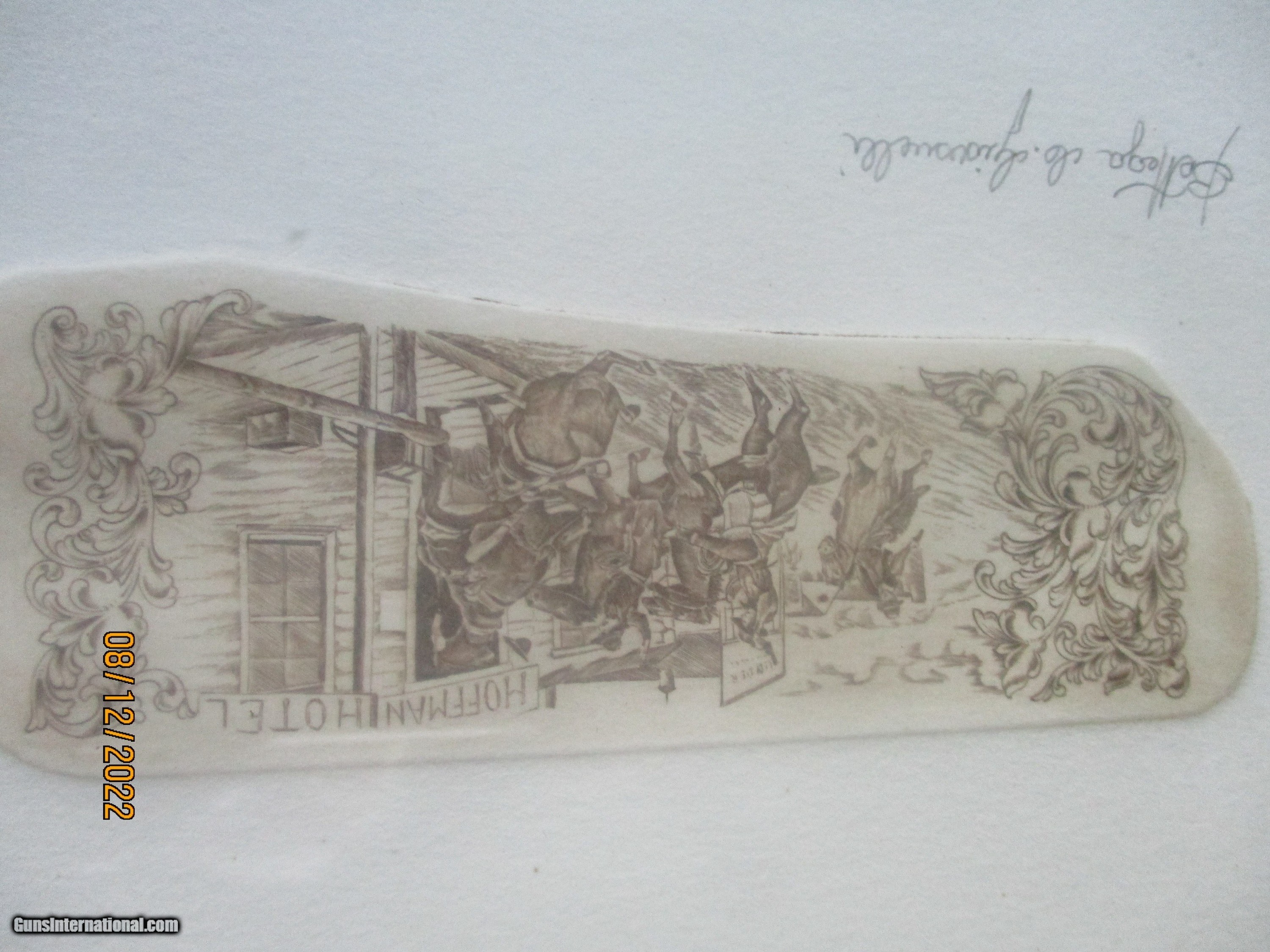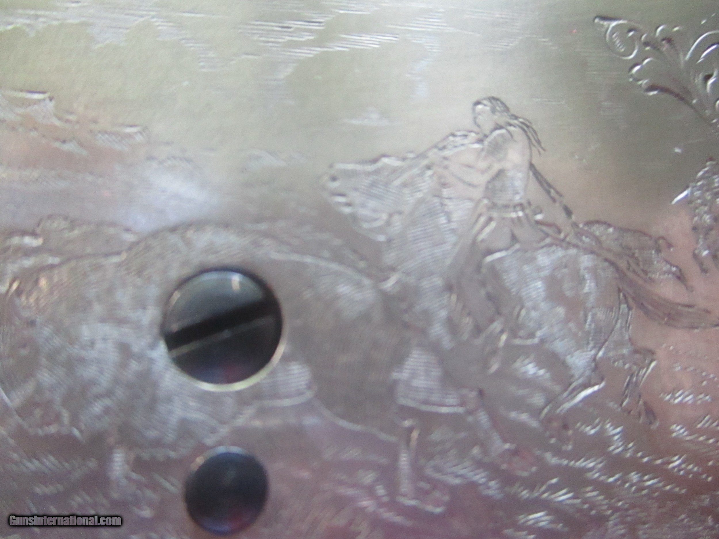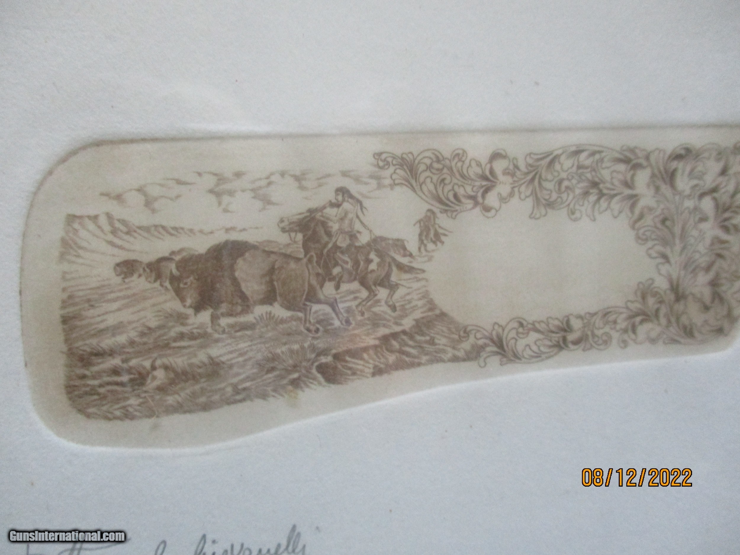 Description: 20" rd' silver banded bbl., hooded bead front, semi-buckhorn rear, select French walnut straight satin oil stock, checkered butt, , extended forearm w/silver end band, bbl. rt. side engraved 'Great Western Artists', all accessories are old silver plated, receiver, rt. side features Russells' "In without Knocking" hand Bolino styleengraving by Italys' best- Bottega C.Giovanelli, 5 men on horseback entering Old Hoffman Hotel, left side shows scene "Wild Meat for Men", depicting an Indian hunting Buffalo, signature & engraving # appears on same side, 2 pictures enclosed which show same scenes as receiver by Russell,, both engravings are surrounded by English scroll which also adorns upper part of receiver upper tang, surrounding 'Winchester' trade name, all unfired in Italian custom case of winchester fabbbric, leather carry handle & trim, red velvet lined case holds the 2 framed , sighned, & numbered " intaglio" prints taken from the receiver mentioned & described before: manual, warrenty, provanance & as new condition! Very Low Production #65 of 999 mfg.! SOLD |