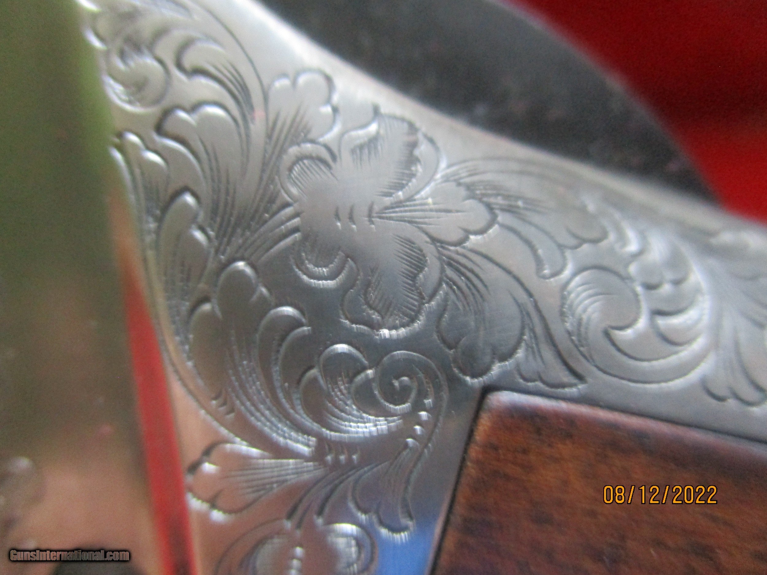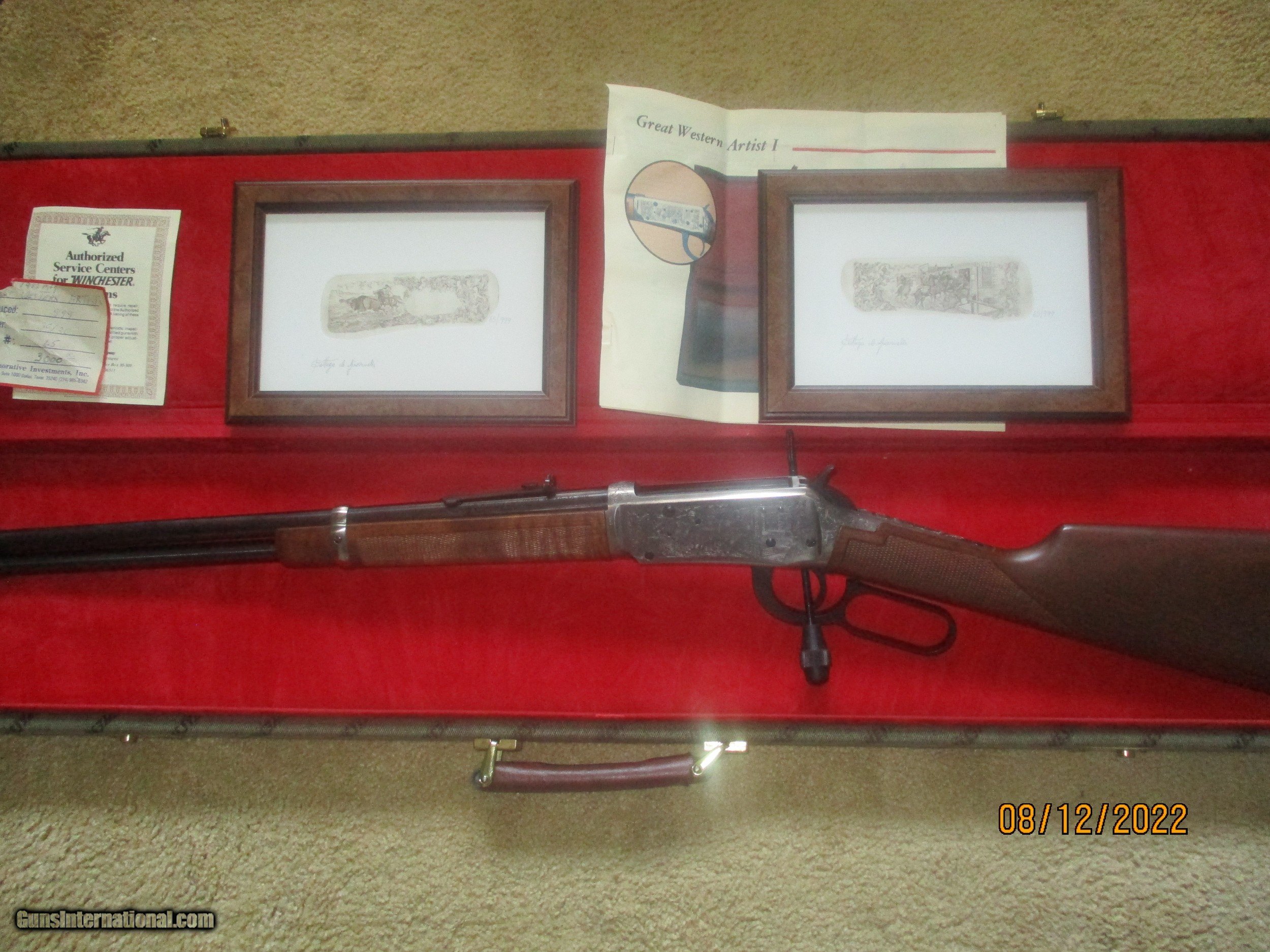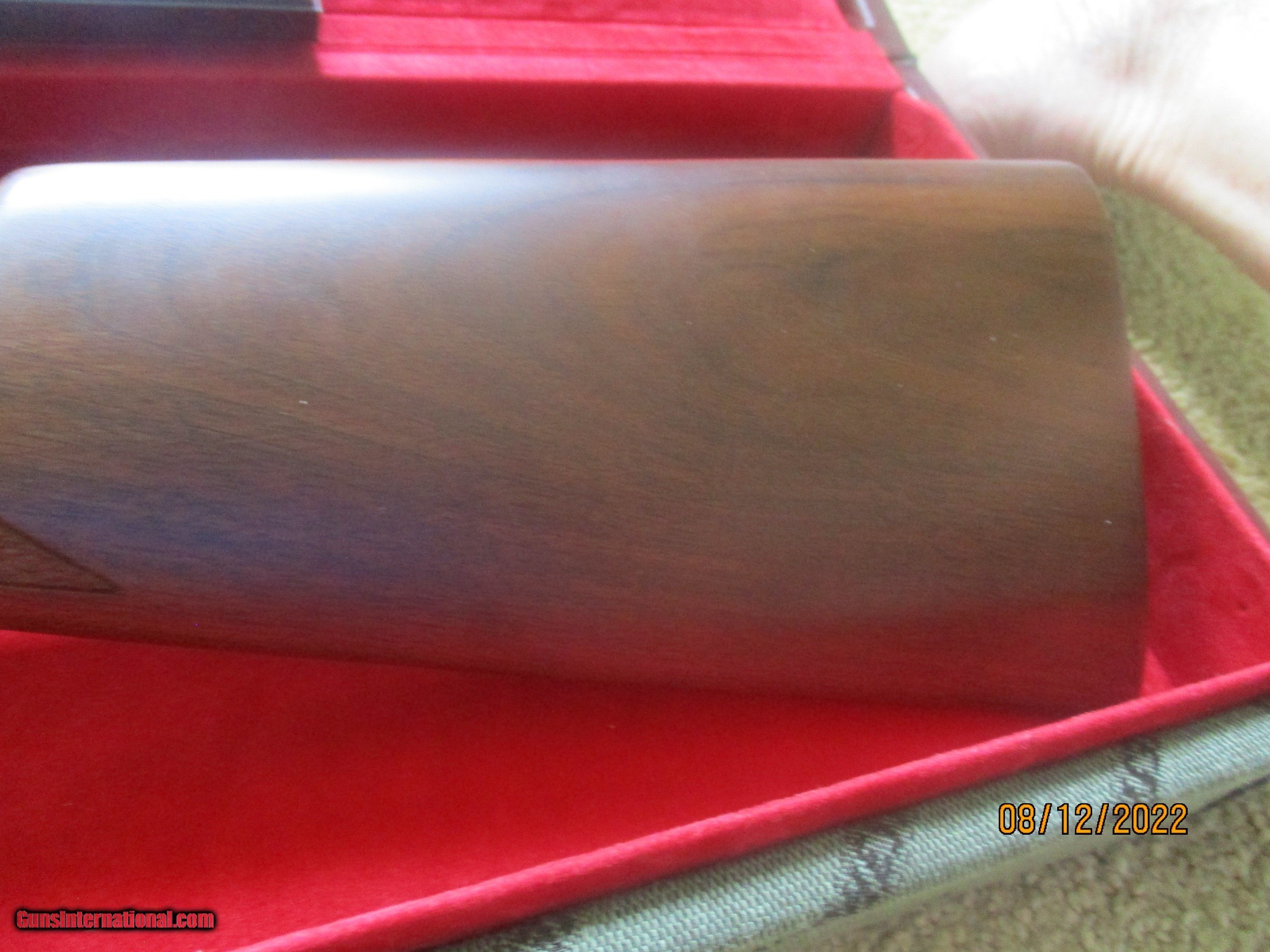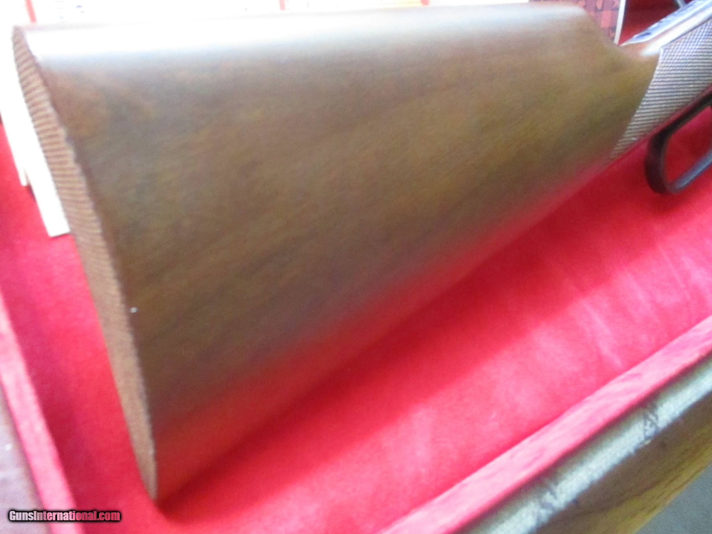 Description: 20" rd' silver banded bbl., hooded bead front, semi-buckhorn rear, select French walnut straight satin oil stock, checkered butt, , extended forearm w/silver end band, bbl. rt. side engraved 'Great Western Artists', all accessories are old silver plated, receiver, rt. side features Russells' "In without Knocking" hand Bolino styleengraving by Italys' best- Bottega C.Giovanelli, 5 men on horseback entering Old Hoffman Hotel, left side shows scene "Wild Meat for Men", depicting an Indian hunting Buffalo, signature & engraving # appears on same side, 2 pictures enclosed which show same scenes as receiver by Russell,, both engravings are surrounded by English scroll which also adorns upper part of receiver upper tang, surrounding 'Winchester' trade name, all unfired in Italian custom case of winchester fabbbric, leather carry handle & trim, red velvet lined case holds the 2 framed , sighned, & numbered " intaglio" prints taken from the receiver mentioned & described before: manual, warrenty, provanance & as new condition! Very Low Production #65 of 999 mfg.! SOLD |