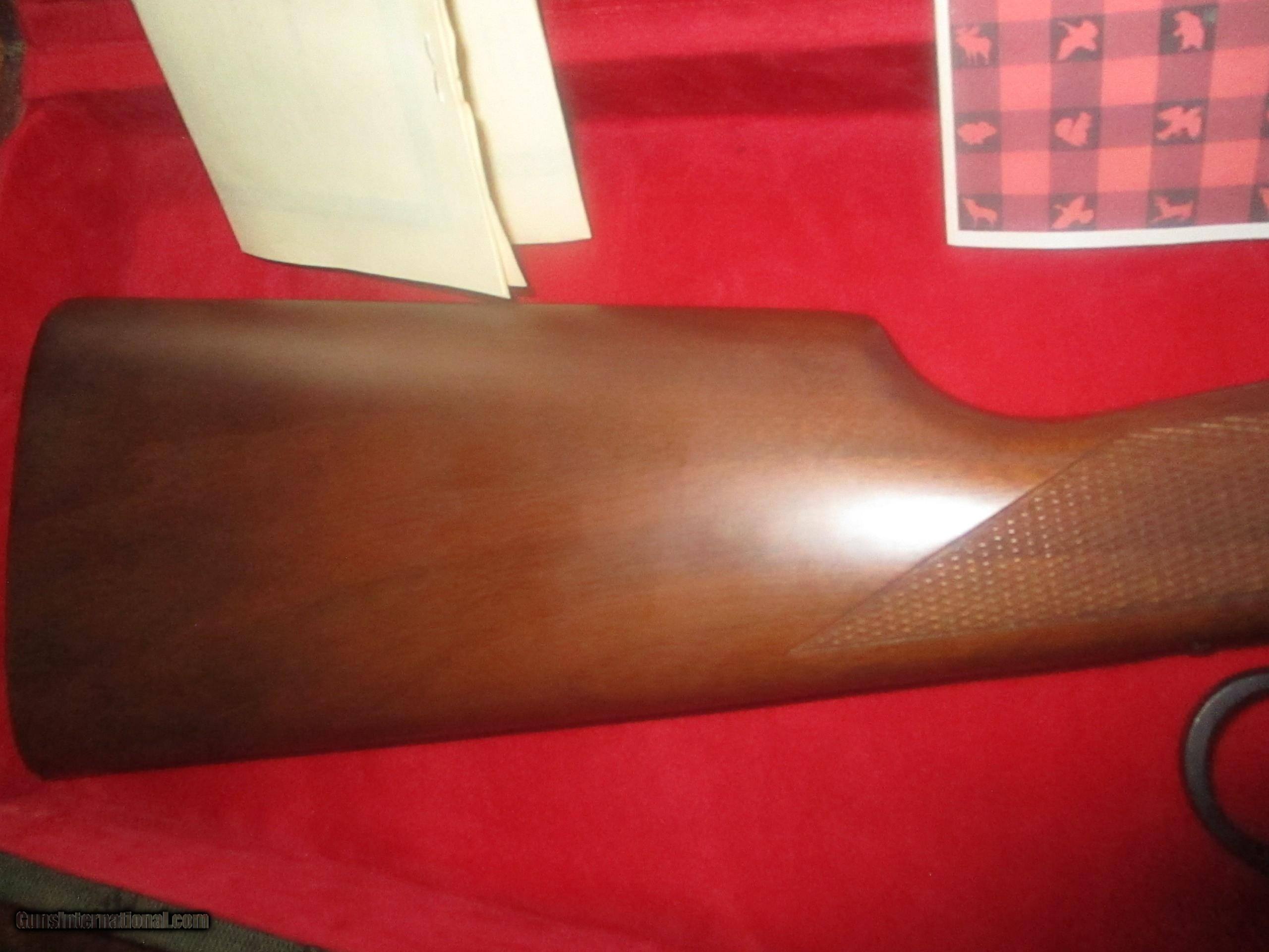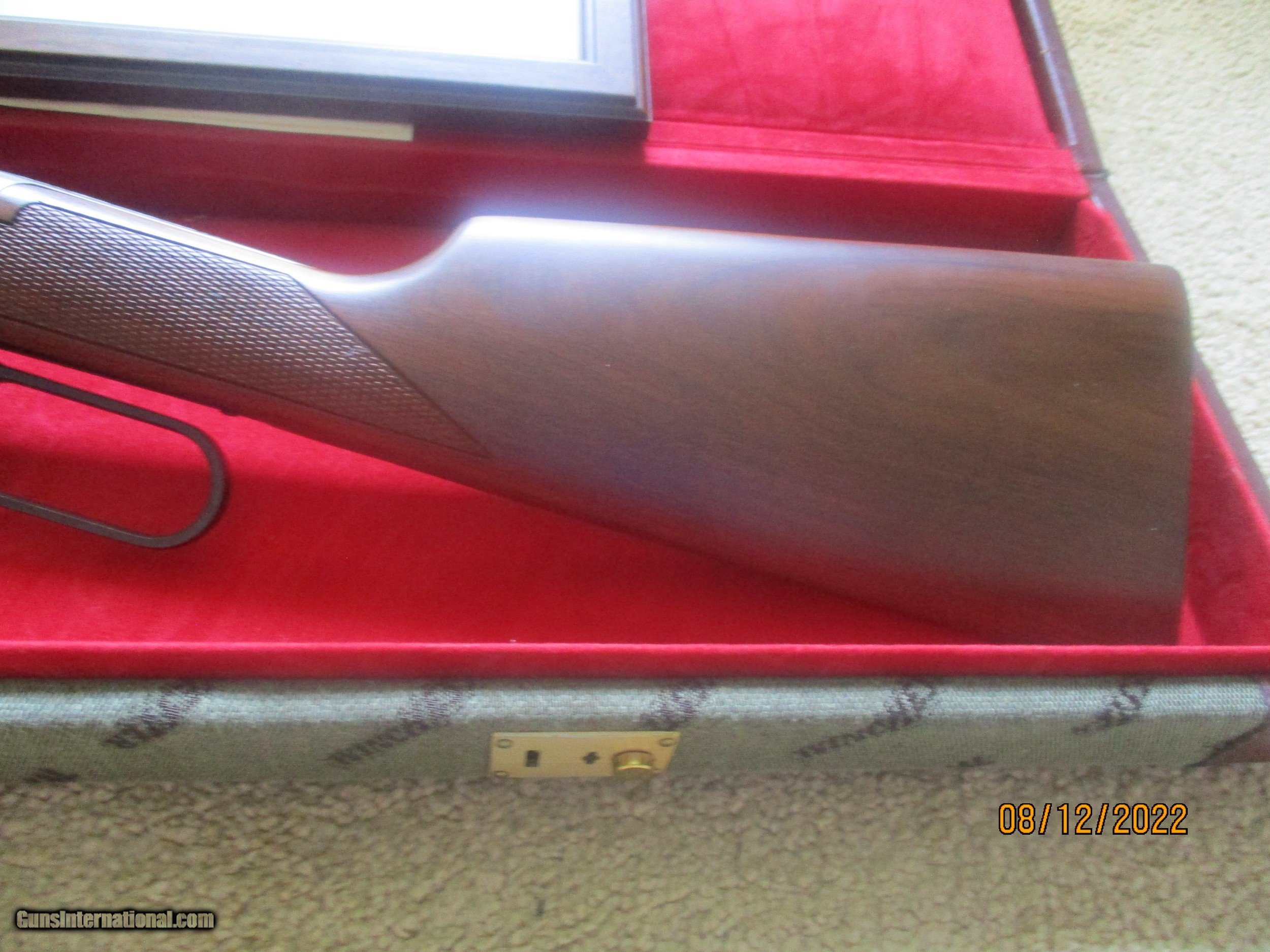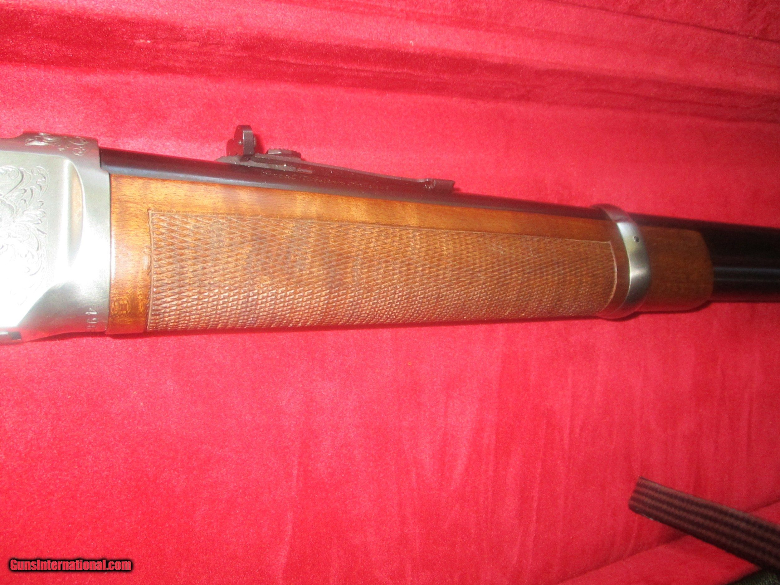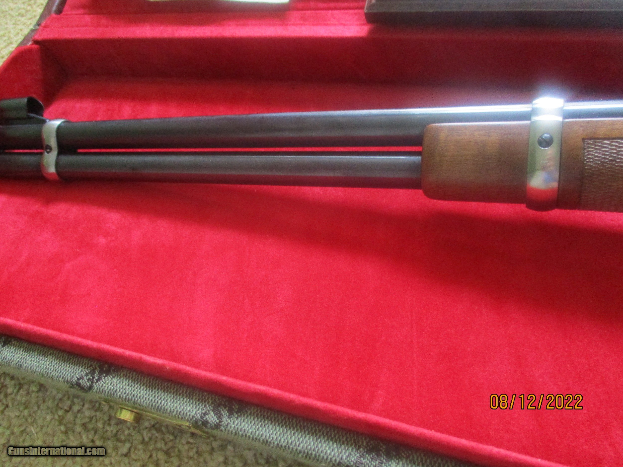 Description: 20" rd' silver banded bbl., hooded bead front, semi-buckhorn rear, select French walnut straight satin oil stock, checkered butt, , extended forearm w/silver end band, bbl. rt. side engraved 'Great Western Artists', all accessories are old silver plated, receiver, rt. side features Russells' "In without Knocking" hand Bolino styleengraving by Italys' best- Bottega C.Giovanelli, 5 men on horseback entering Old Hoffman Hotel, left side shows scene "Wild Meat for Men", depicting an Indian hunting Buffalo, signature & engraving # appears on same side, 2 pictures enclosed which show same scenes as receiver by Russell,, both engravings are surrounded by English scroll which also adorns upper part of receiver upper tang, surrounding 'Winchester' trade name, all unfired in Italian custom case of winchester fabbbric, leather carry handle & trim, red velvet lined case holds the 2 framed , sighned, & numbered " intaglio" prints taken from the receiver mentioned & described before: manual, warrenty, provanance & as new condition! Very Low Production #65 of 999 mfg.! SOLD |