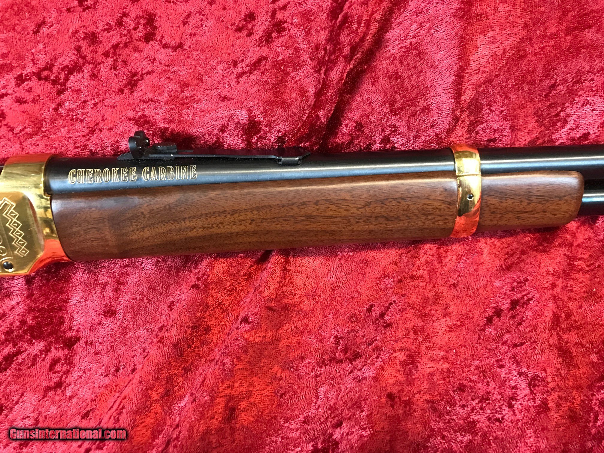 Description: This Winchester 94 Cherokee Carbine in .30-30 comes complete with the original box! Receiver, carbine butt plate, magazine cap, and barrel bands are richly plated in gold, with the balance of the gun's metal surfaces deeply blued. Receiver is engraved with a depiction of the Trail of Tears on the left side and a the image of a standing Cherokee warrior on the right. This saddle ring carbine is also equipped with a clever and handy 4-round cartridge trap in the toe of the butt stock. A stunning collectable Winchester in fantastic shape! SOLD Manufacturer: Winchester Model: 94 Cherokee Carbine Caliber Info: .30-30 |