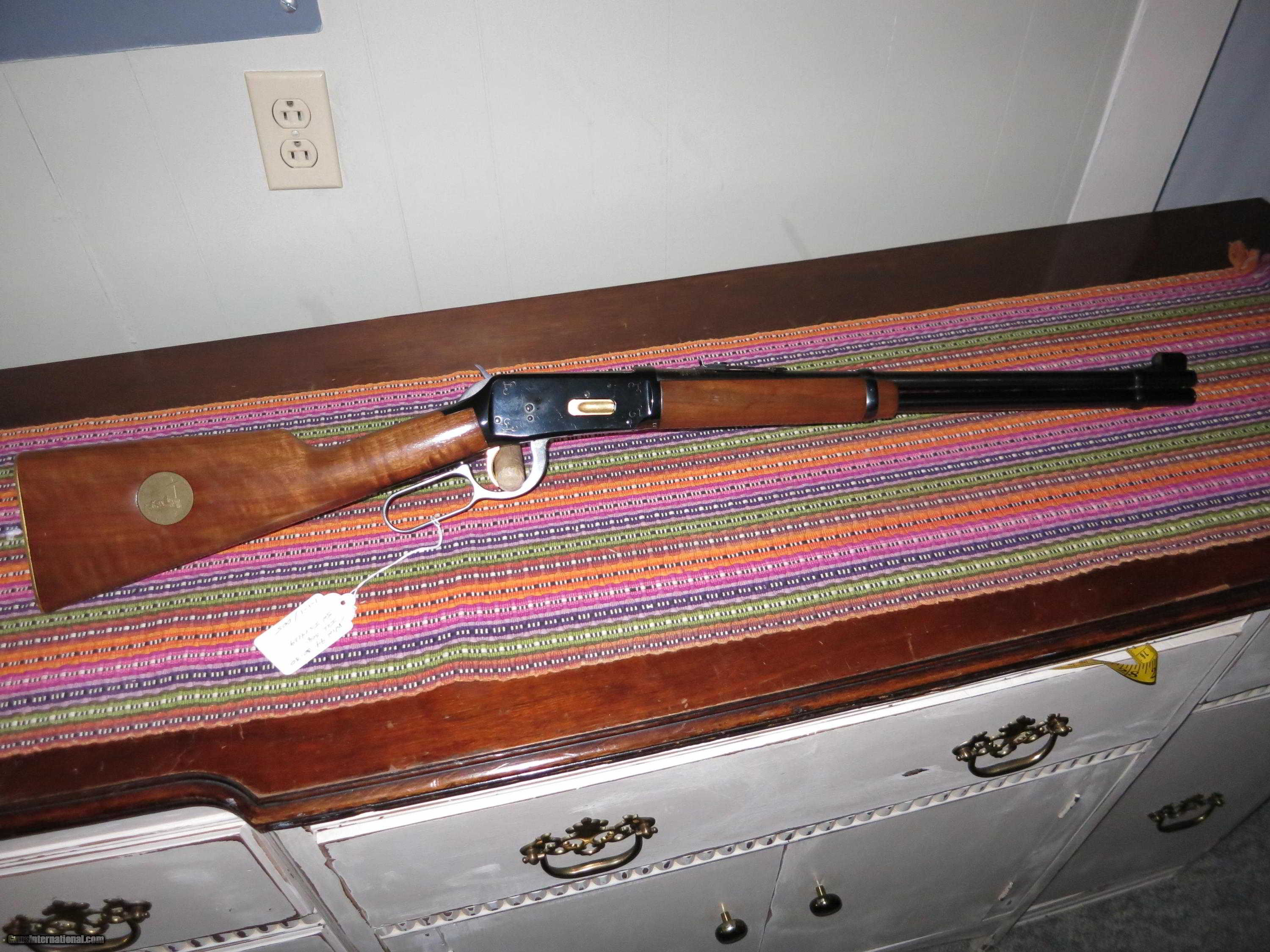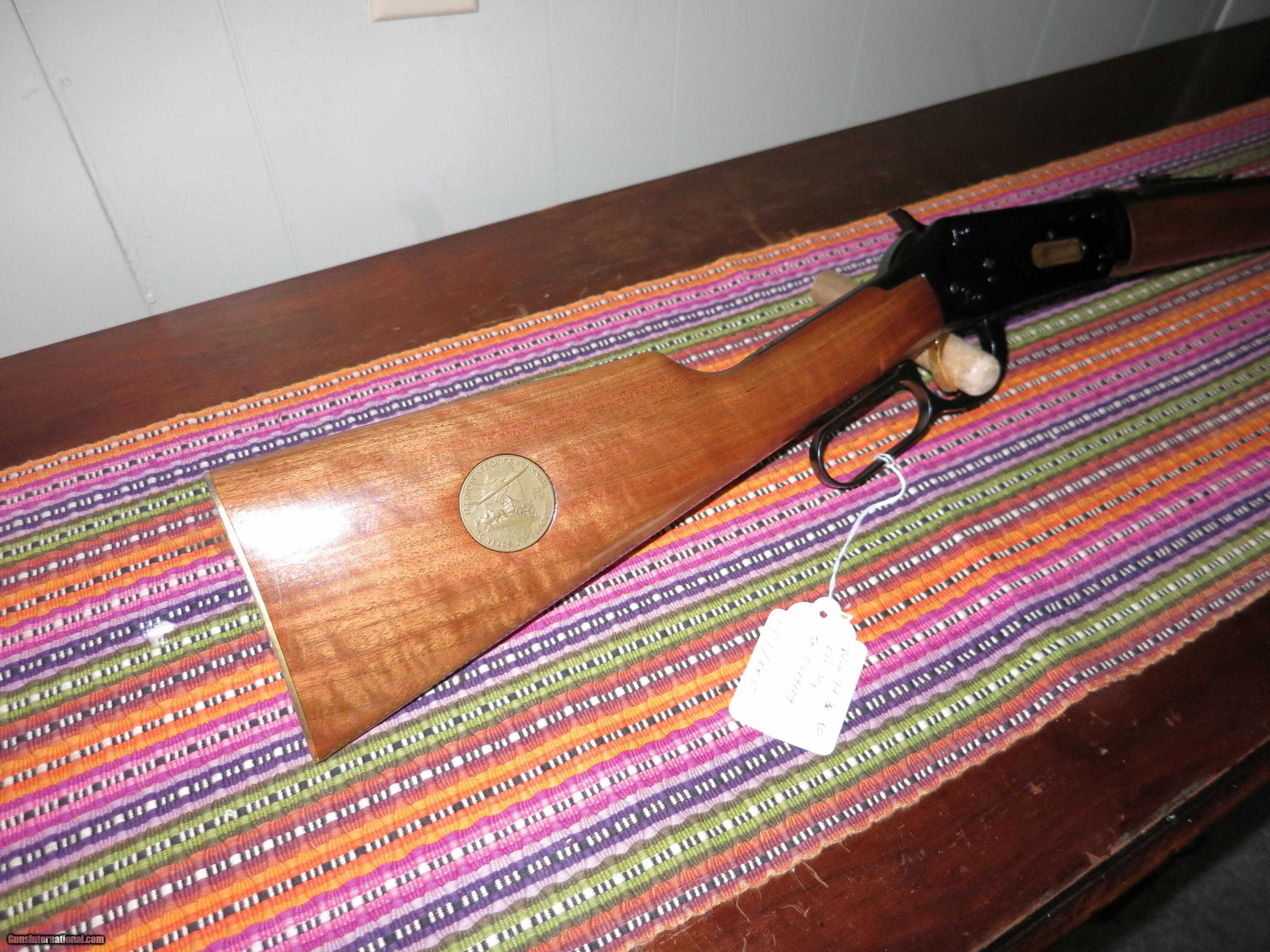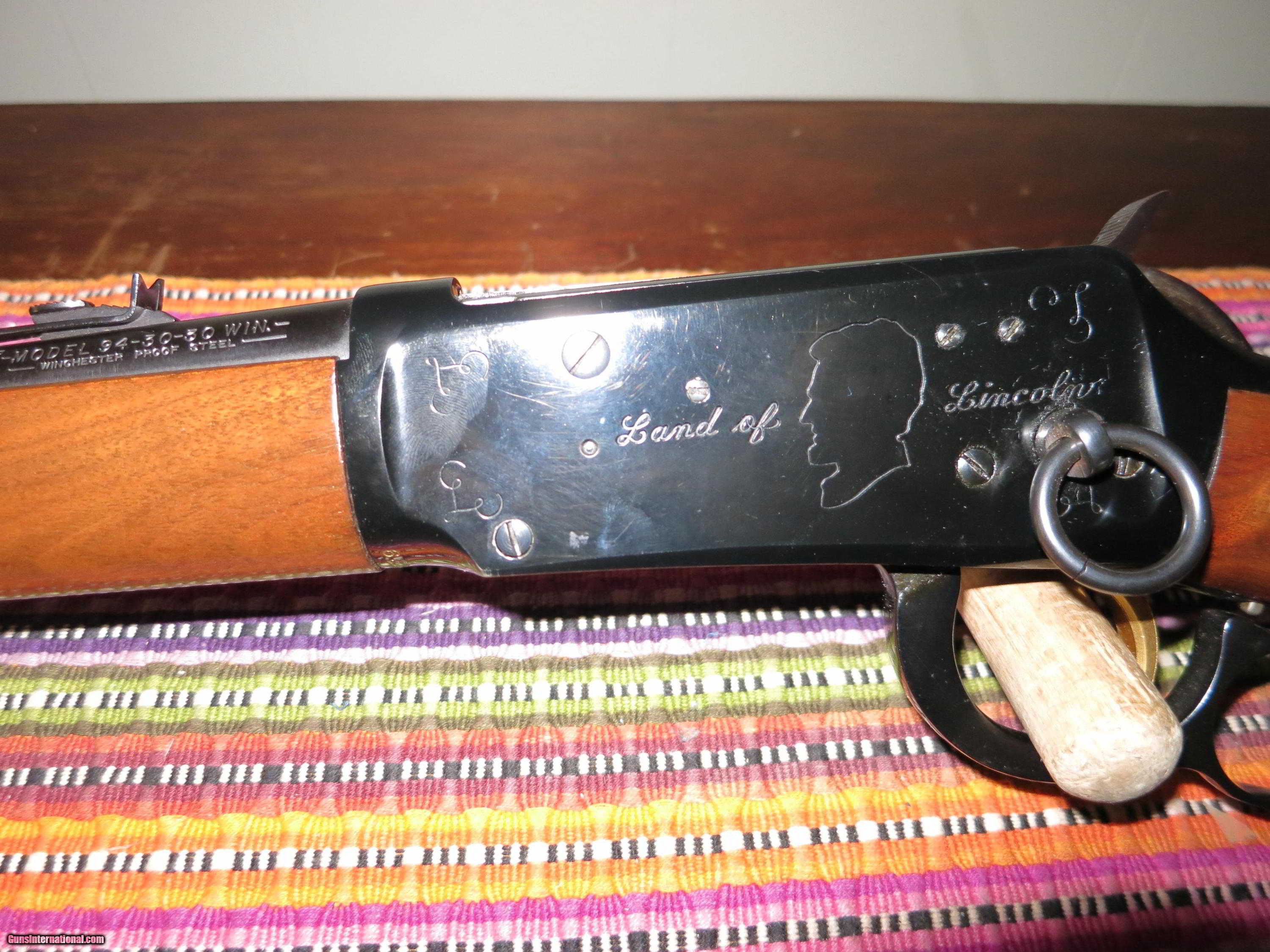 Description: WINCHESTER MODEL 94 ILLINOIS SEQUICENTENNIAL. 30-30 CAL. WITH 20" CARBINE BARREL. GUN IS IN EXCELLENT CONDITION, WOOD & BLUE. ENGRAVED WITH LAND OF LINCOLN & HIS PICTURE. SRC, WITH GOLD TRIGGER & BUTT PLATE. REALLY NICE, SORRY NO BOX. CALL OR E-MAIL WITH QUESTIONS. SOLD |