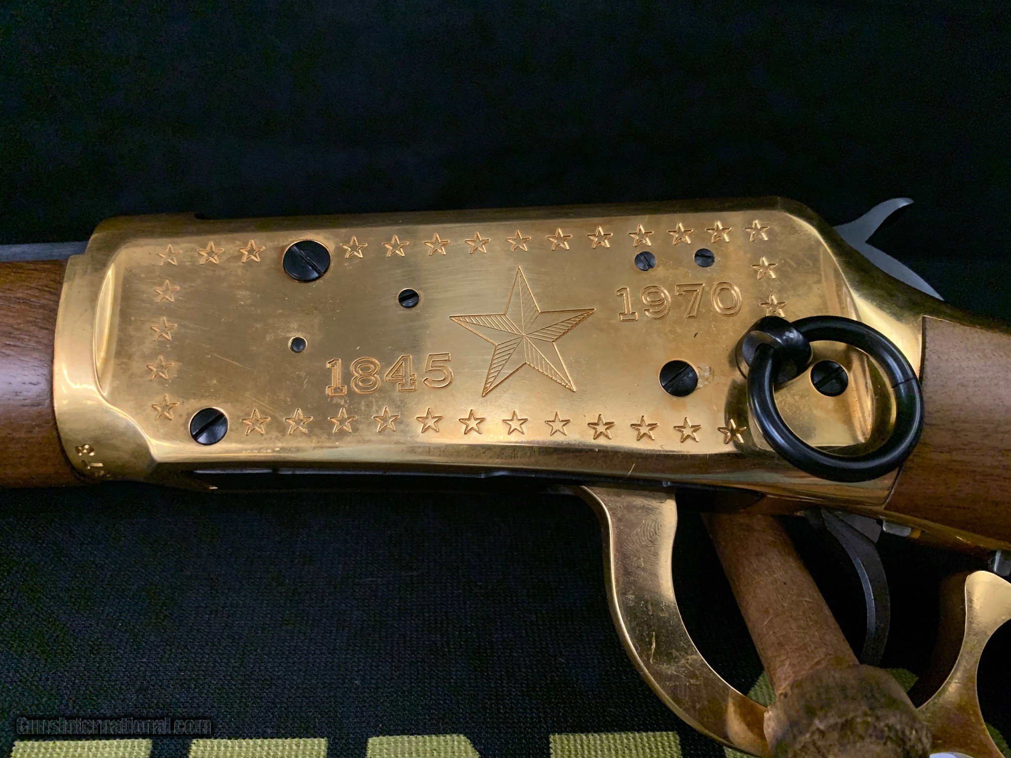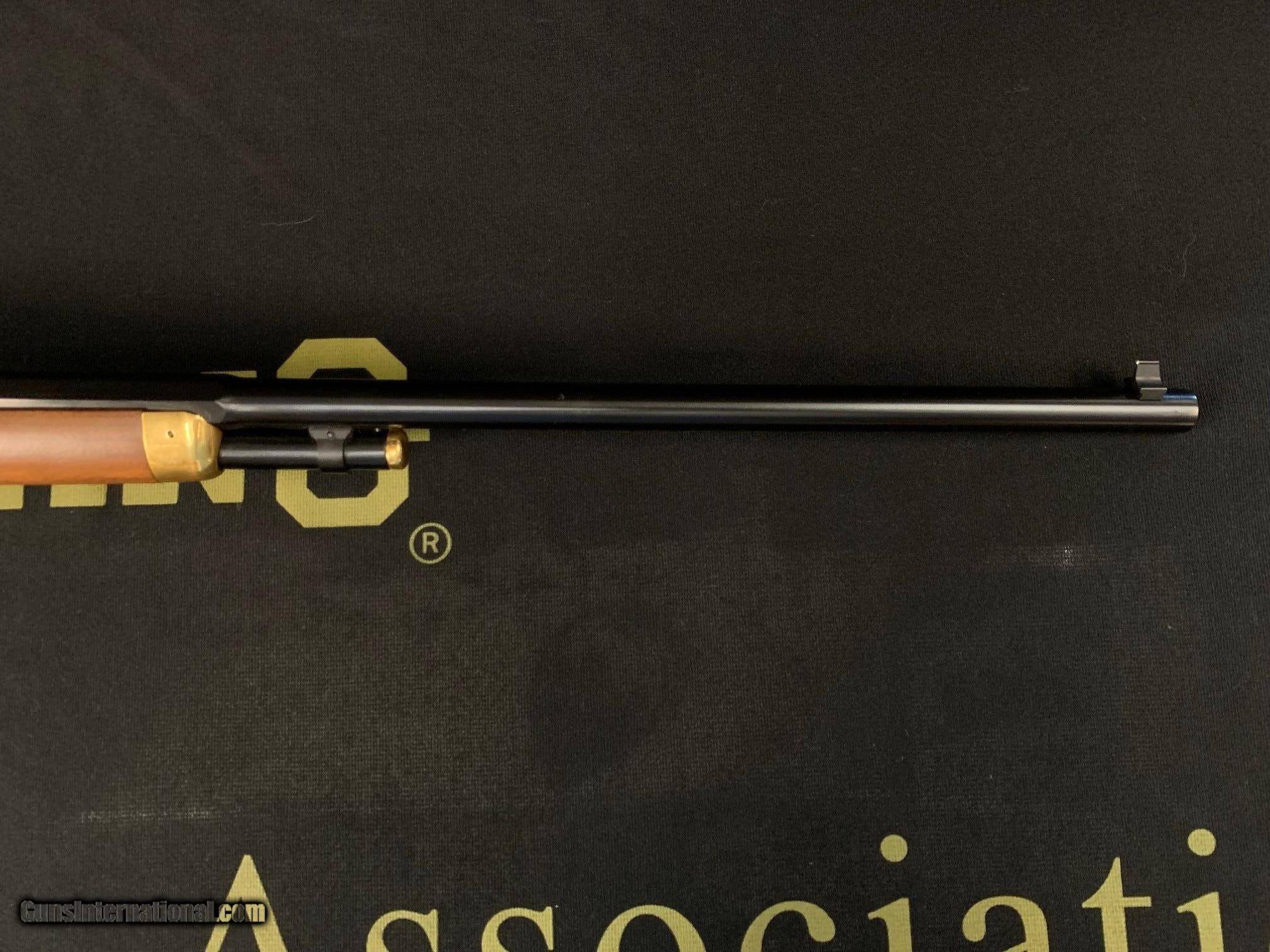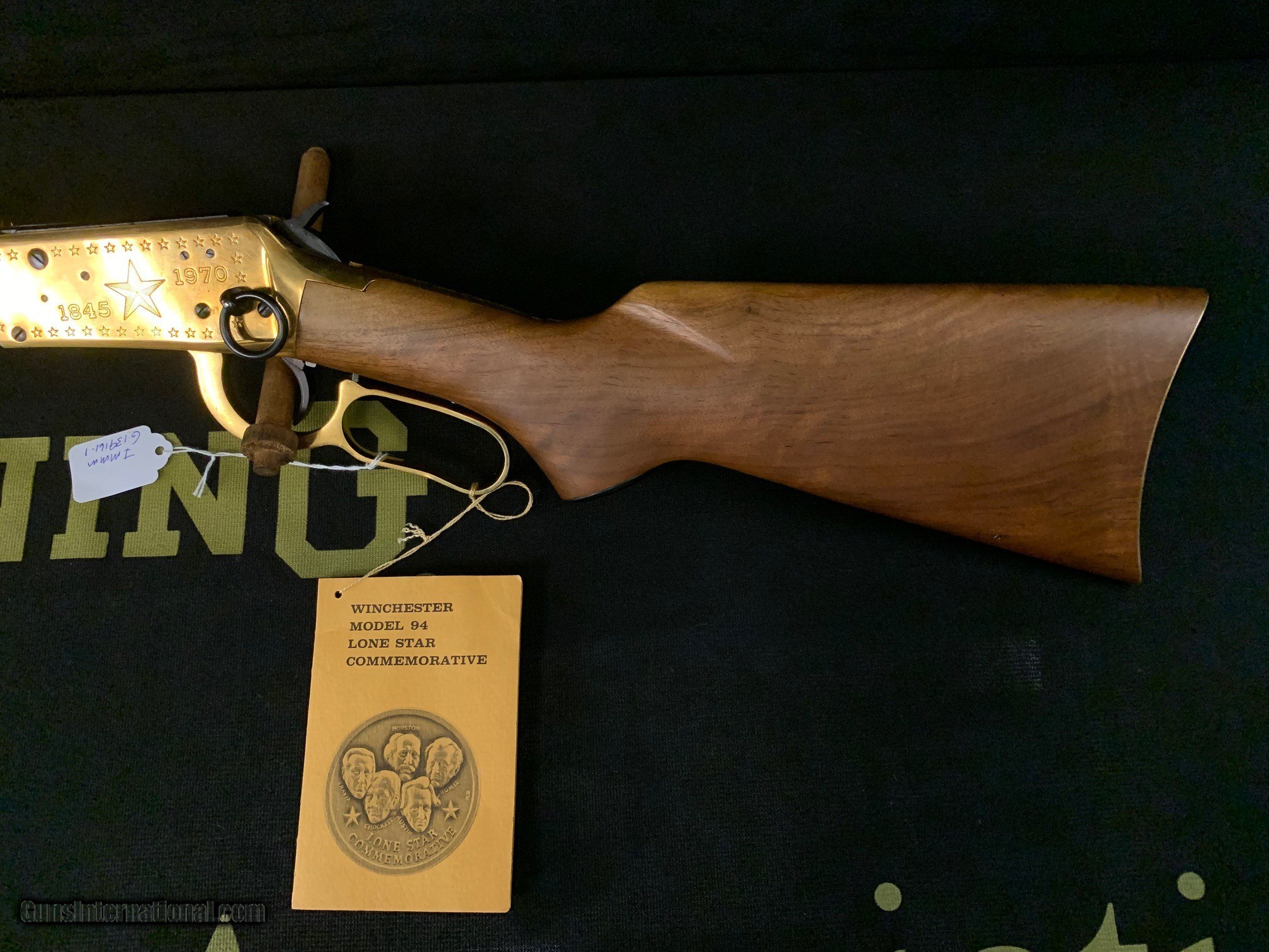 Description: This Winchester 94 Lone Star Commemorative is a lever action rifle which fires the .30-30 round. It has a gold receiver with a blued 26" roundhalf octagon barrel. This rifle was manufactured in 1970 to commemorate Texas, with only 55,259 produced (total rifles & carbines). It has an adjustable rear sight and a saddle ring. Gold highlights include the receiver with engraved stars, the lever, the cap on the magazine tube, the fore tip, and the curved butt plate. This rifle has a Lone Star Commemorative medallion in the stock and etchings which include: TEXAS, 1, and Under Six Flags. Absolutely beautiful gun. For more information about this rifle or for purchasing ((( PLEASE GIVE US A CALL AT ))) 1-(479)-968-4106. PRICE - $1,400 + Shipping SOLD Rifle Caliber: .30-30 Winchester Manufacturer: Winchester Model: 94 Serial Number: LS18373 Barrel Length: 26 Condition: 98 % Plus Action: Lever Action Sights: Rifle Sights Manufacture Date: 1970 |