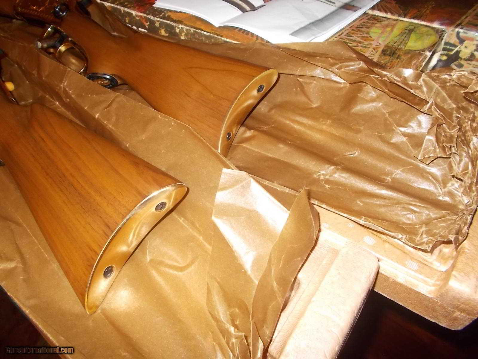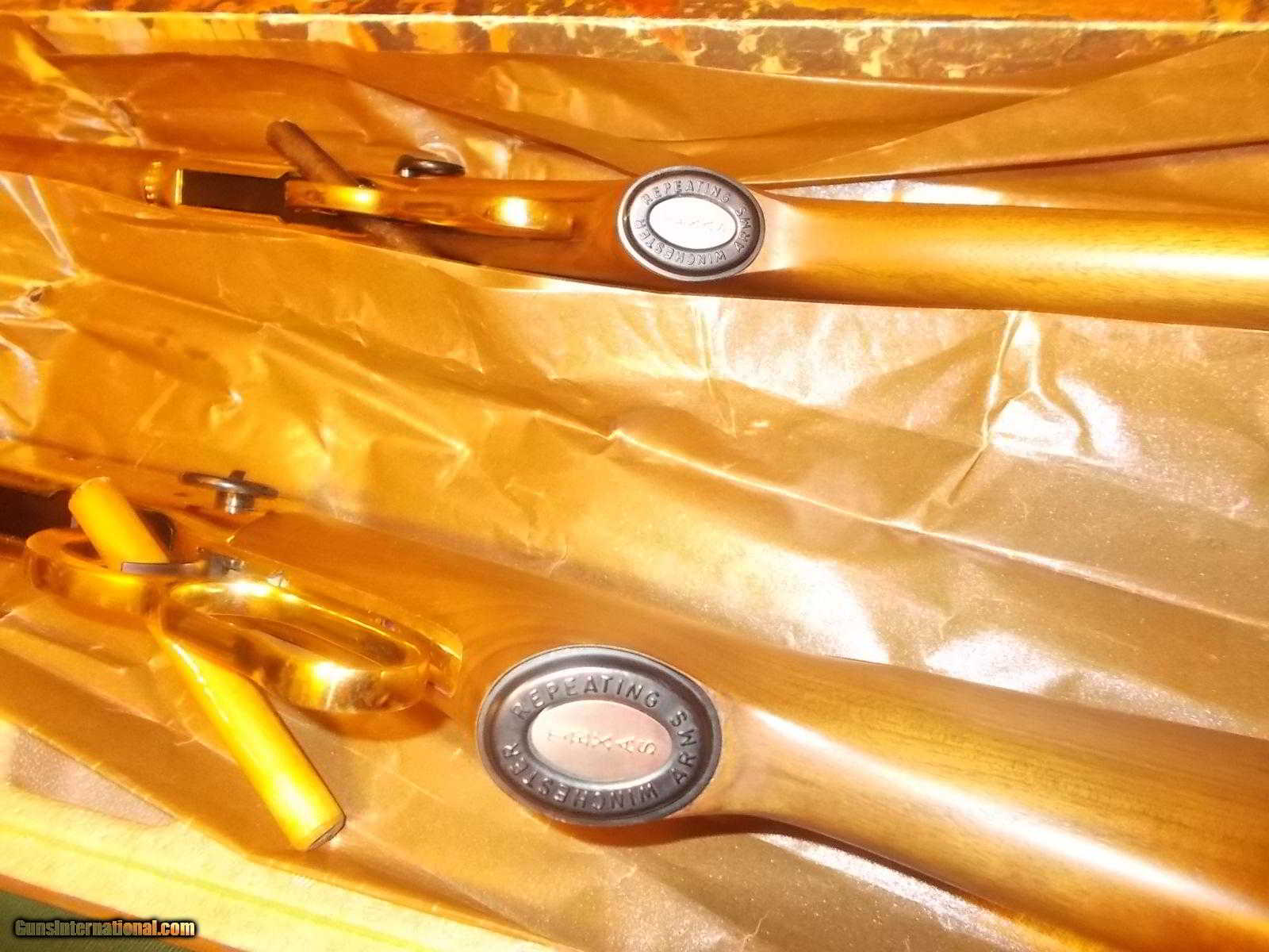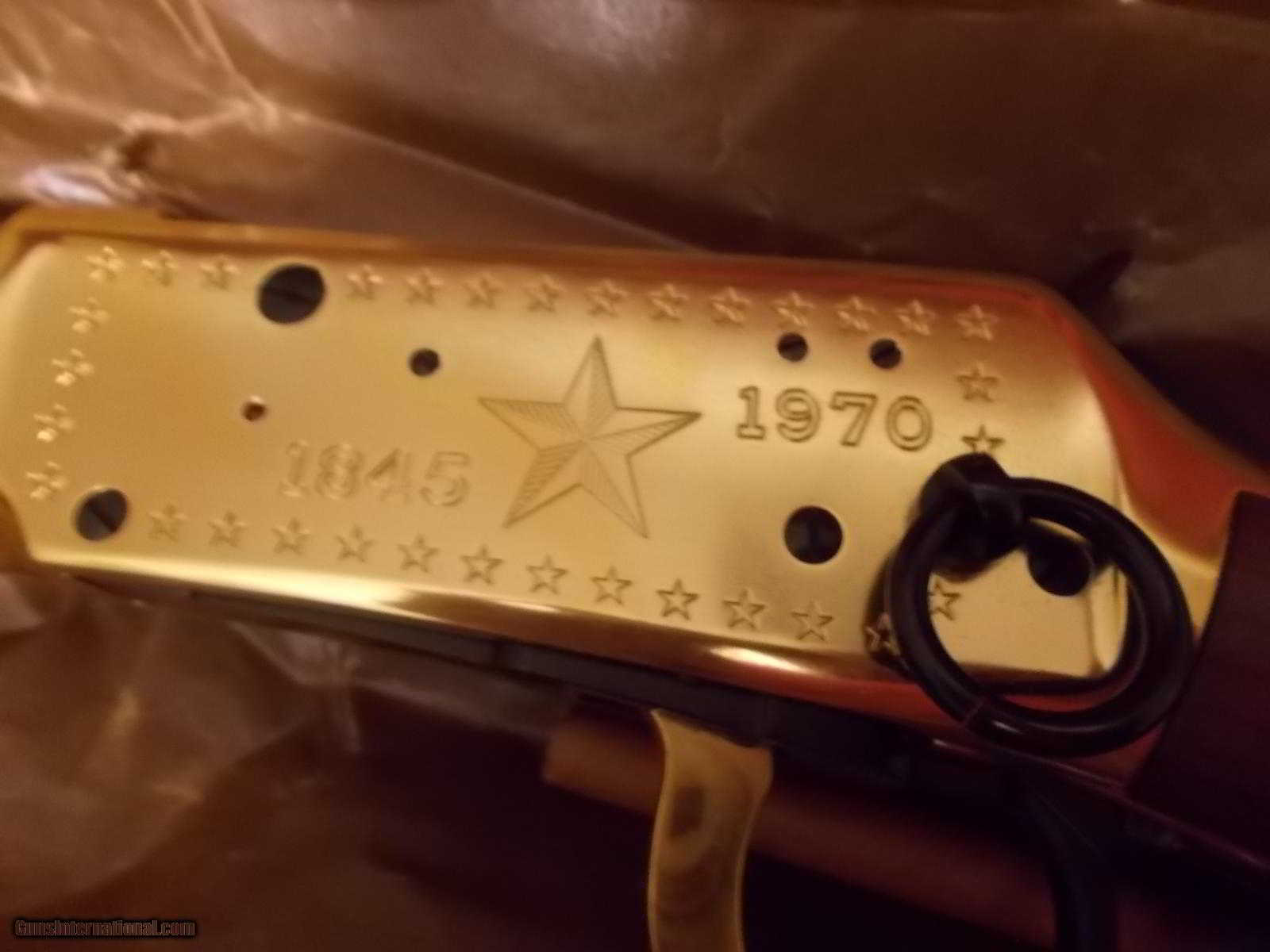 Description: #1 SR Rifle, 30-30, 26" 1/2 rd./ 1/2 octogon bbl., , gold plated receiver, creseant butt & accents, rt. side engraved star flanked by dates of 1845 & 1970, upper tang "Under Six Flags"gold medallion depicts faces & names of Sam Houston,Stephen F. Austin, Col. Wm. Barret Travis, Jim Bowie, & Davey Crockett with medallion embedded rt. side, stock - #2 Saddle Ring Carbine, 30-30, 20" 1/2 rd. 1/2 octogon bbl., gold receiver, engraved with same as rifle bordered by stars, top tang has same 6 Stars engraved, enclosed is picture all pertinant info. & both 94 rifle & carbine tang has "Under Six Flags" engraved, blue saddle rings on both rifle & carbine, Unfired in somewhat frayed boxes with al mentioned Texas info.& pictures, 94 schematics of set, - will sell individually or as a set !!! ea. $950 SOLD |