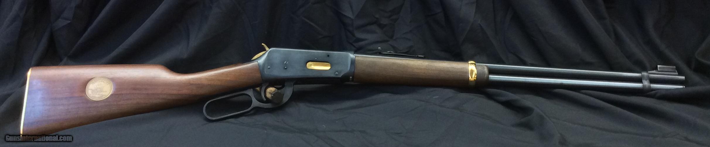 Description: Winchester 94 Nebraska Centennial in 30-30win, 20” barrel, unfired and uncycled. Gold platted butt plate, barrel band, hammer and loading gate. Nebraska centennial medallion mounted on the beautiful walnut stock, with the writing “Welcome to Nebraskaland where the west begins” with the 1867-1967 centennial dates written underneath. 12-round magazine, shrouded front sight and adjustable rear sight. 2,500 manufactured with this one being SN#NC0359. New in box! SOLD |