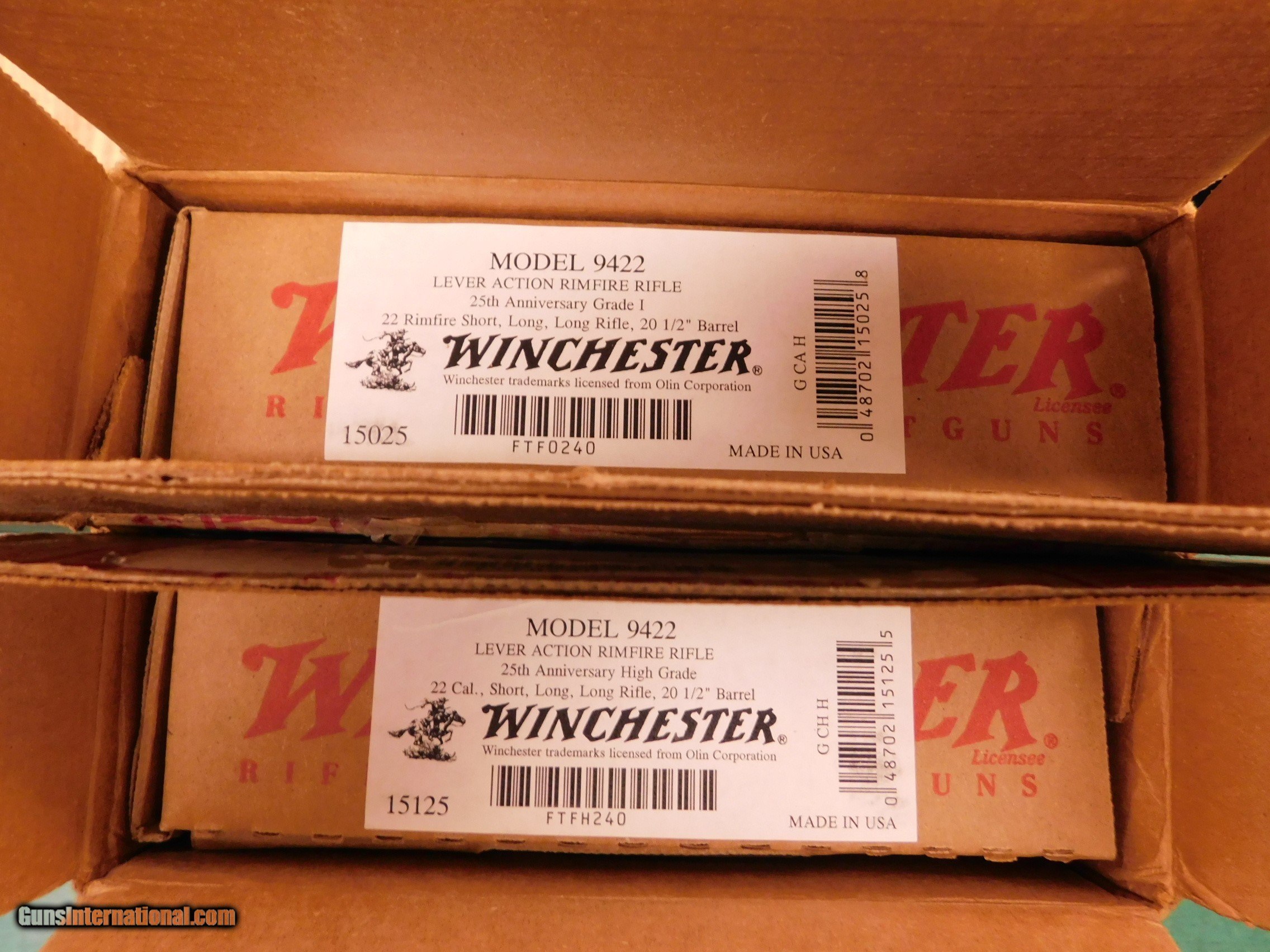 Description: Brand new in box!!!! Winchester 9422 25th anniversary 2 gun set. One is standard grade the other is high grade. Only 250 were ever made. Brand new in box. They will only be sold as a set. Only $4500 for the pair and $55 shipping and handling SOLD Manufacturer: winchester Model: 9422 Serial Number: ftfh240 &ftf0240 Caliber Info: 22 Condition: new in box |