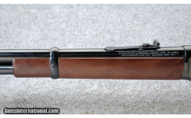 Description: This Winchester Model 94 Trails End Saddle Ring Carbine features: a blued receiver, round barrel and standard lever; a straight buttplate along with an extended forearm that provides forward hand position for better balance. Other features include satin-finished walnut stocks, top-tang safeties, angle eject action that is drilled and tapped receivers for use with a scope. SOLD Caliber Info: .45 Colt Ctg. Metal Condition: Excellent Wood Condition: Excellent with handling marks Bore Condition: Excellent, sharp and bright Barrels: 20 inch round barrel Triggers: Smooth trigger Stock: Walnut straight-hand stock Stock Dimensions: 13 1/2 inch LOP Fore End: Walnut extend carbine fore end Butt Pad: Winchester black plate Weight: 6 lbs. 6 oz. Sights: Drilled and tapped for scope mounting, semi buck horn rear and blade front sights Item Location: League City, TX |