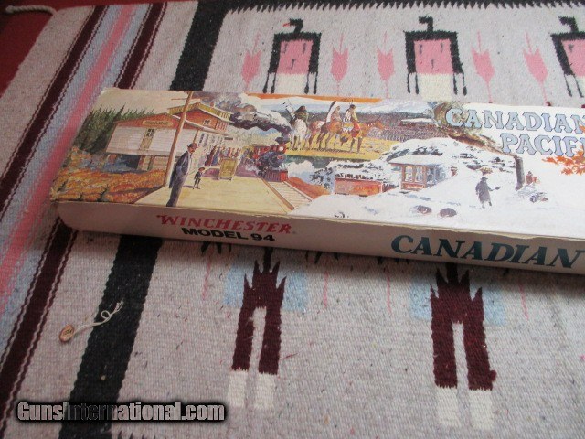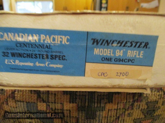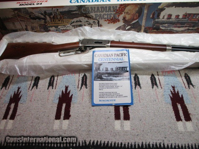 Description: This is a very nice Winchester Canadian Pacific Centennial Commemorative rifle. It is new in the box has original wrapping and factory pamphlet. The box and the sleeve are pristine. This is a desireable model as they only made 2700. I pay shipping! SOLD Rifle Caliber: .32 Winchester Special |
