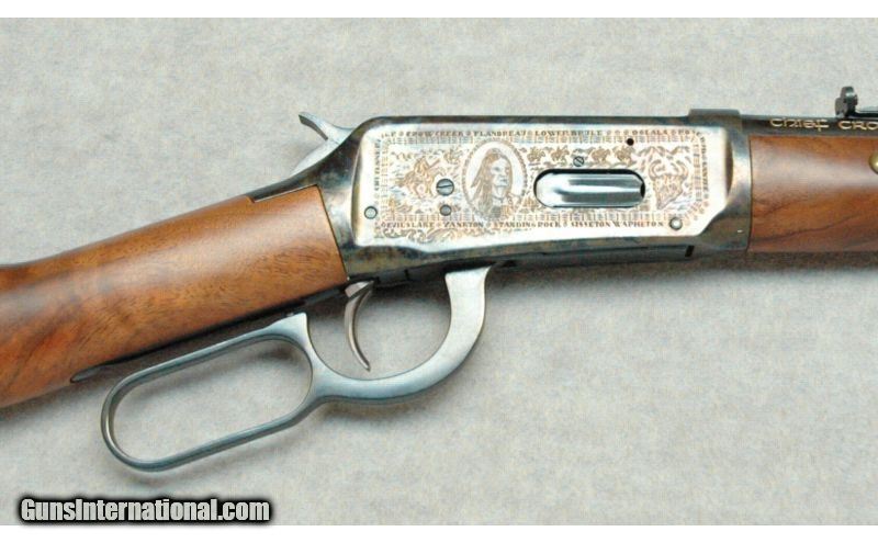 Description: Winchester Chief Crazy Horse 1894 Rifle .38-55. Appears as new with original box. Winchester collector series lever rifle with case colored engraved receiver, commemorative medallion and gold colored brads embelish the stock and forend. Good choice for Winchester collectors. SOLD Caliber Info: .38-55 Winchester Chambers: Lever action. Metal Condition: Appears as new. Wood Condition: Appears as new. Bore Condition: Bright. Barrels: 24" Barrel, case colored receiver. Triggers: Factory trigger. Stock: Natural finish with medallion inset RS. Stock Dimensions: 13 1/4" LOP. Fore End: Smooth with metal cap. Butt Pad: Curved metal butt plate. Weight: 7 Lbs. Sights: Iron sights. Extras: With original box. Item Location: La Vista, NE |
