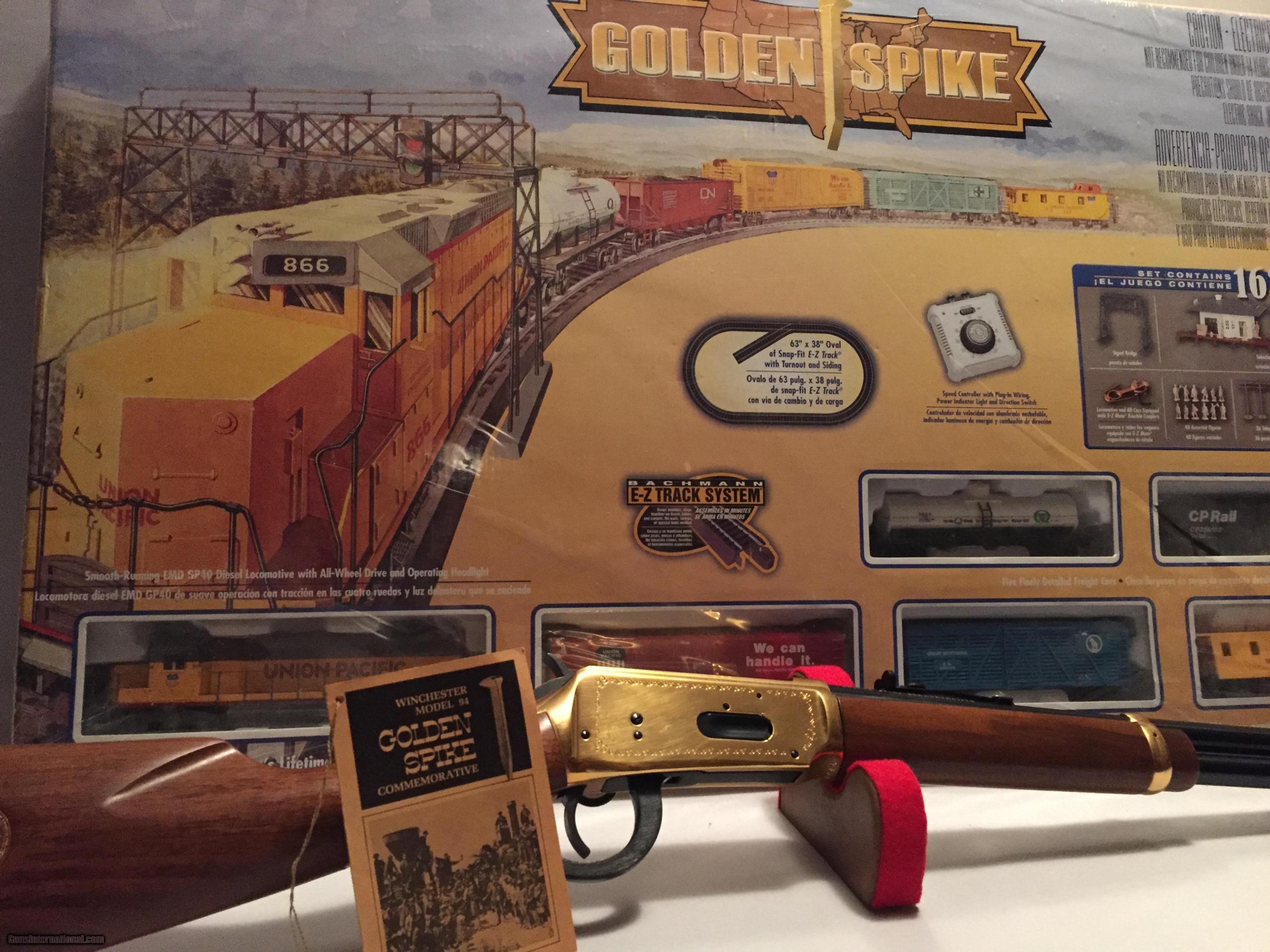 Description: Golden Spike - the only carbine authorized by the Union Pacific and Southern Pacific railroads. Men with picks and sledges in one hand, Winchester in the other, linking the world's two great Oceans. Gun is unfired in Excellent conation with hang tag "no box" train set is unopened "as new SOLD Serial Number: GS 30165 |