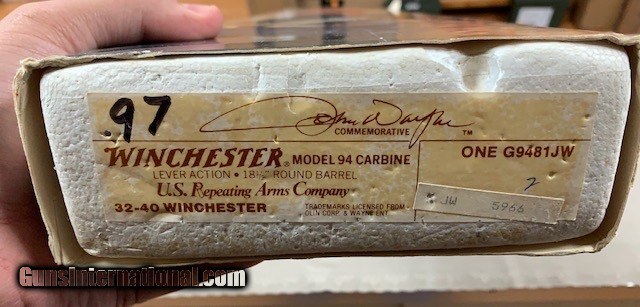 Description: This is an unfired like new in the box Winchester John Wayne Model 94 Carbine in caliber .32-40. Serial range is JW596x. Probably the most in demand Winchester Commemmorative there is - and this is a nice one just look at the photos carefully. SOLD Curio/Relic: Yes |