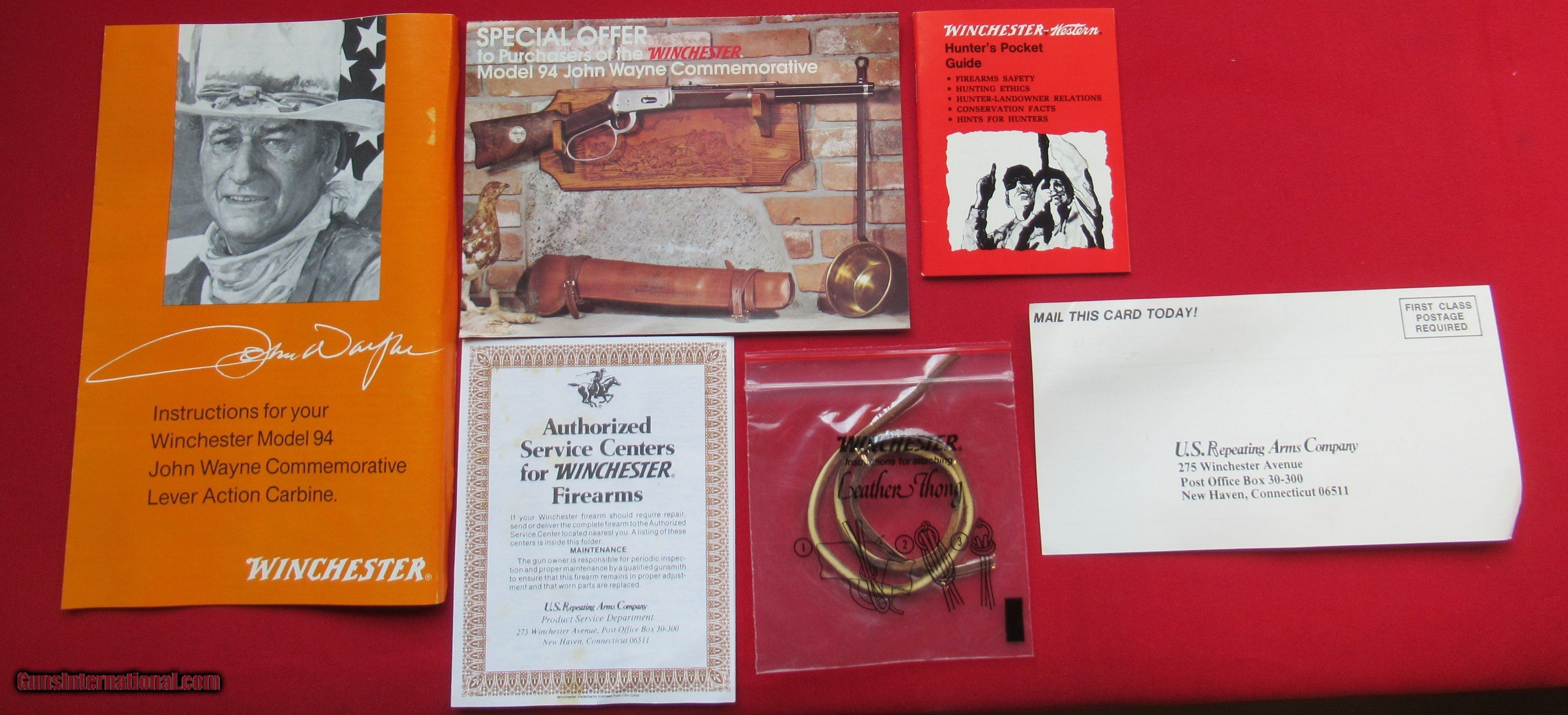 Description: This John Wayne Commemorative 32-40 Carbine is in 100% Collector Quality Condition. The colorful sleeve and foam box are in 99% condition. Carbine comes with the paperwork as shown. You won't find a better one. Must be sent to C&R or FFL License Holder. $85.00 Shipping & Insurance to the lower 48 only. Thanks for looking. SOLD Curio/Relic: Yes Rifle Caliber: .32-40 Winchester |