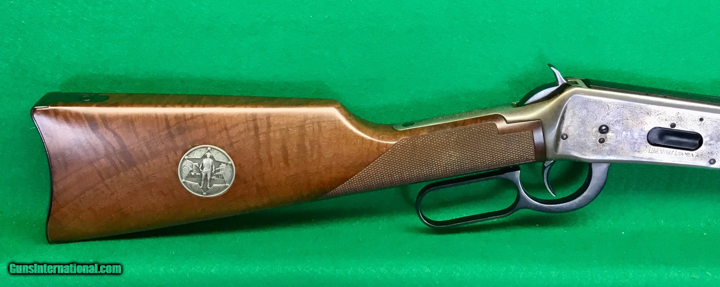 Description: no box but this Saddle ring carbine,16 inch barrel trapper model Legendary Lawman is in near mint condition. Engraved receiver shows oxidation, but no rust or pitting. Some polish will take care of the oxidation. $898 plus $38 insured shipping. Lay a way available. No credit cards and no trades. WINCHESTER 30 - 30 LEGENDARY LAWMAN M 94 RIFLE Winchester 30 - 30 Model 94 commemorative Legendary Lawman repeating lever action rifle. Tube fed 5 round magazine. Engraved nickel receiver with lawmen on horseback scenes and trimming scroll work. Checkered wooden fore grip and stock. Blued barrel and lever. Curved metal butt plate. SOLD |