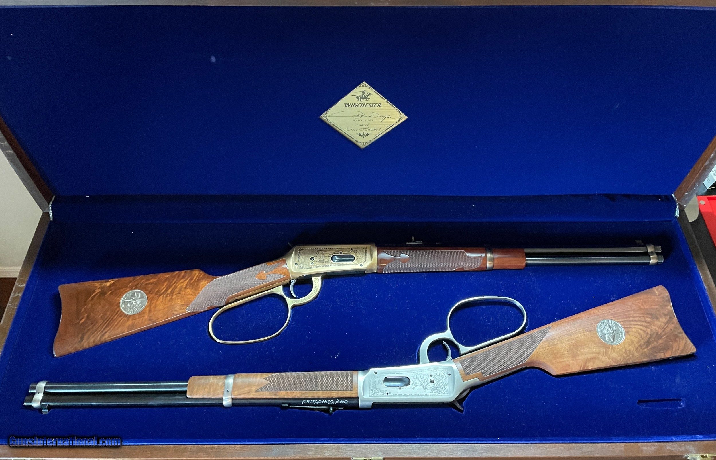 Description: These are extremely hard ones to find for the collectors out there or just John Wayne lovers. Two matching low serial number "70" 1-300 John Wayne Commemorative Set with display case. Please research these ones and see how few are out there with low SN and the commemorative case. Individually these are selling for well over $4,500 with this low of a serial number and this great of condition. I will consider offers but would recommend to Buy Now before you loose your opportunity for these amazing collector rifles. Due to insurance and the weight of the display case shipping is $250 on these and 3% Credit Card fee. Buy Now pays no shipping or CC fees. Please look at the pictures and do your own research on the value of these and what a great addition they would be for your collection. Winchester model 1894 Carbine John Wayne Commemorative rifle chambered in .32-40 Winchester. This rifle includes a 18" blued round barrel with buckhorn style sights, two stainless barrel bands, stainless receiver and large loop lever, press checkered wooden furniture, and blued metal butt plate. Left side of barrel has a two-line model and manufacturer address stamping and right side of barrel has " ONE OF THREE HUNDRED" stamped in silver colored cursive. Both sides of receiver have engraved John Wayne Western movie scenes with names of his famous movies surrounding the scenes. John Wayne's engraved signature on the tang and commemorative medallion embedded on right side of stock. Included with this rifle is the commemorative factory box and one unopened box of Winchester .32-40 Winchester John Wayne commemorative ammunition wrapped in plastic. Box does not include all factory paperwork. CONDITION: Excellent plus new in box with seeming to have never been fired. Excellent bore and mechanics. Box and accessories have some handling and storage marks. 2nd Rifle Winchester model 1894 Carbine John Wayne Commemorative rifle chambered in .32-40 Winchester. This rifle includes a 18" blued round barrel with full buckhorn style sights, two brass colored barrel bands, brass colored receiver and large loop lever, press checkered wooden furniture, and blued metal butt plate. Left side of barrel has a two-line model and manufacturer address stamping and right side of barrel has " ONE OF THREE HUNDRED" stamped in gold colored cursive. Both sides of receiver have engraved John Wayne Western movie scenes with names of his famous movies surrounding the scenes. American style engraving on trigger guard section of lever. John Wayne's engraved signature on the tang and commemorative medallion embedded on right side of stock. Included with this rifle is the commemorative factory box and one unopened box of Winchester .32-40 Winchester John Wayne commemorative ammunition. CONDITION: Excellent plus new in box with seeming to have never been fired. Excellent bore and mechanics. Box and accessories have some handling and storage marks. Included is a wooden Commemorative match set display case for both rifles lined with blue fabric and Commemorative plagues both on outside lid and inside minor separation at parts of the seam and possible hairline crack in case hard to tell. GFP. Serial Number: (A) JWM70 (B) JWDM70. Both have tags and some original paperwork. Please refer to photos as to what you will get. We have over 130 A+ ratings and have been known for great products, customer service and fast shipping. We are a licensed FFL out of Arizona and will only ship to licensed FFL's. No storefront so no in person sales. We look forward to earning your business. We are a veteran owned and operated business. We specialize in finding hard to find guns for many collectors. If you are looking for something let us know and we can probably find it. We generally purchase guns through private parties and estate sales, and we check to ensure the gun functions, we do not clean, test fire or do repairs to the gun. PLEASE DO NOT BUY UNLESS YOU ARE SURE YOU WILL FOLLOW THROUGH WITH THE PURCHASE. By purchasing, you are attesting to being of legal age to own this item in your state. It is the buyer’s responsibility to know local gun laws, prior to purchase, if it ships to your dealer and it's not legal in your state no refunds. California s must have the FFL say the guns legal in your state before you buy. All items have a 3-day inspection and inspections should take place while at the FFL’s location once it leaves the FFL I can’t help you. Arrangements of payments must be made within 3 days of purchase. It is your responsibility to know if you will pass the FFL background check, no refunds if you don't. If you back out of the sale a 15% restocking fee will be charged we encourage you to have the gun checked before firing to insure it's safety. SOLD Curio/Relic: Yes |