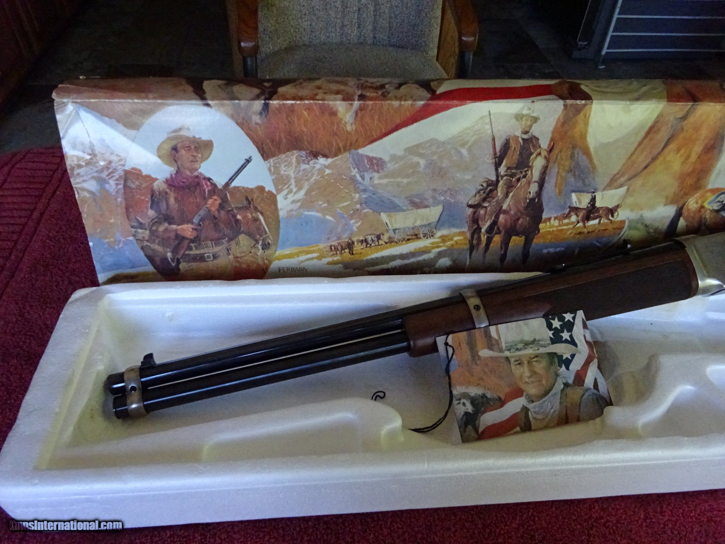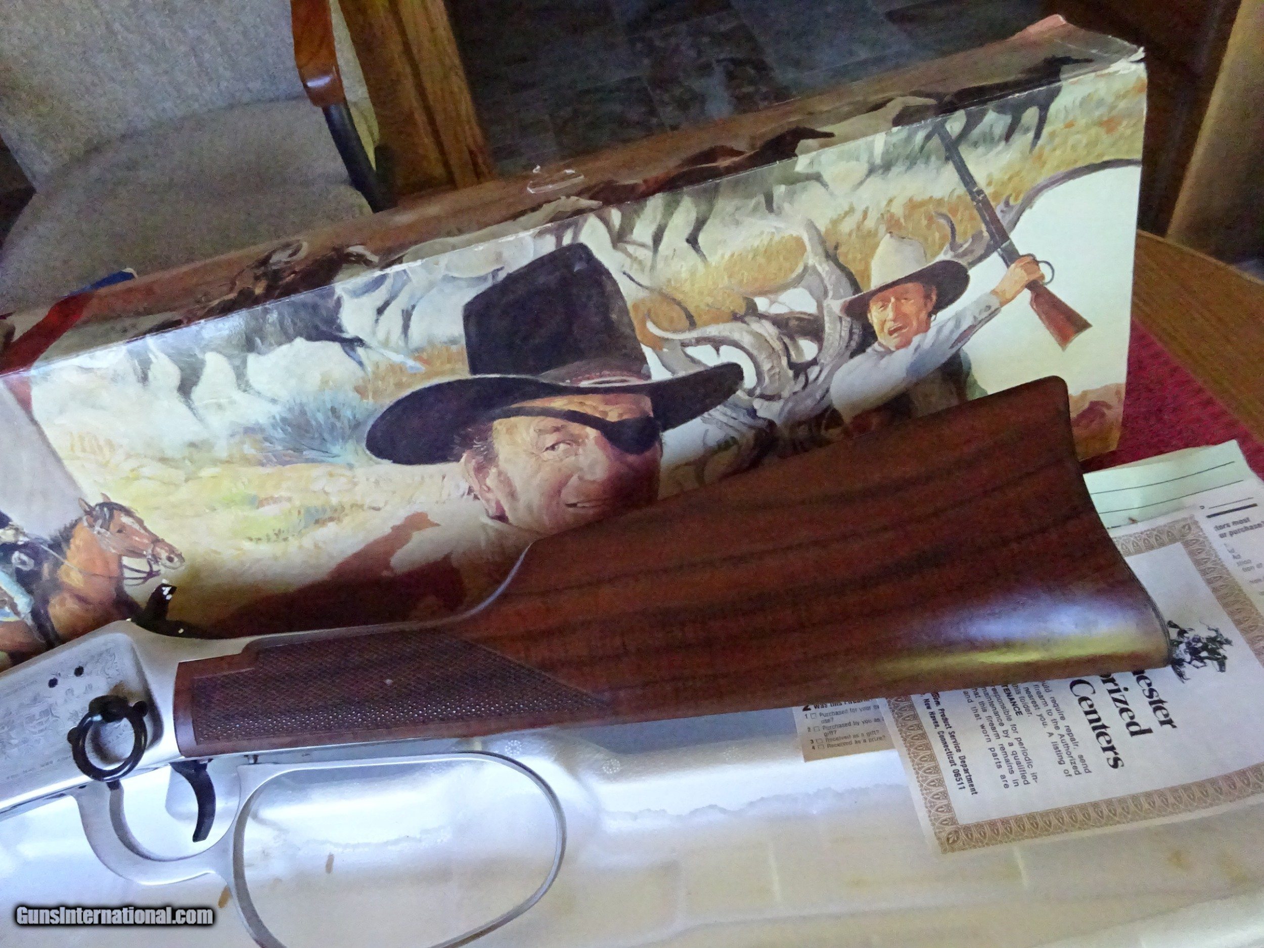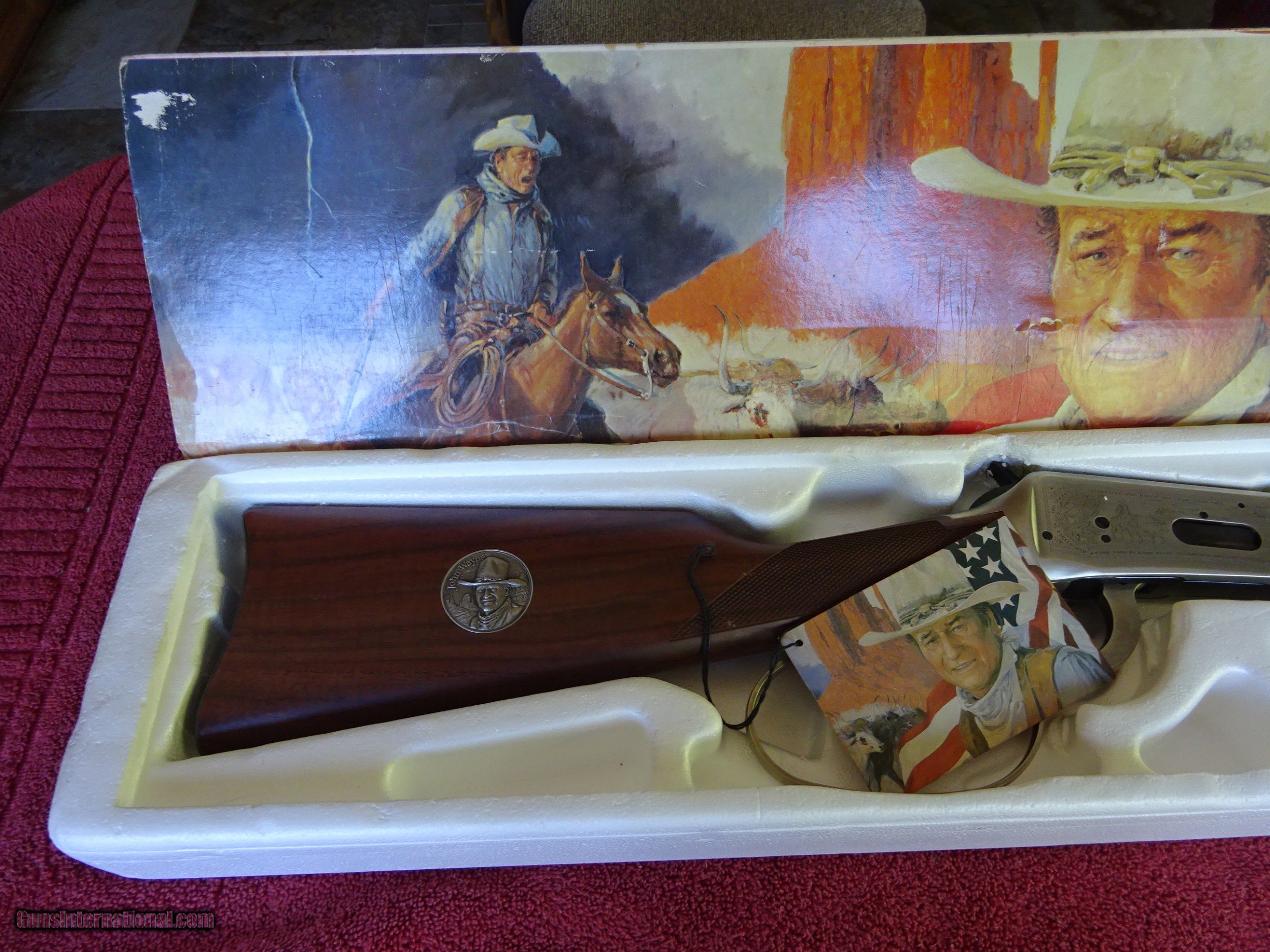 Description: ***SALE PENDING*** WINCHESTER JOHN WAYNE COMMEMORATIVE 32-40 WIN. LEVER ACTION, 18 1/2" BARREL, 5 SHOT MAGAZINE. 100% PERFECT CONDITION, NO WEAR OR HANDLING MARKS ANYWHERE ON THE GUN. INCLUDES ORIGINAL BOX, HANGTAG BOOKLET, WARRANTY CARD AND COLORFUL SLEEVE OVER THE STYROFOAM BOX IS BRIGHT, NO FADING. EXCELLENT CONDITION. IT'S HARD TO FIND ONE OF THESE GUNS THAT HASN'T BEEN HANDLED. THIS ONE IS PERFECT. INTRODUCED IN 1981, TOTAL PRODUCTION 49,000. $2450.00 + $60.00 insured shipping to an FFL address. Layaway is available. See all Pats gun listings on this site! We also have hundreds of pieces of ORIGINAL gun company advertising & memorabilia available for sale on our site SPORTINGCOLLECTIBLES. we have no reprints for reproductions. Email for more information. SOLD |