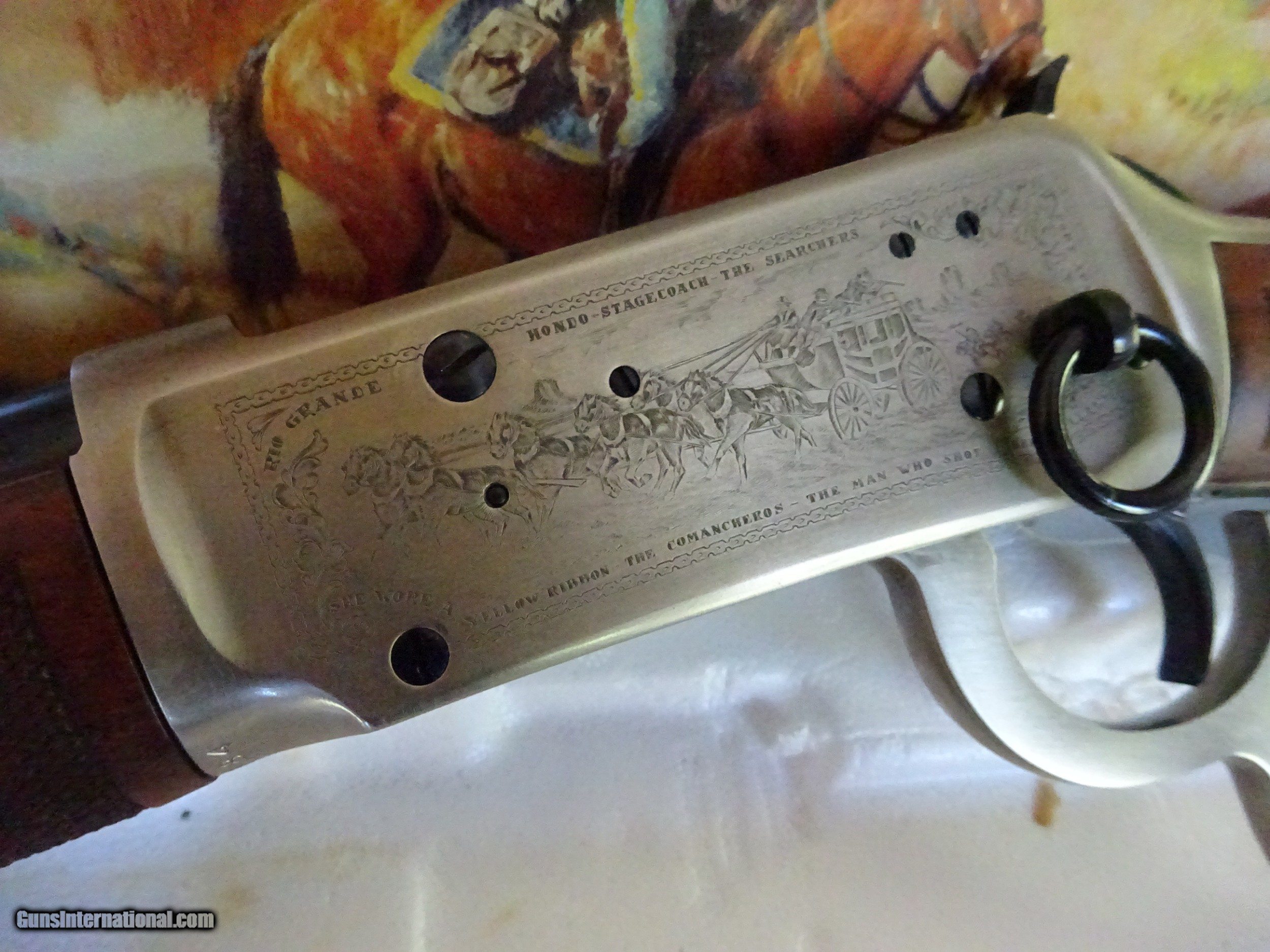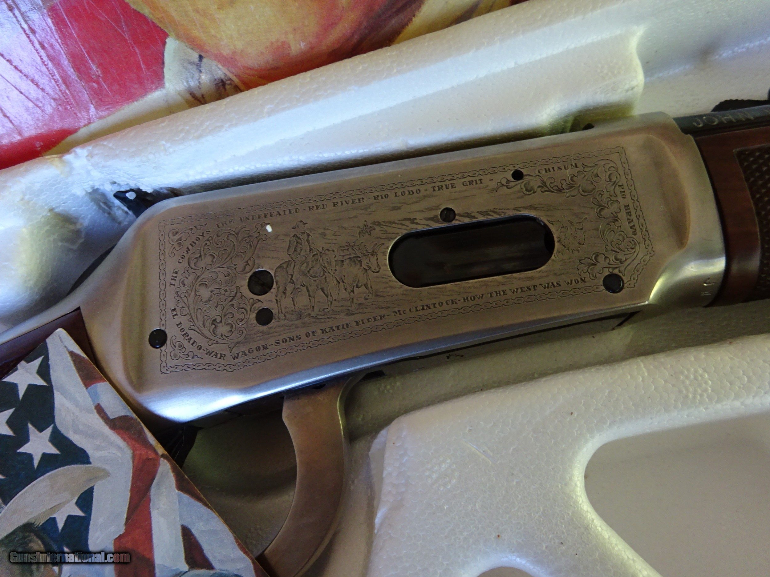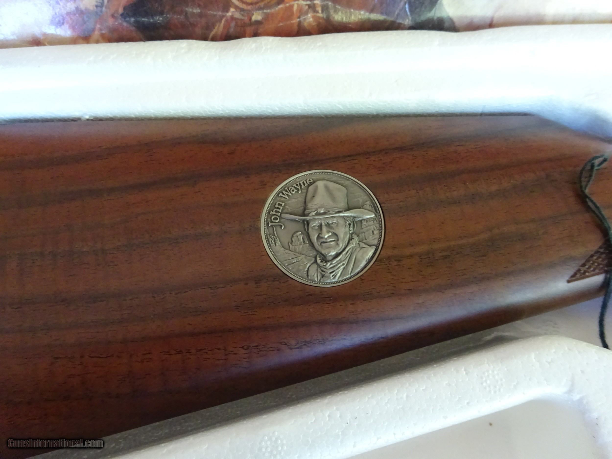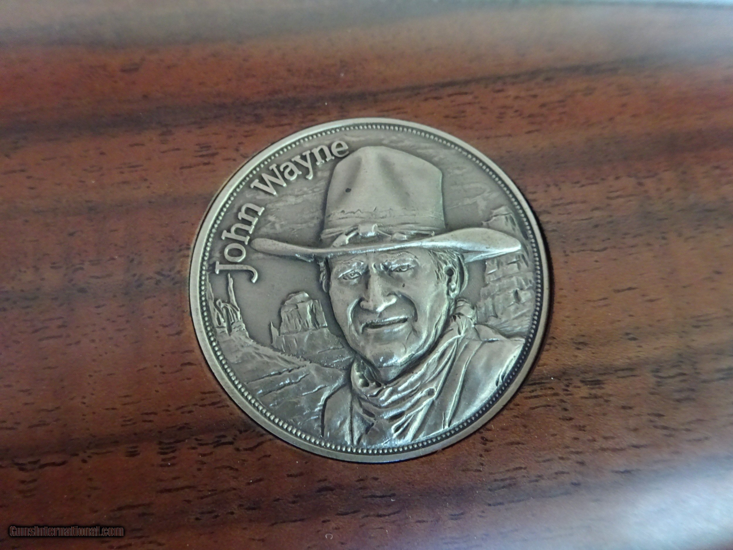 Description: ***SALE PENDING*** WINCHESTER JOHN WAYNE COMMEMORATIVE 32-40 WIN. LEVER ACTION, 18 1/2" BARREL, 5 SHOT MAGAZINE. 100% PERFECT CONDITION, NO WEAR OR HANDLING MARKS ANYWHERE ON THE GUN. INCLUDES ORIGINAL BOX, HANGTAG BOOKLET, WARRANTY CARD AND COLORFUL SLEEVE OVER THE STYROFOAM BOX IS BRIGHT, NO FADING. EXCELLENT CONDITION. IT'S HARD TO FIND ONE OF THESE GUNS THAT HASN'T BEEN HANDLED. THIS ONE IS PERFECT. INTRODUCED IN 1981, TOTAL PRODUCTION 49,000. $2450.00 + $60.00 insured shipping to an FFL address. Layaway is available. See all Pats gun listings on this site! We also have hundreds of pieces of ORIGINAL gun company advertising & memorabilia available for sale on our site SPORTINGCOLLECTIBLES. we have no reprints for reproductions. Email for more information. SOLD |