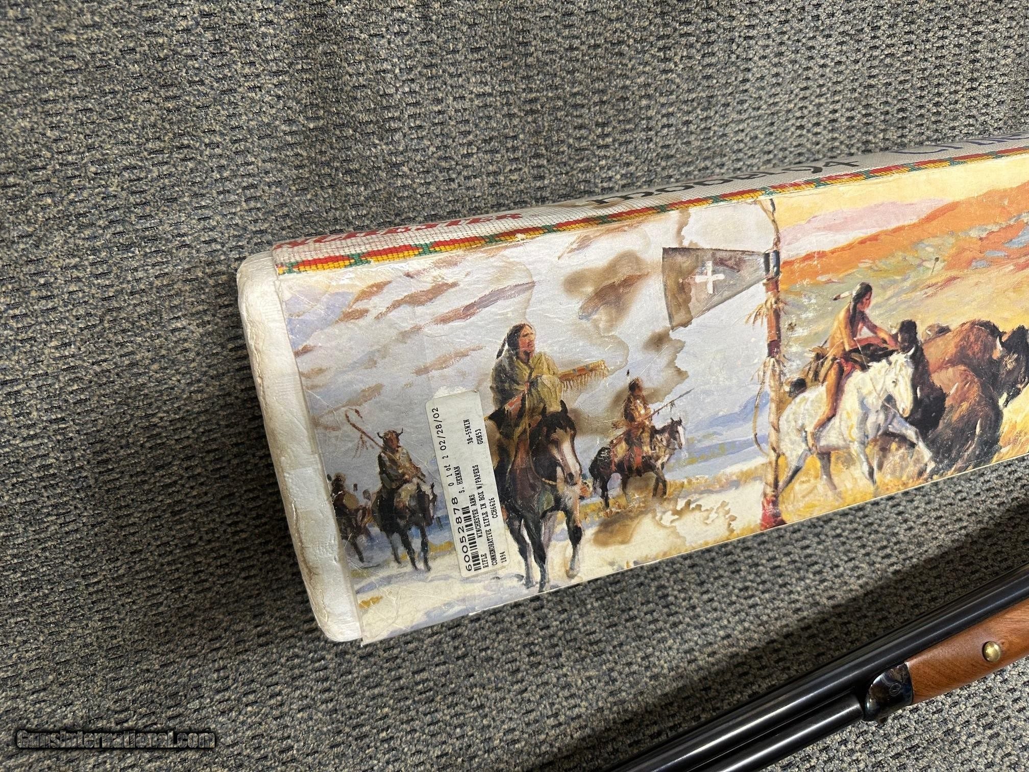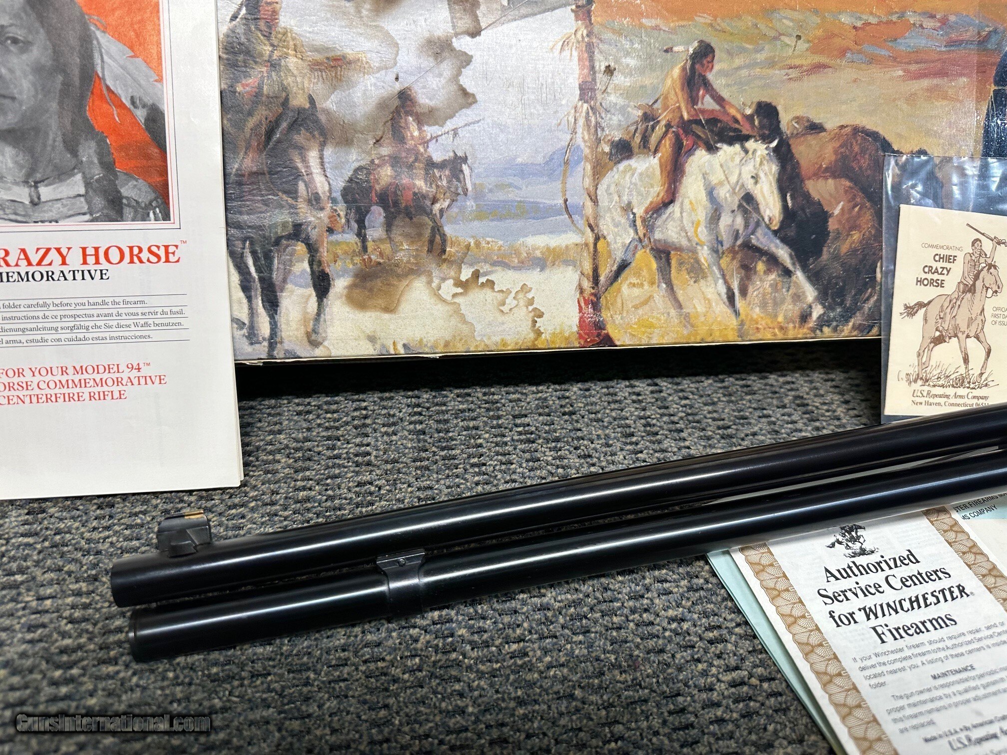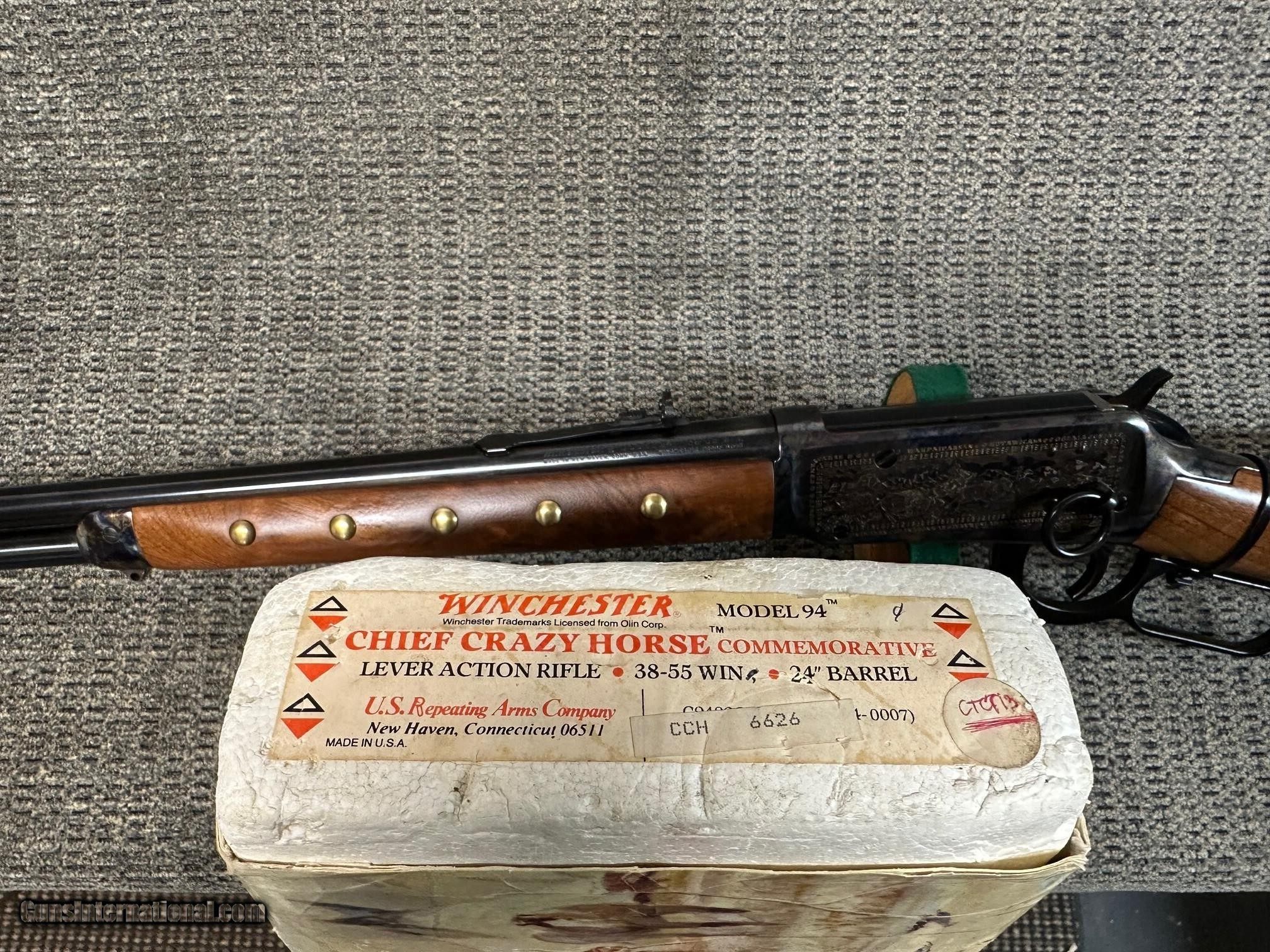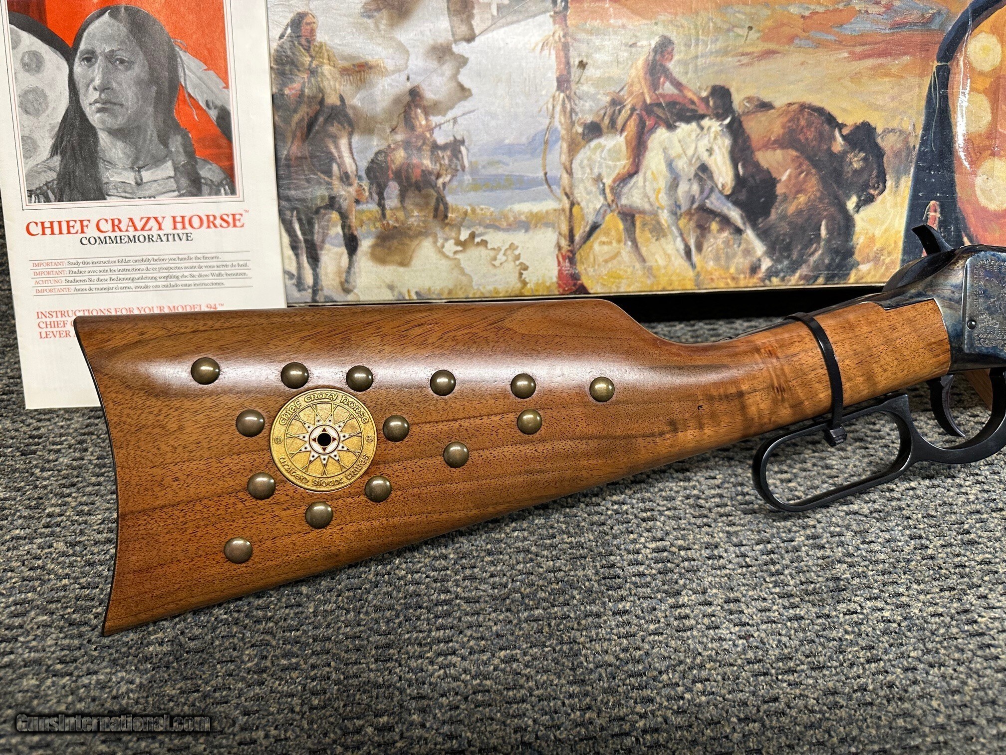 ** Unfired/ In Box** Model 94 Chief Crazy Horse . .38-55 WCF. Mfg in 1983 honoring the Great Sioux War Chief. Rifle is in NEW condition. All paperwork is present. Picture sleeve was quite tattered on ends with a section missing. I trimmed and filled missing section. Styrofoam ends a bit soiled. Label is intact. $75.00 Shipping & Insurance to Your FFL in lower 47. NO CA Sales. Thanks for looking.