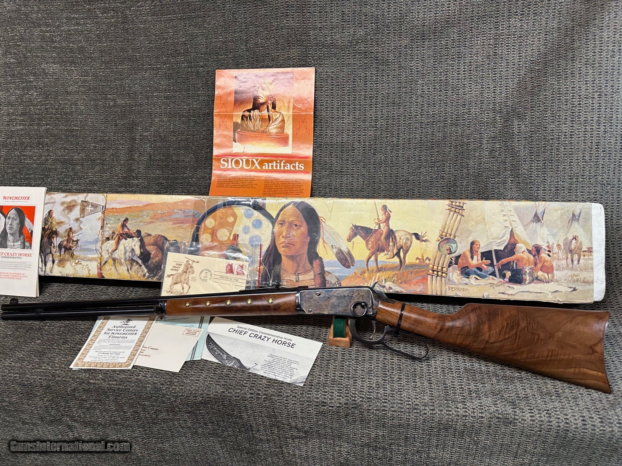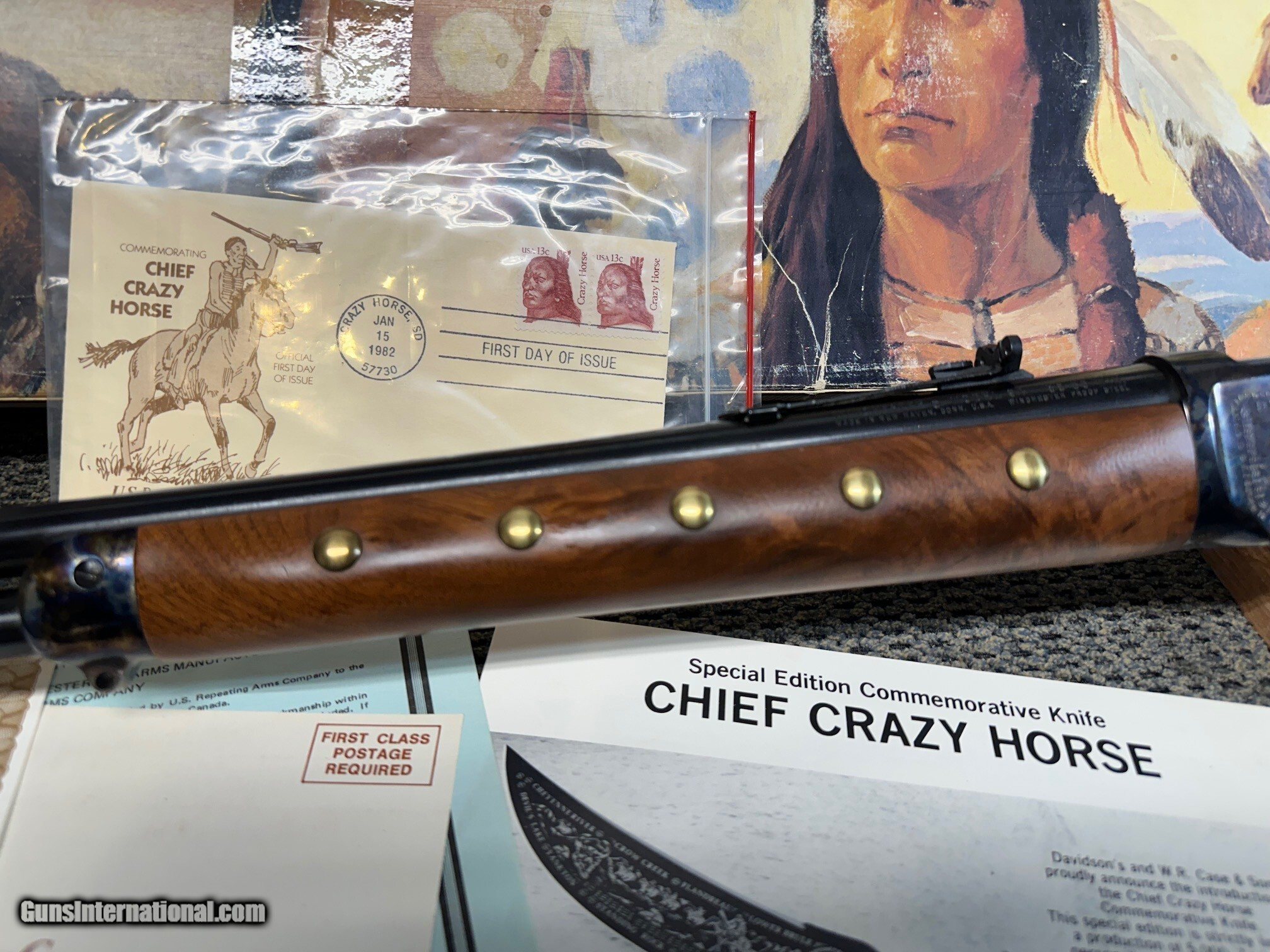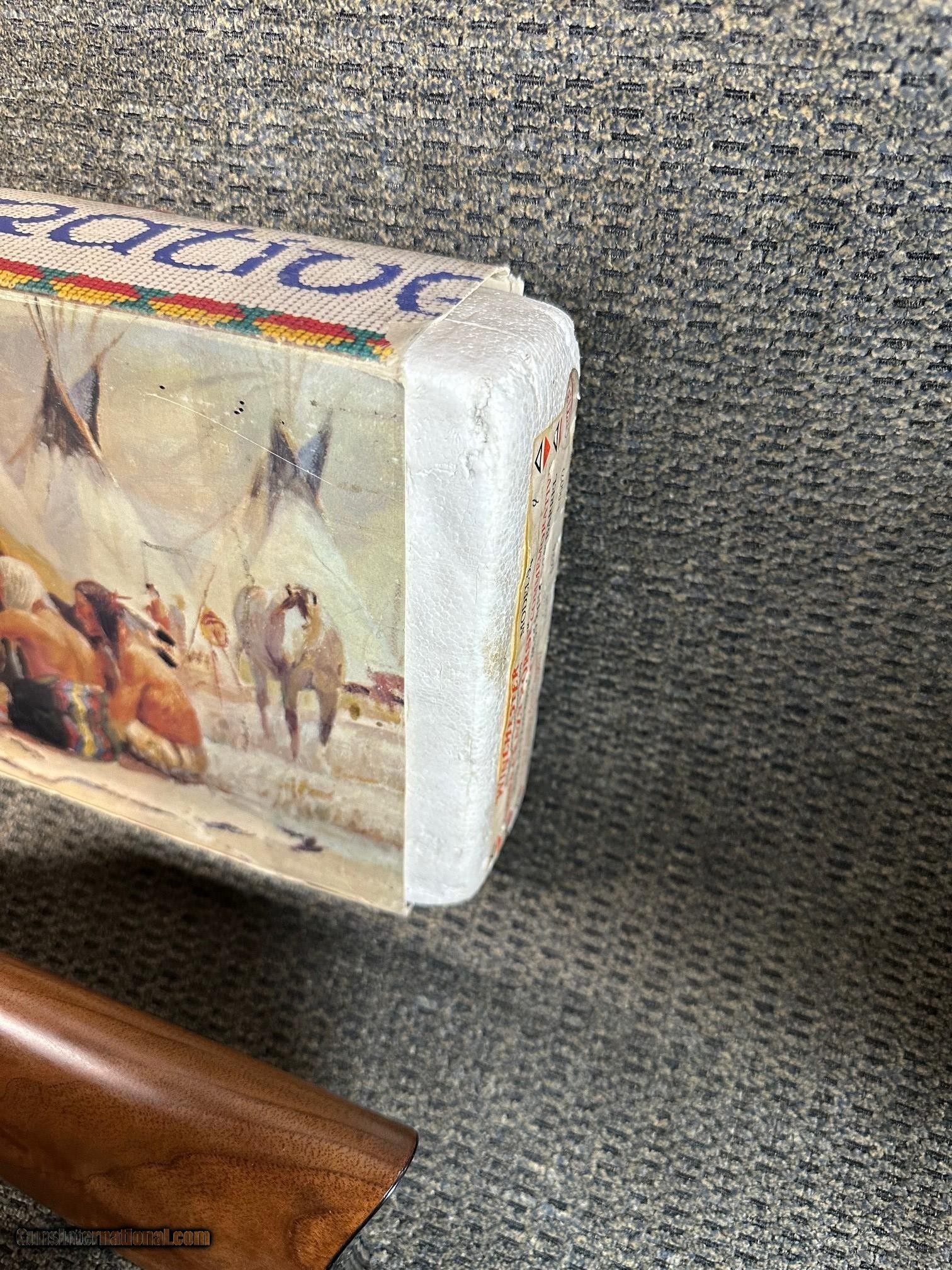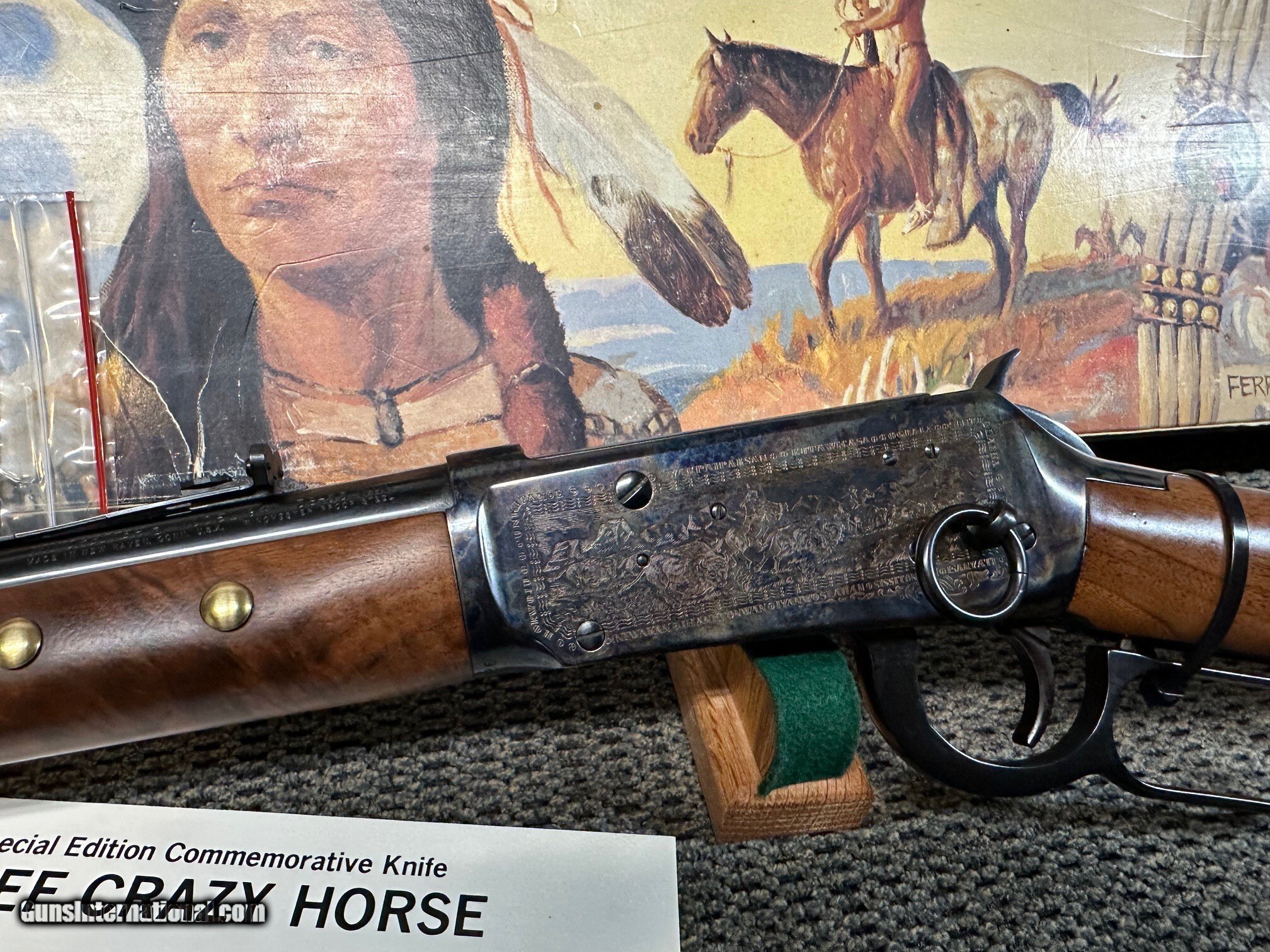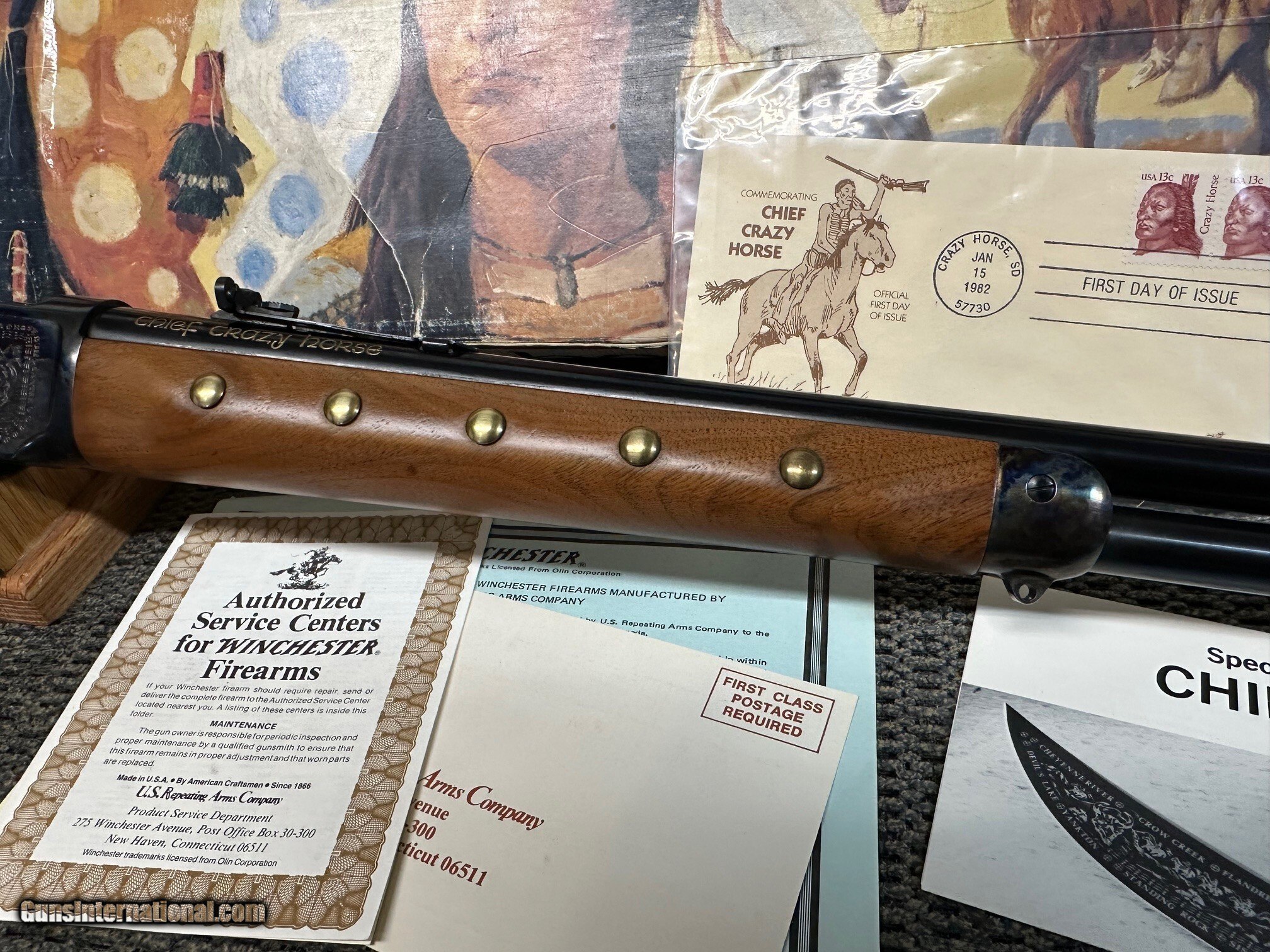 ** Unfired/ In Box** Model 94 Chief Crazy Horse . .38-55 WCF. Mfg in 1983 honoring the Great Sioux War Chief. Rifle is in NEW condition. All paperwork is present. Picture sleeve was quite tattered on ends with a section missing. I trimmed and filled missing section. Styrofoam ends a bit soiled. Label is intact. $75.00 Shipping & Insurance to Your FFL in lower 47. NO CA Sales. Thanks for looking.