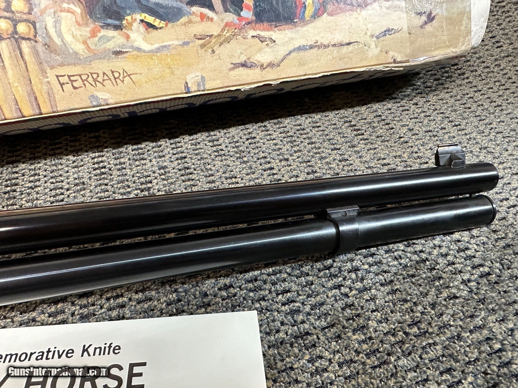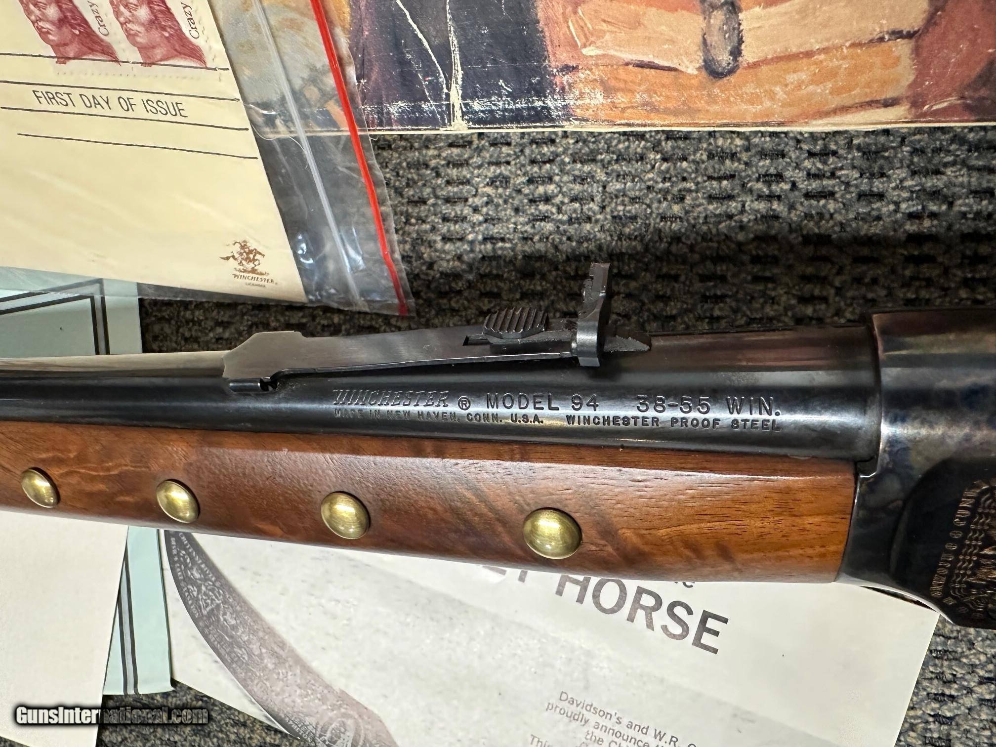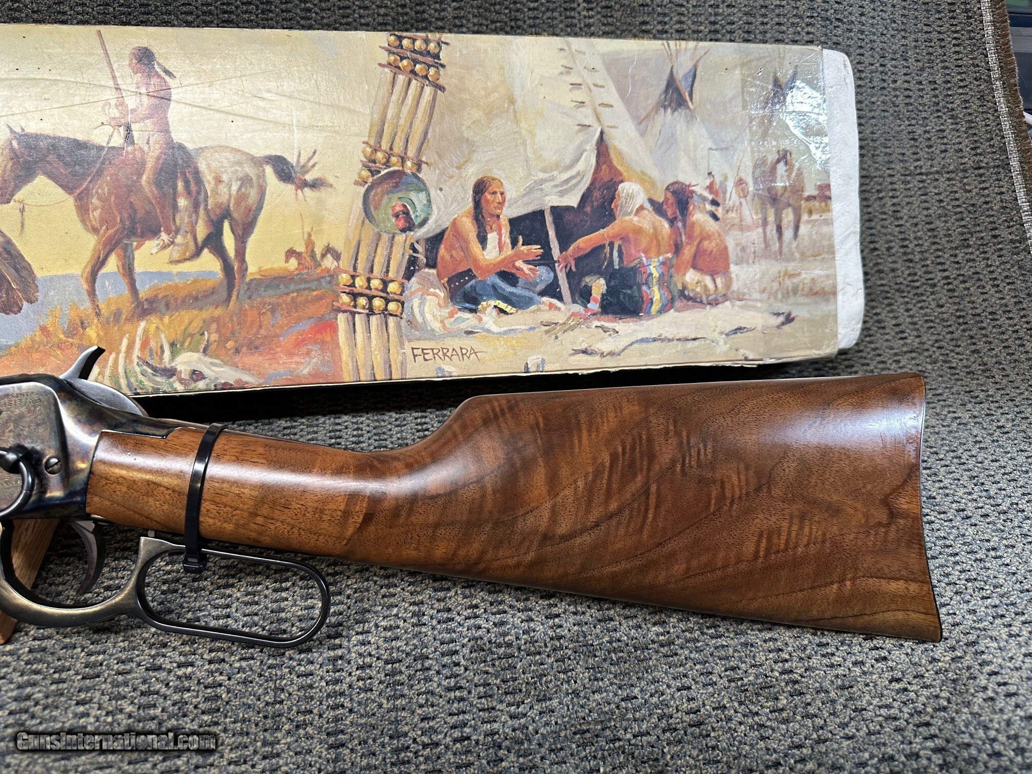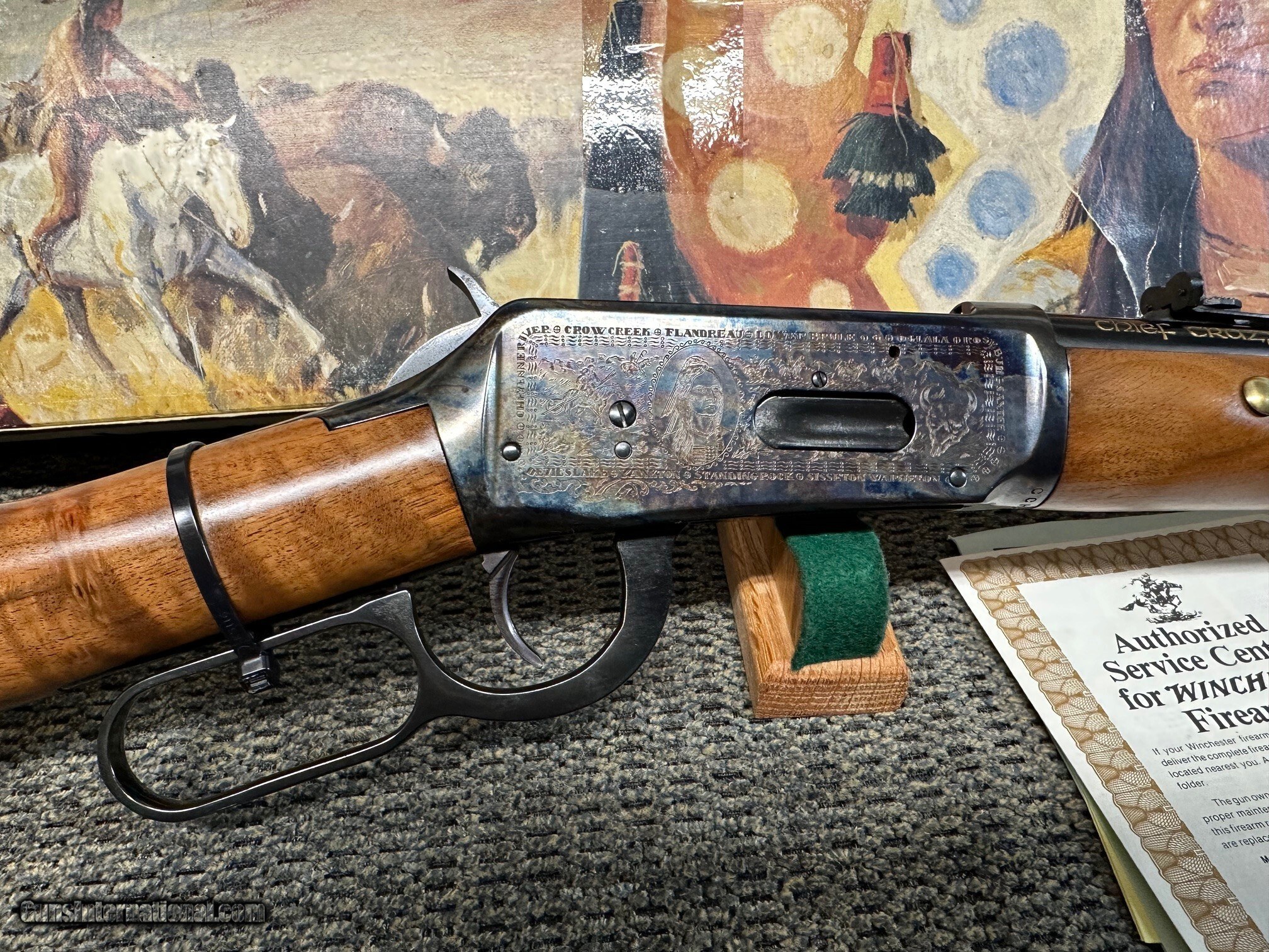 ** Unfired/ In Box** Model 94 Chief Crazy Horse . .38-55 WCF. Mfg in 1983 honoring the Great Sioux War Chief. Rifle is in NEW condition. All paperwork is present. Picture sleeve was quite tattered on ends with a section missing. I trimmed and filled missing section. Styrofoam ends a bit soiled. Label is intact. $75.00 Shipping & Insurance to Your FFL in lower 47. NO CA Sales. Thanks for looking.