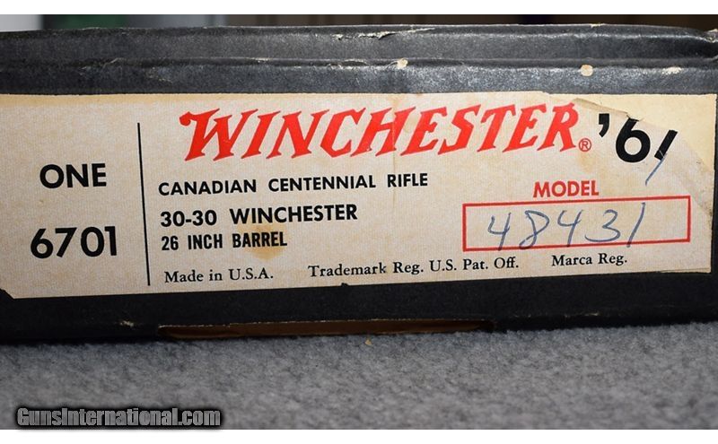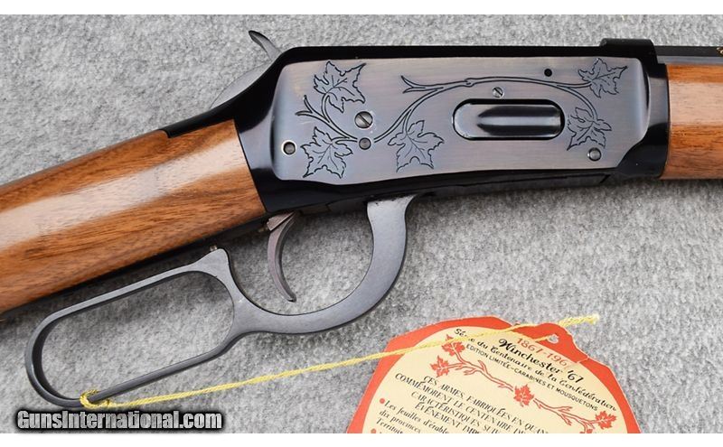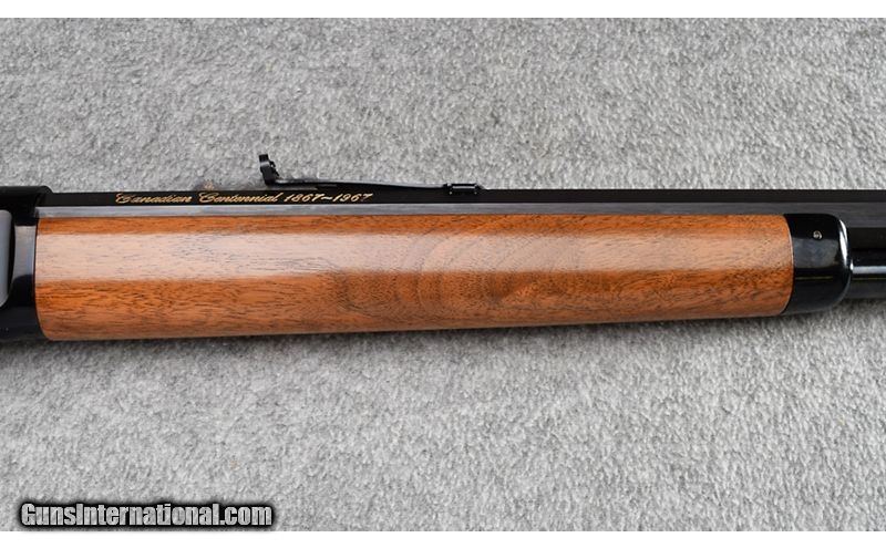Description: This Winchester commemorates the 1867-1967 Canadian Centennial. Gun is in excellent overall condition. Blue, bore and wood are all excellent. Complete with original box, hang-tag and paperwork! Beautiful gun! .30-30 Winchester SOLD Metal Condition: Excellent Wood Condition: Excellent Bore Condition: Excellent Barrels: 26" Octagon Triggers: Factory Stock Dimensions: 13 1/2" LOP Fore End: Uncheckered Walnut Straight Grip - Uncheckered Walnut Forend Butt Pad: Crescent Metal Butt Plate Weight: 8lb Sights: Post & Bead Front - Adjustable Rear Buckhorn Item Location: Wheeling |