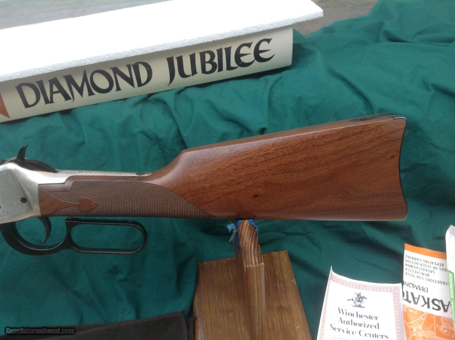 Description: Model 94 Saskatchewan Diamond Jubilee No Reserve! NIB Serial number SDJ 2139. Sleeve and styrofoam container show wear (see pics). Gun is unfired and comes with papers and cloth. 20" barrel and in 38-55. Jubilee examples are some of the most sought after Commemoratives. Must ship to a FFL license holder. Please feel free to ask questions via email or call me at 315-374-3706. SOLD |