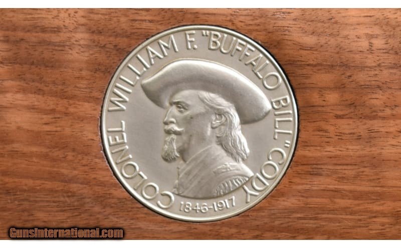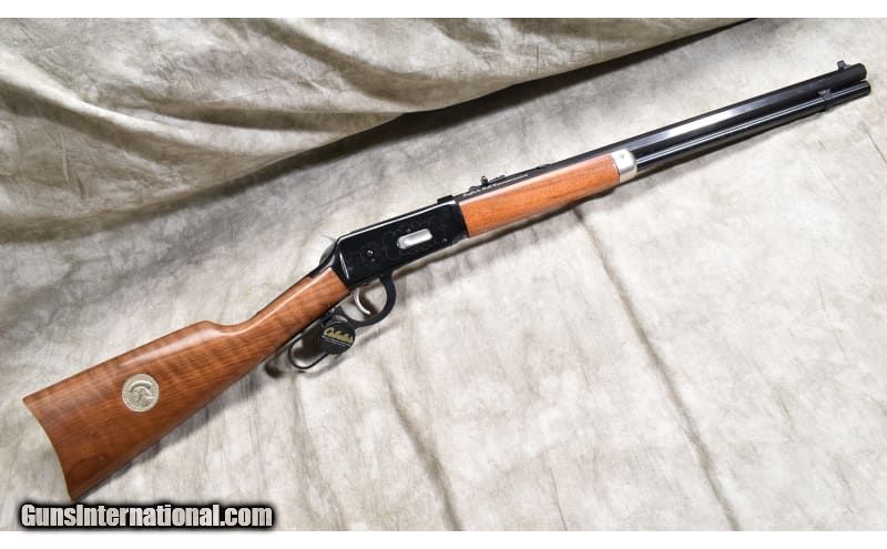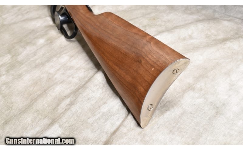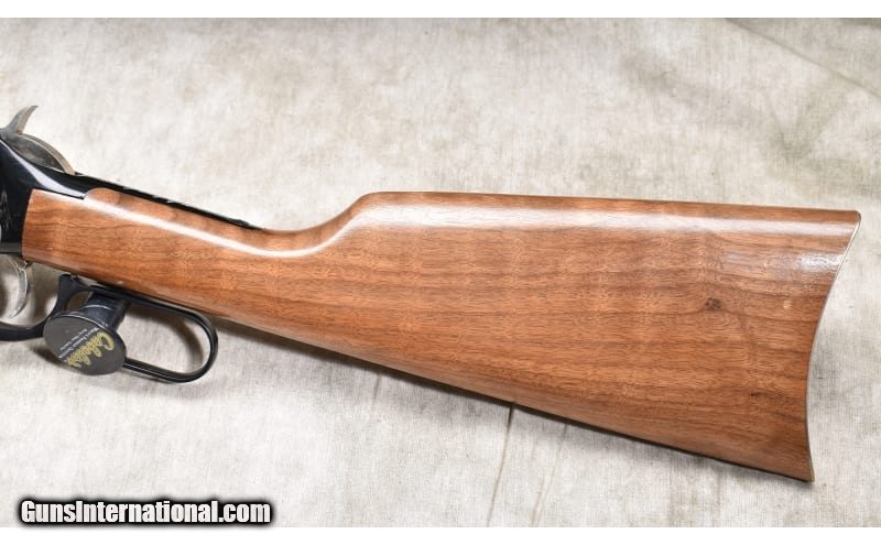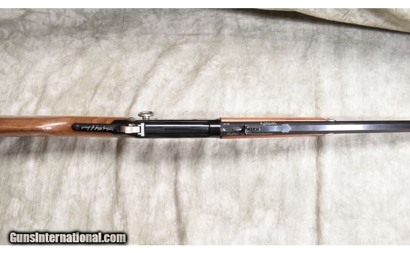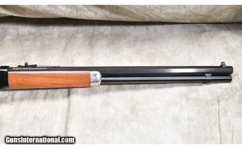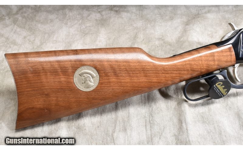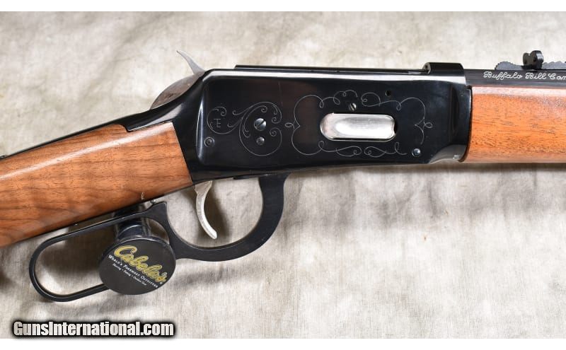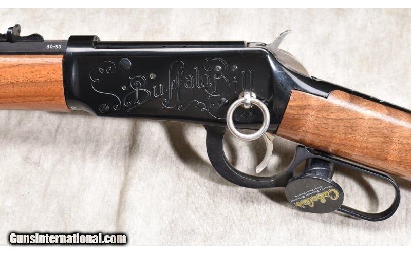 Description: Very nice looking rifle featuring figured walnut stock with Buffalo Bill medallion, acanthus motif engraving, saddle ring, and hex barrel. .30-30 Winchester SOLD Chambers: 7 Metal Condition: LNIB. Wood Condition: LNIB. Bore Condition: LNIB. Barrels: 20-inch hexagonal Triggers: Factory trigger Stock Dimensions: 13-1/4 inch LOP Fore End: Matching walnut Butt Pad: Curved steel plate. Weight: 7 lb - 1 oz Sights: Bead and semi-buckhorn. Item Location: Rogers |