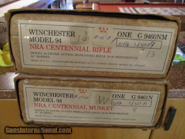 Description: This is a pair of NRA Centennial Commemoratives, new in the box with consecutive numbers. I purchased them new in 1972 and they have NEVER been out of the box until today for pictures. Thet were stored in a climate controlled vault and are absolutely pristine. Both have boxes and sleeves and ALL paperwork. SOLD Rifle Caliber: .30-30 Winchester |