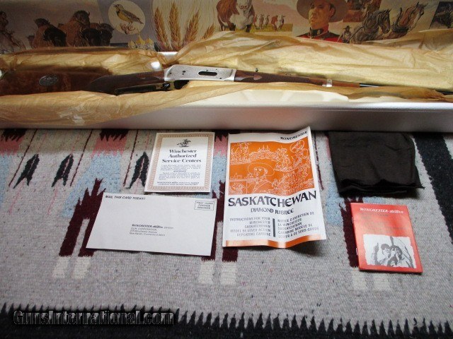 Description: This is a very nice Saskatchewan Diamond Jubilee new in the box. The gun is pristine with no blemishes. The box is pristine also. It has the factory wrapping and literature, the tag is missing If you are not familiar with this gun they made far less than other Commemoratives with just 2700 being built. I pay shipping. SOLD Rifle Caliber: .38-55 Winchester |