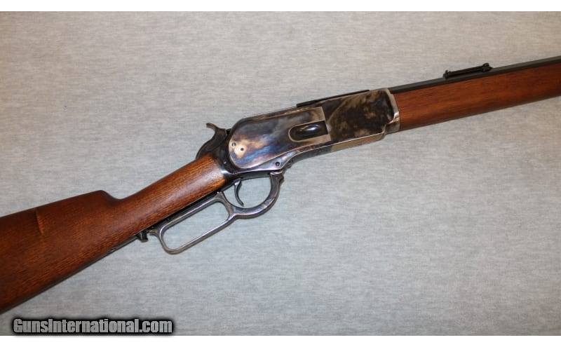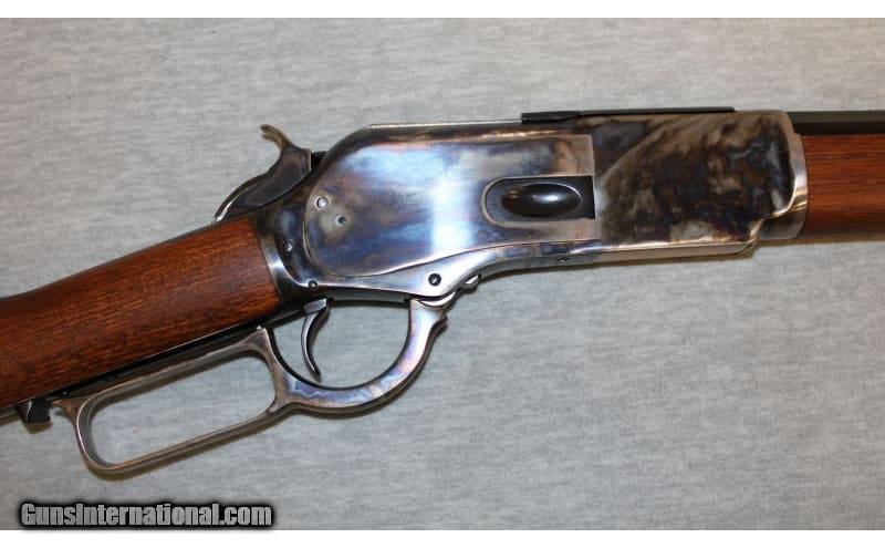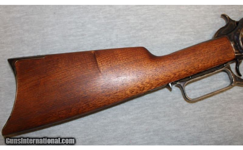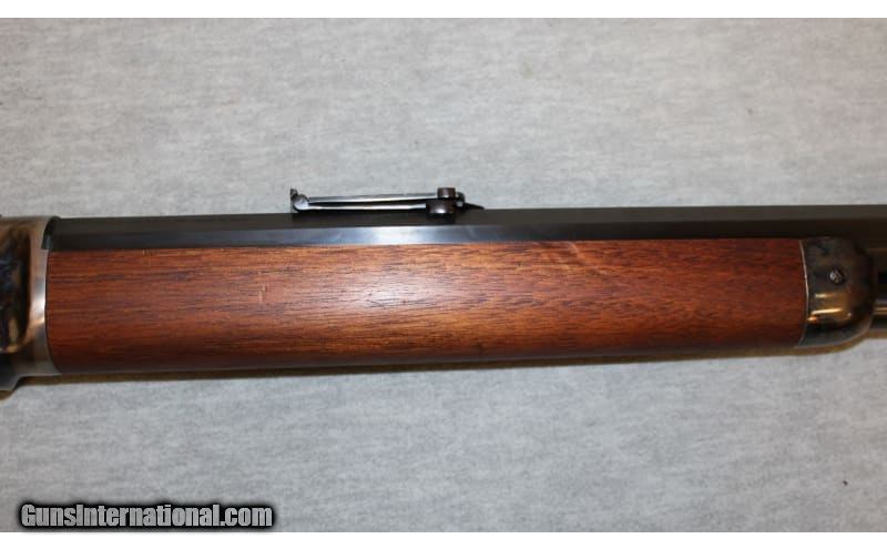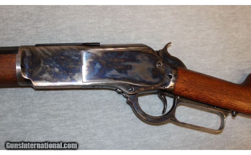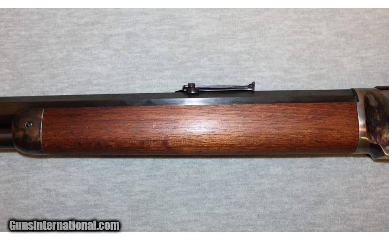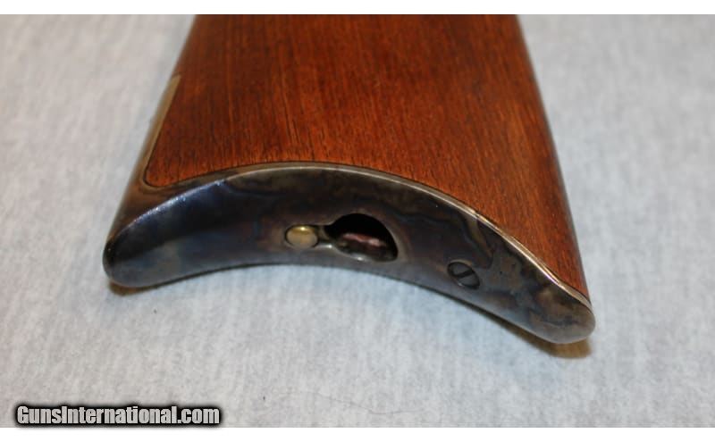 Description: Appears as new with original box. Nice reproduction of the Winchester Model 1876 lever action rifle, 22" blued octagon heavy barrel with full length mag tube, case colored receiver, forend cap, butt plate, hammer & lever. Adjustable iron sights, and smooth lever action. Natural finish smooth wood forend & buttstock with curved metal butt plate. .45-60 Winchester SOLD Chambers: Lever action Metal Condition: As new Wood Condition: As new Bore Condition: Bright Barrels: 22 Triggers: Factory Stock Dimensions: 13" LOP Fore End: Smooth Butt Pad: Curved metal butt plate Sights: "Adjustable ladder rear, blade front sights Item Location: La Vista, NE |