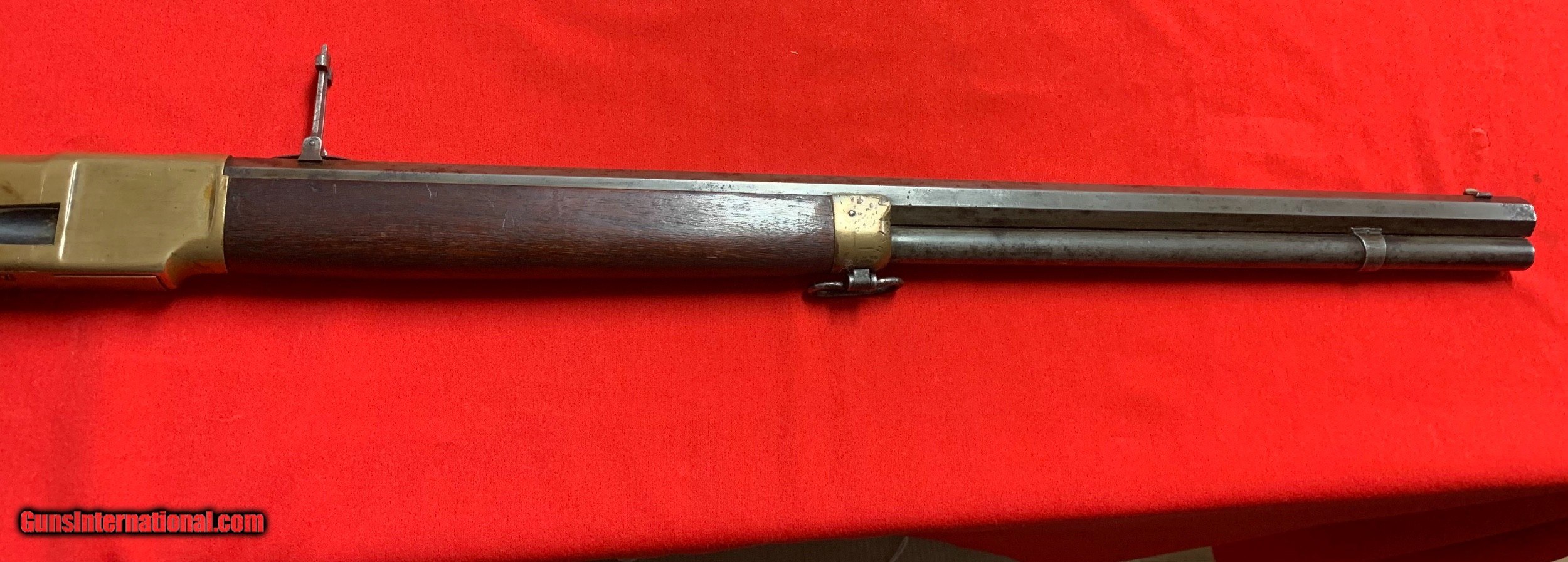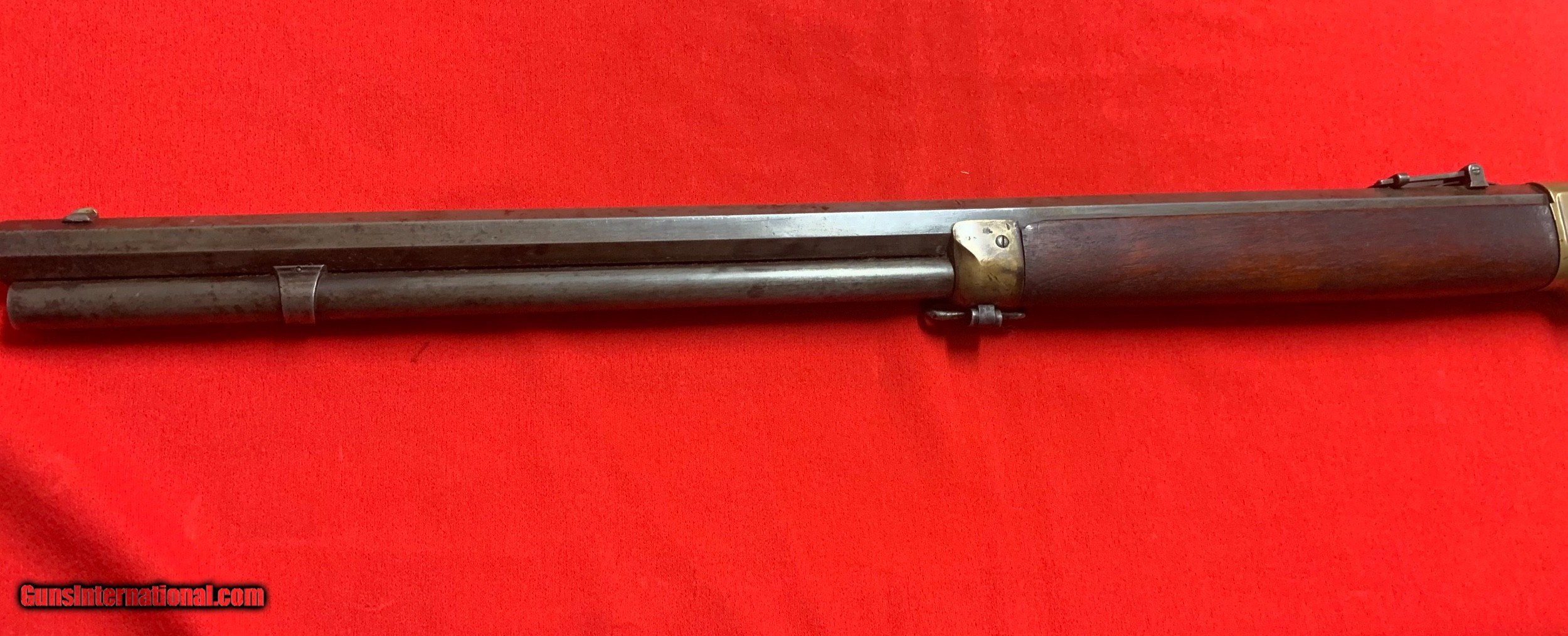 Description: Serial number-127610, cal-44, 24" octagon barreleith strong edges and very defined lettering, showing mostly gray patina, folding ladder sight, there is a crack by the tang as shown in pictures, full magazine GUN IS LETTERED ******PRICE REDUCED****12,500 to 9,000****** SOLD Manufacturer: Winchester Model: 1866 Serial Number: 127610 Metal Condition: Great Wood Condition: Very good |