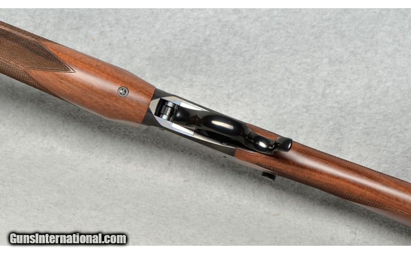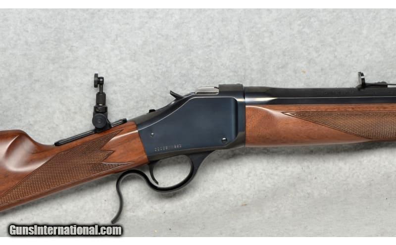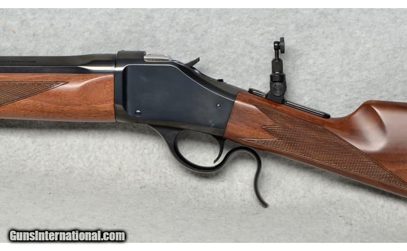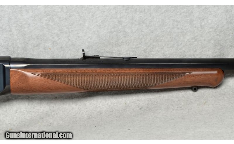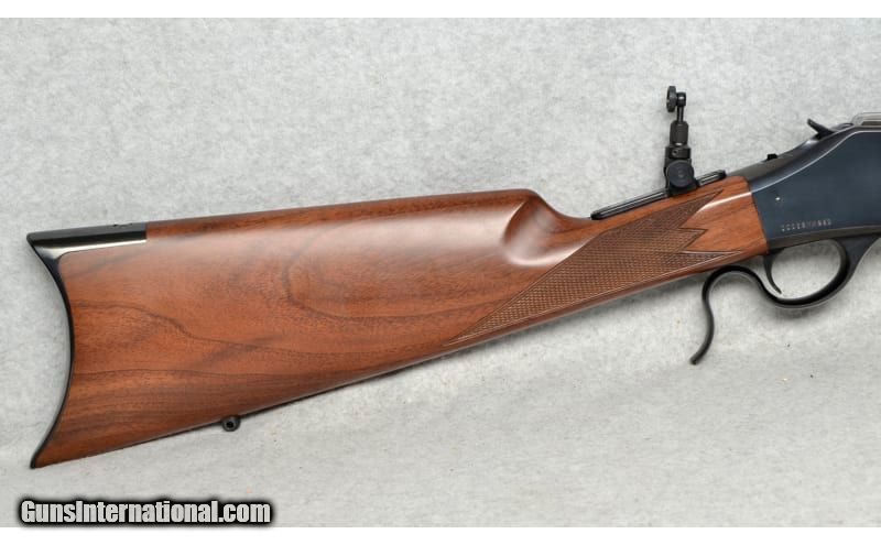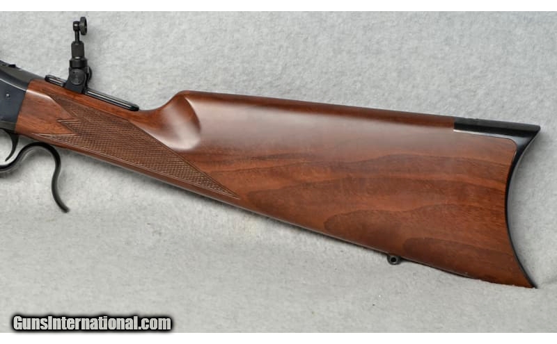 Description: A great big bore Winchester High Wall Reproduction. Chambered in .405 Winchester this rifle is capable of taking any of the large North American Game animals or will serve as a unique range piece with its large chambering and peep sights. .405 Winchester SOLD Chambers: .405 Winchester Metal Condition: "Excellent, minor scratches on left side of receiver above the trigger. Wood Condition: "Excellent, minor handling marks Bore Condition: "Excellent, the bore is bright and shiny. Barrels: 28" Octagonal Triggers: Single trigger Butt Pad: Crescent steel buttplate Weight: 8 lb - 11 oz Sights: "Rear folding tang sight, semi-buckhorn barrel sight, gold bead front sight. Item Location: Cheektowaga, NY  |