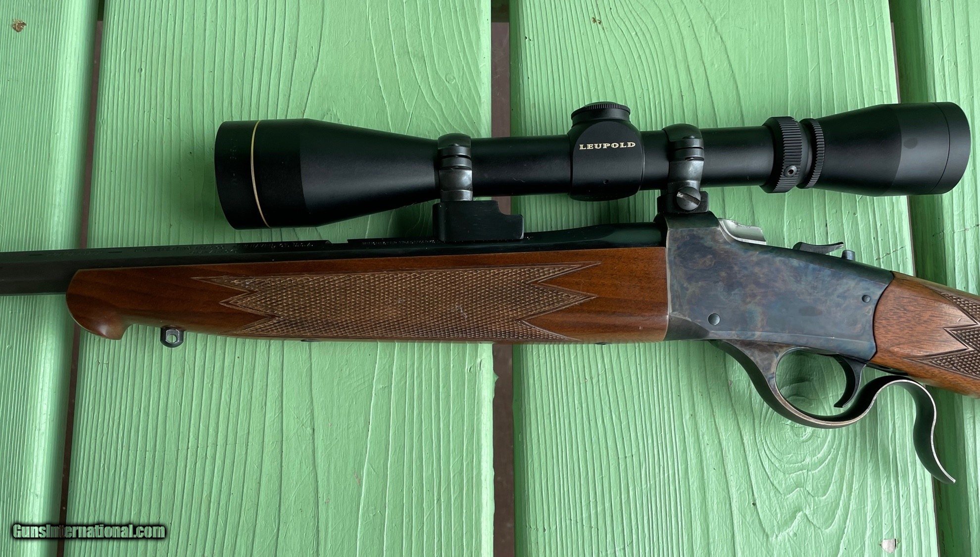 Description: This is an excellent condition single shot Winchester 1885 .17HMR made by Miroku. This rifle is at least the quality build as the original 1885. The barrel is 24" and full octagon. Very lustrous blued barrel and case colored action, lever, and butt plate. This model has the metal, curved butt plate. The rifle has been shot very little, less than a box of ammo. The metal is without blemish. There are two very tiny (less than half grain of rice) safe dings on butt stock. Schanauble forend. Sling studs installed at the factory. The rifle is 100% original. I'm including the scope bases and rings, but not the scope. SOLD Rifle Caliber: .17 HMR Manufacturer: Winchester Model: 1885 Barrel Length: 24 Condition: Excellent Metal Condition: 100 Wood Condition: 99 Bore Condition: 100 Barrel Type: Octabon Action: Falling block Stock: Walnut LOP: 13.5 Finish: Blue/Case Colored Sights: Fixed w/Scope Mount  |