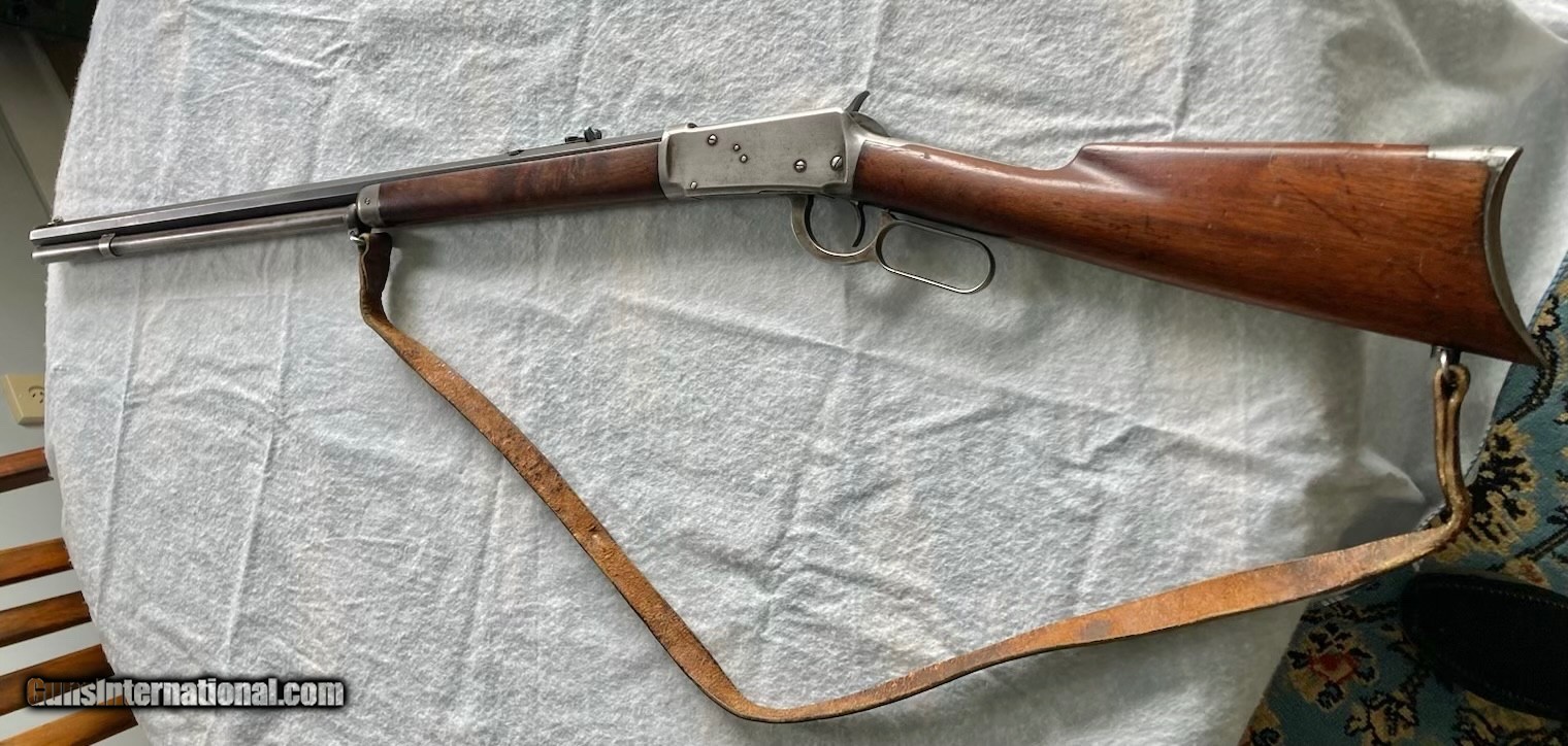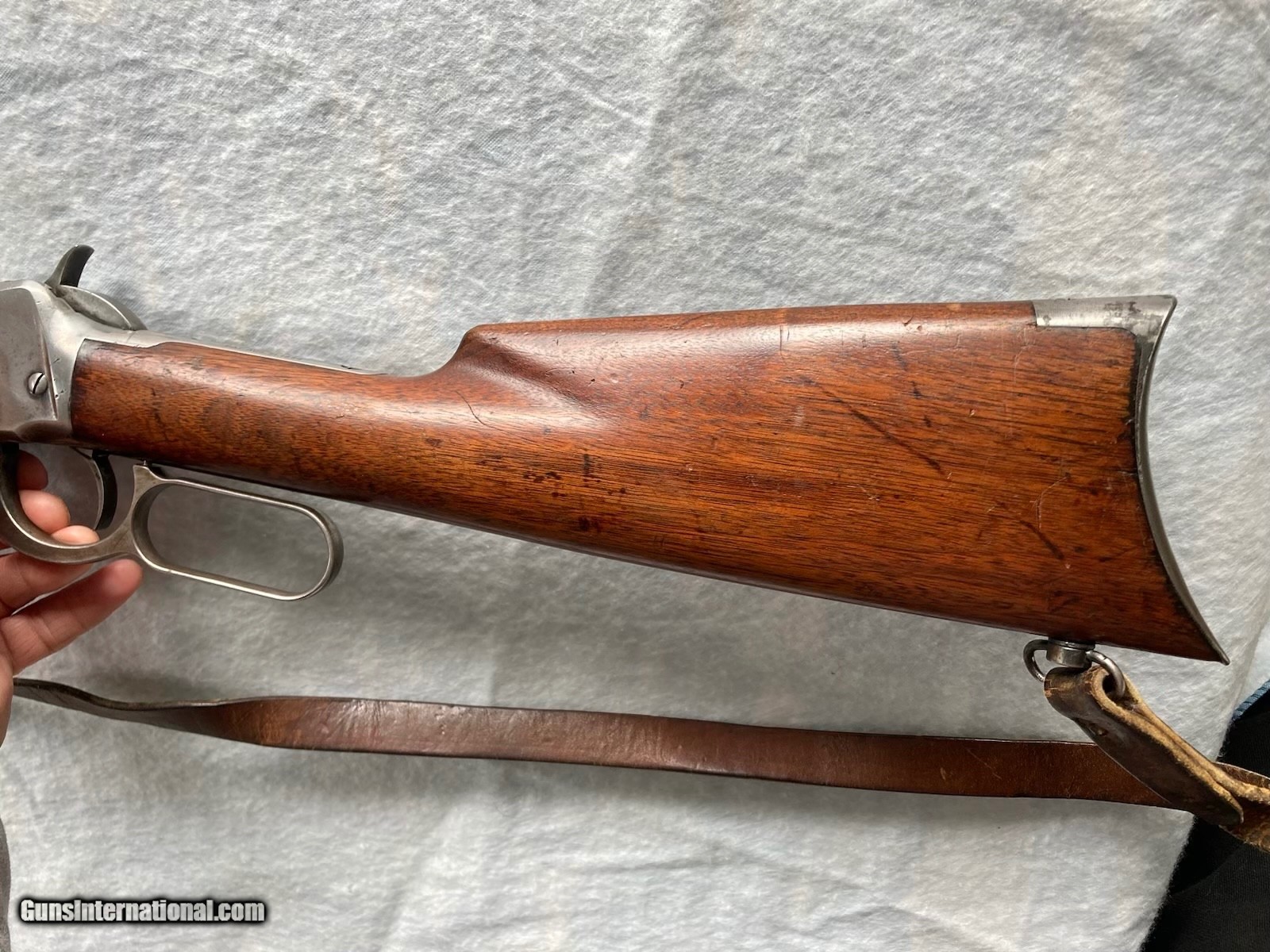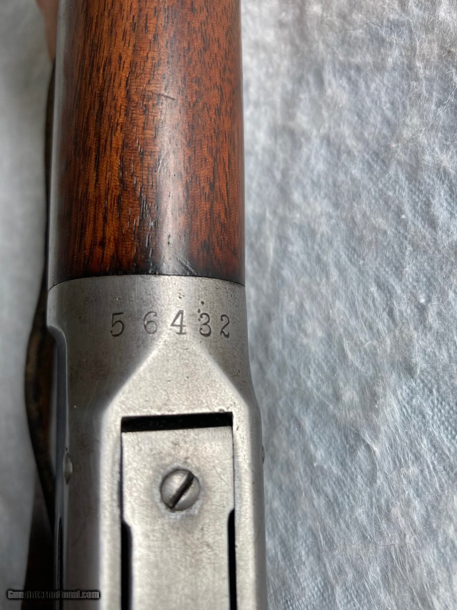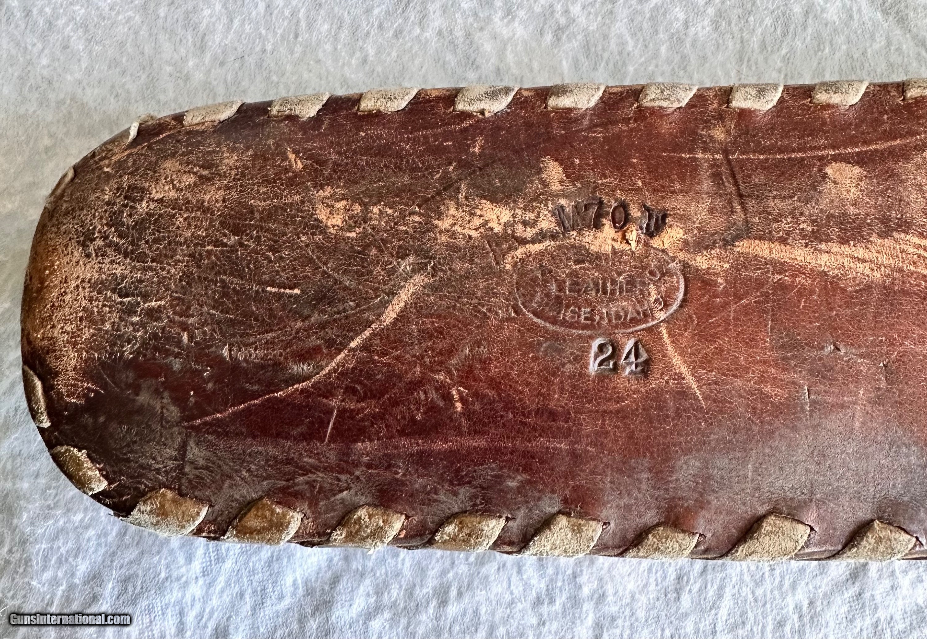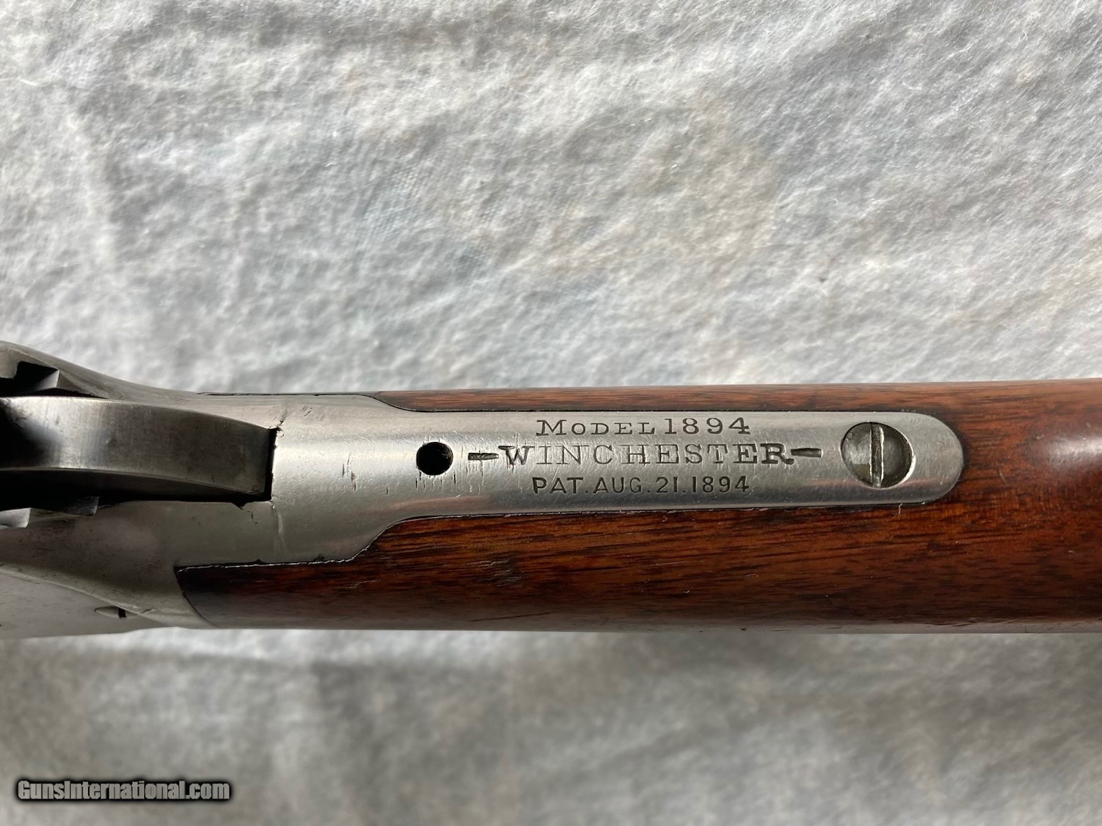Description: Winchester model 1894 30-30, manufactured in 1896. This rifle is in very good condition. The trigger and lever action are tight with no slop . It has the original sights with semi-buckhorn rear sight. There is some marring on the wood, but the finish is the factory finish. It has the factory 26-inch barrel, in excellent condition. This rifle is all original, except for the added leather sling strap. It comes with the leather scabbard. SOLD Antique: Yes Rifle Caliber: .30-30 Winchester Manufacturer: Winchester Model: 1894 Serial Number: 56432 Barrel Length: 26 Bore: 30/100 Condition: very good Metal Condition: excellent Wood Condition: good Bore Condition: excellent Barrel Type: octagon Action: lever Stock: wood Stock Heel: metal Weight: 11lb. 6oz. Sights: semi buckhorn Manufacture Date: 1896 Item Location: Washington |